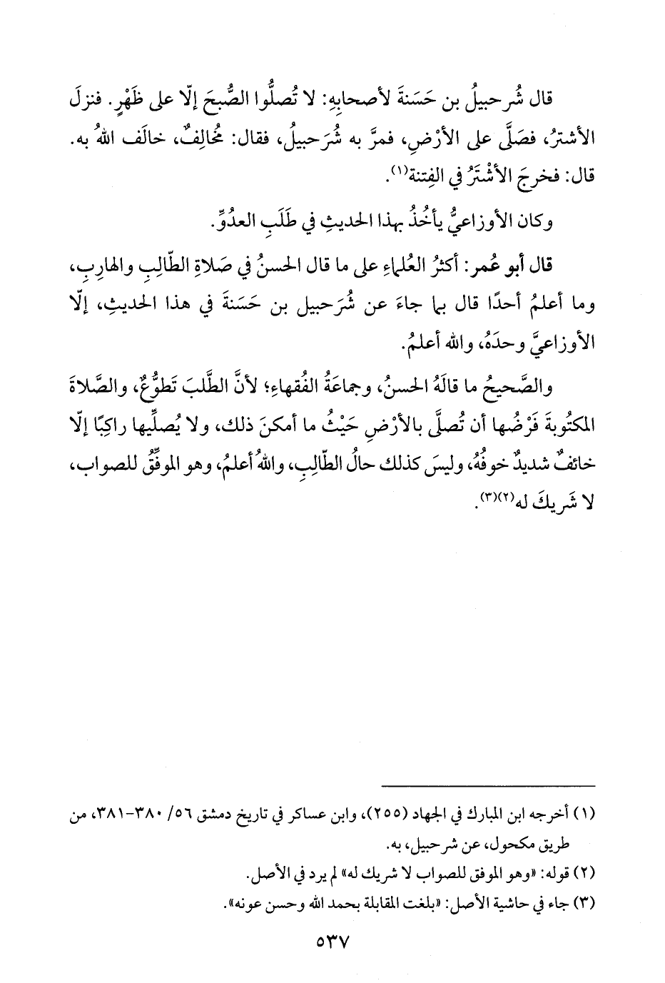 قال أبو عُمر: أكثرُ العُلماءِ على ما قال الحسنُ في صَلاةِ الطّالِبِ والهارِبِ، وما أعلمُ أحدًا قال بما جاءَ عن شُرَحبيل بن حَسَنةَ في هذا الحديثِ، إلّا الأوزاعيَّ وحدَهُ والله أعلمُ.