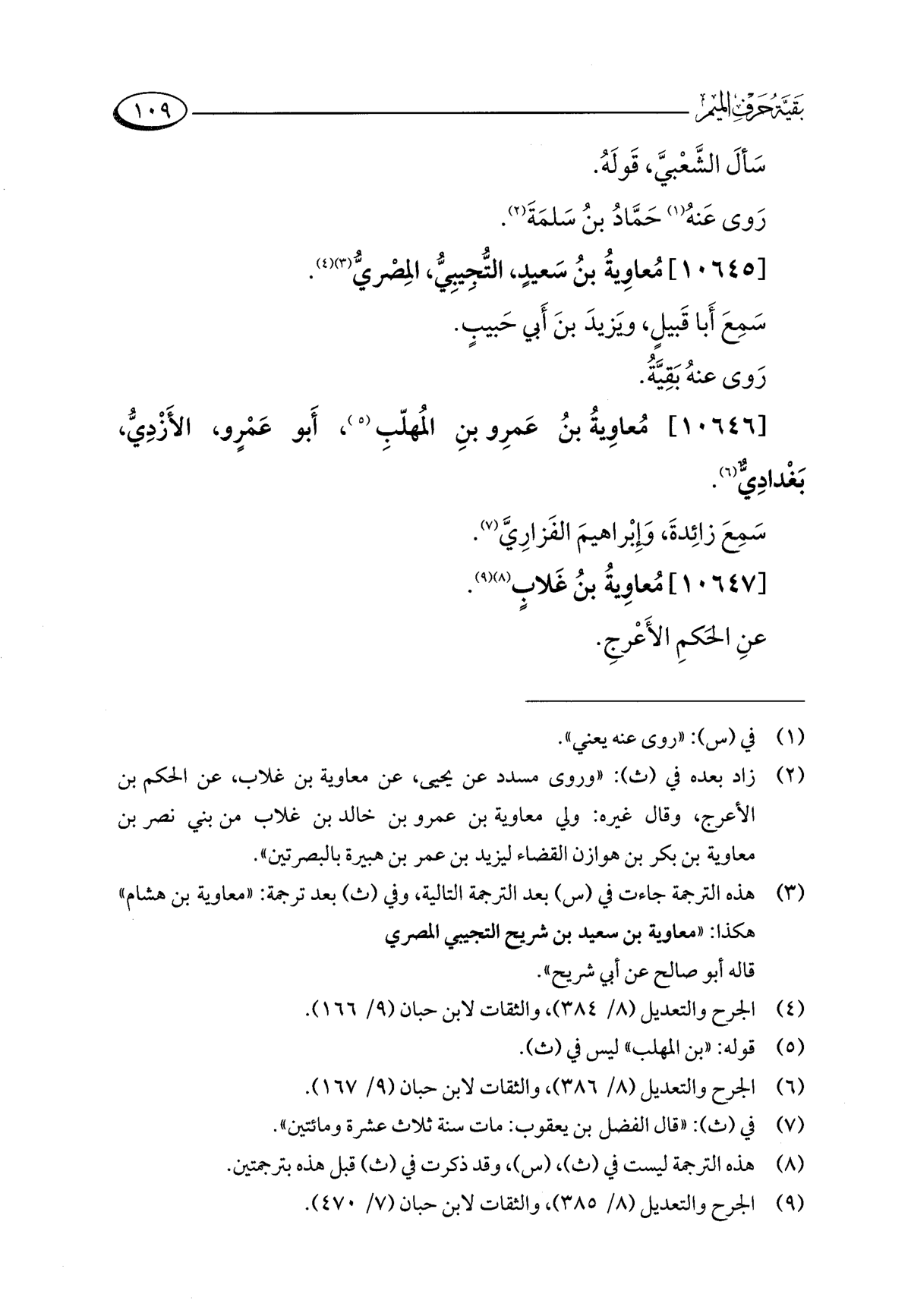 (¬٣) هذه الترجمة جاءت في (س) بعد الترجمة التالية، وفي (ث) بعد ترجمة: "معاوية بن هشام" هكذا: "معاوية بن سعيد بن شريح التجيبي المصري