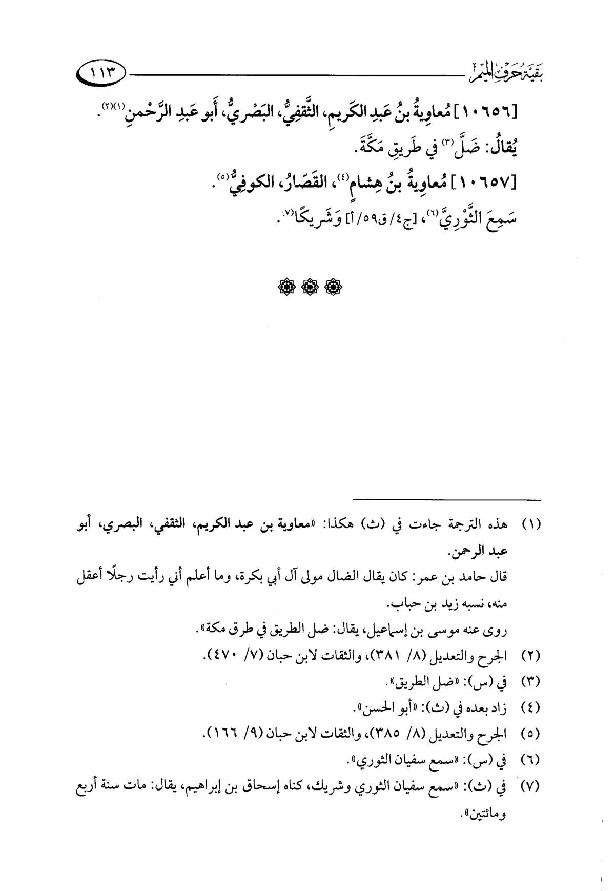 (¬١) هذه الترجمة جاءت في (ث) هكذا: "معاوية بن عبد الكريم، الثقفي، البصري، أبو عبد الرحمن.