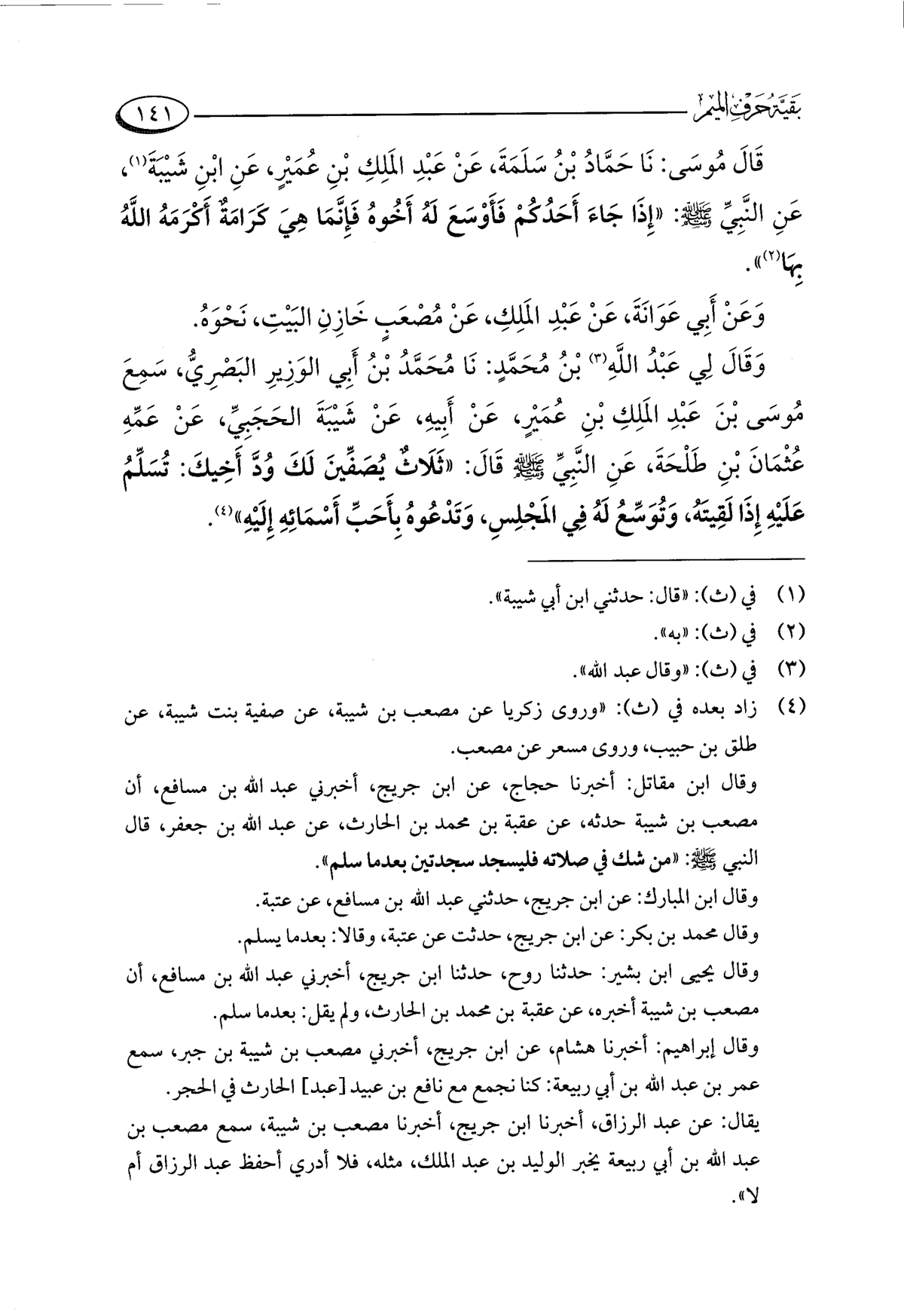 وَقَالَ لِي عَبْدُ اللَّهِ (¬٣) بْنُ مُحَمَّدٍ: نَا مُحَمَّدُ بْنُ أَبِي الوَزِيرِ البَصْرِيُّ، سَمِعَ مُوسَى بْنَ عَبْدِ المَلِكِ بْنِ عُمَيْرٍ، عَنْ أَبِيهِ، عَنْ شَيْبَةَ الحَجَبِيِّ، عَنْ عَمِّهِ عُثْمَانَ بْنِ طَلْحَةَ، عَنِ النَّبِيِّ -صلى اللَّه عليه وسلم- قَالَ: "ثَلَاثٌ يُصَفِّينَ لَكَ وُدَّ أَخِيكَ: تُسَلِّمُ عَلَيْهِ إِذَا لَقِيتهُ، وَتُوَسِّعُ لَهُ فِي المَجْلِسِ، وَتَدْعُوهُ بِأَحَبِّ أَسْمَائِهِ إِلَيْهِ" (¬٤).
