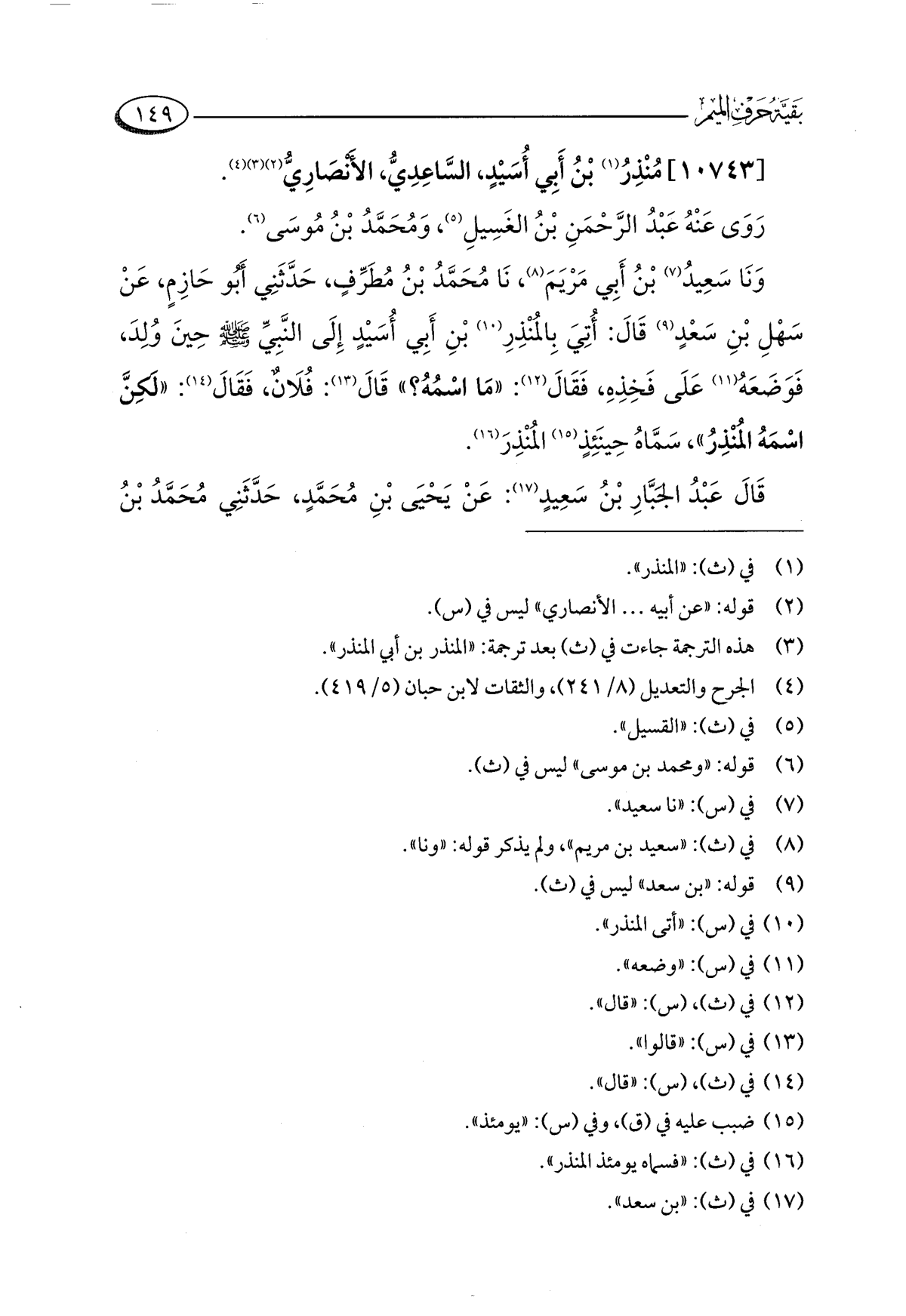 [١٠٧٤٣] مُنْذِرُ (¬١) بْنُ أَبِي أُسَيْدٍ، السَّاعِدِيُّ، الأنْصَارِيُّ (¬٢) (¬٣) (¬٤).