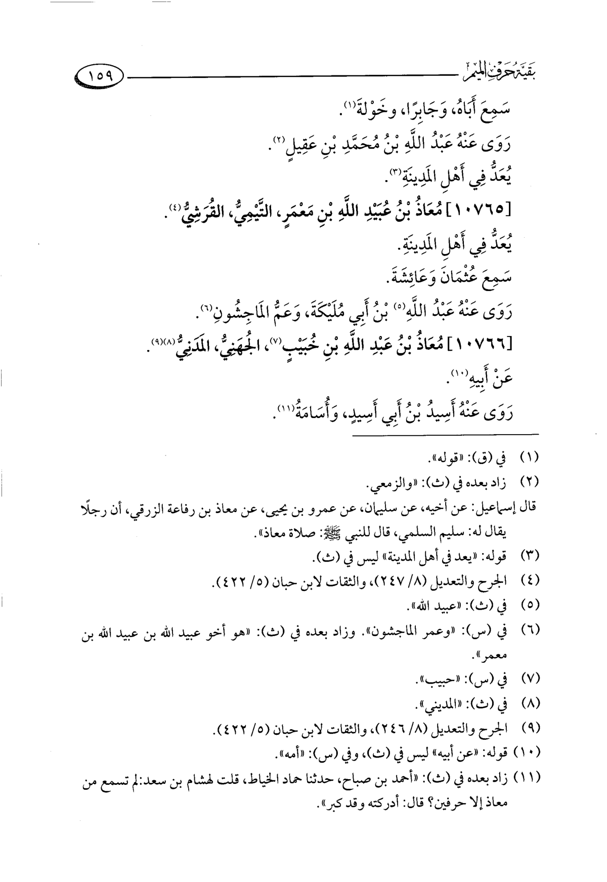 (¬١١) زاد بعده في (ث): "أحمد بن صباح، حدثنا حماد الخياط، قلت لهشام بن سعد: لم تسمع من معاذ إلا حرفين؟ قال: أدركته وقد كبر".