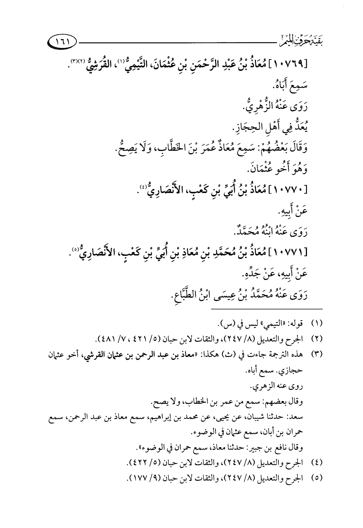 (¬٣) هذه الترجمة جاءت في (ث) هكذا: "معاذ بن عبد الرحمن بن عثمان القرشي، أخو عثمان حجازي. سمع أباه.