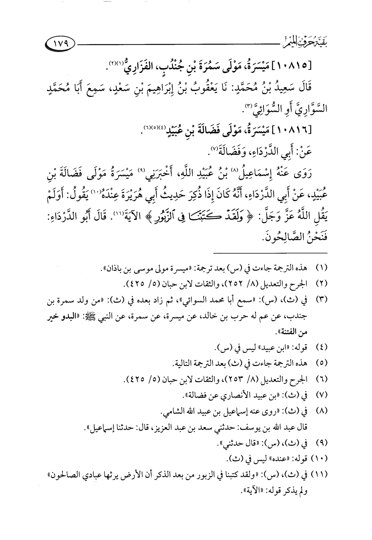 رَوَى عَنْهُ إِسْمَاعِيلُ (¬٨) بْنُ عُبَيْدِ اللَّهِ، أَخْبَرَنِي (¬٩) مَيْسَرَةُ مَوْلَى فَضَالَةَ بْنِ عُبَيْدٍ، عَنْ أَبِي الدَّرْدَاءِ، أنَّهُ كَانَ إِذَا ذُكِرَ حَدِيثُ أَبِي هُرَيْرَةَ عِنْدَهُ (¬١٠) يَقُولُ: أَوَلَمْ يَقُلِ اللَّهُ عَزَّ وَجَلَّ: {وَلَقَدْ كَتَبْنَا فِي الزَّبُورِ} الآيَةَ (¬١١). قَالَ أَبُو الدَّرْدَاءِ: فَنَحْنُ الصَّالِحُونَ.