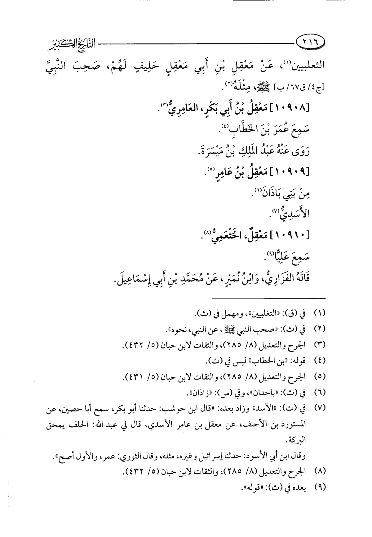 (¬٨) الجرح والتعديل (٨/ ٢٨٥)، والثقات لابن حبان (٥/ ٤٣٢).