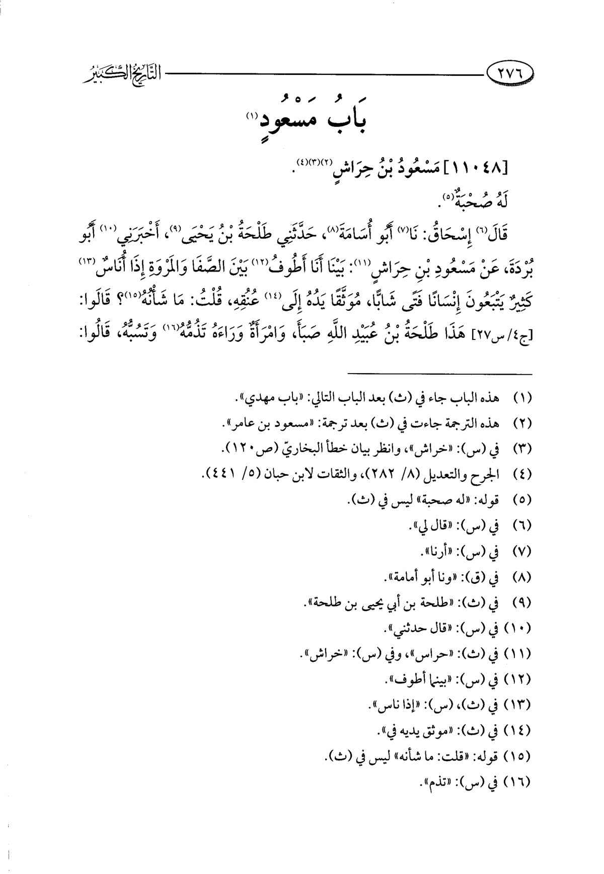 قَالَ (¬٦) إِسْحَاقُ: نَا (¬٧) أَبُو أُسَامَةَ (¬٨)، حدَّثني طَلْحَةُ بْنُ يحيى (¬٩)، أَخْبَرَنِي (¬١٠) أَبُو بُرْدَةَ، عَنْ مَسْعُودِ بْنِ حِرَاشٍ (¬١١): بَيْنَا أَنَا أَطُوفُ (¬١٢) بَيْنَ الصَّفَا وَالمَرْوَةِ إِذَا أُنَاسٌ (¬١٣) كَثِيرٌ يَتْبَعُونَ إِنْسَانًا فَتًى شَابًّا، مُوَثَّقًا يَدُهُ إِلَى (¬١٤) عُنُقِهِ، قُلْتُ: مَا شَأْنُهُ (¬١٥)؟ قَالَوا: هَذَا طَلْحَةُ بْنُ عُبَيْدِ اللَّهِ صَبَأَ، وَامْرَأَةٌ وَرَاءَهُ تَذُمُّهُ (¬١٦) وَتَسُبُّهُ، قَالُوا: