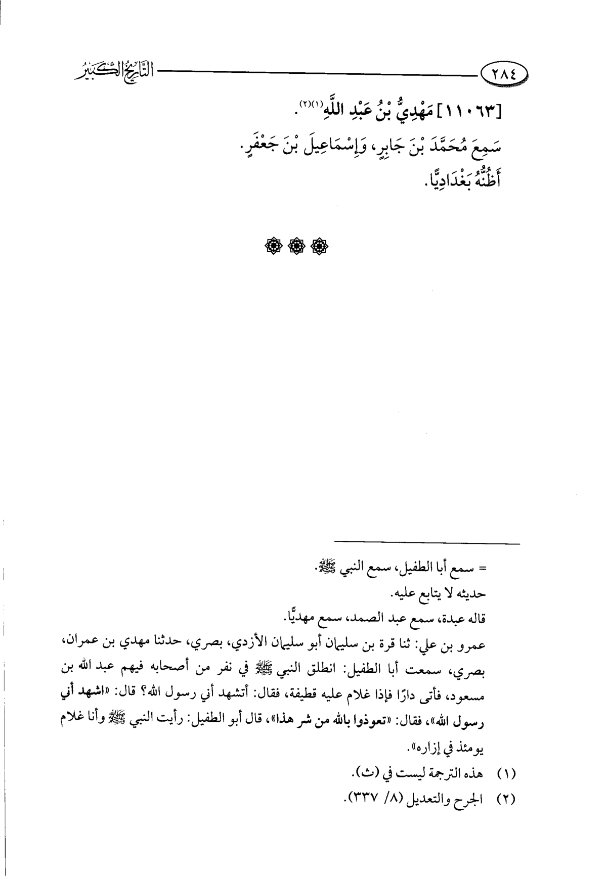 عمرو بن علي: ثنا قرة بن سليمان أبو سليمان الأزدي، بصري، حدثنا مهدي بن عمران، بصري، سمعت أبا الطفيل: انطلق النبي -صلى اللَّه عليه وسلم- في نفر من أصحابه فيهم عبد اللَّه بن مسعود، فأتى دارًا فإذا غلام عليه قطيفة، فقال: أتشهد أني رسول اللَّه؟ قال: "اشهد أني رسول اللَّه"، فقال: "تعوذوا باللَّه من شر هذا"، قال أبو الطفيل: رأيت النبي -صلى اللَّه عليه وسلم- وأنا غلام يومئذ في إزاره".