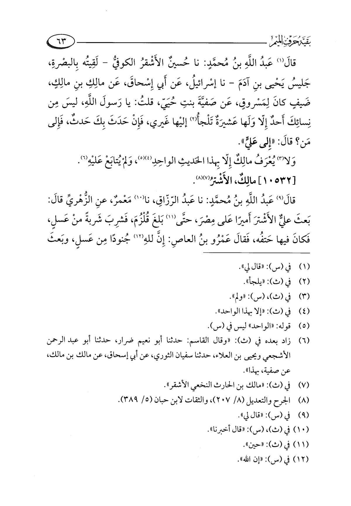 (¬٦) زاد بعده في (ث): "وقال القاسم: حدثنا أبو نعيم ضرار، حدثنا أبو عبد الرحمن الأشجعي ويحيى بن العلاء، حدثنا سفيان الثوري، عن أبي إسحاق، عن مالك بن مالك، عن صفية، بهذا".