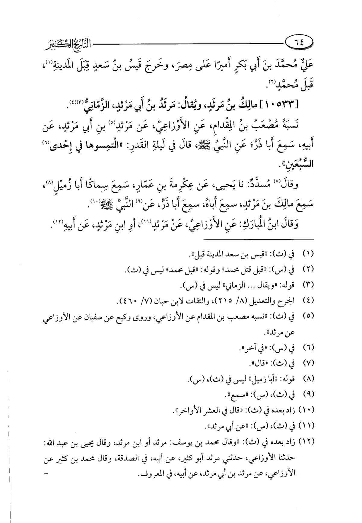 (¬١٢) زاد بعده في (ث): "وقال محمد بن يوسف: مرثد أو ابن مرثد، وقال يحيى بن عبد اللَّه: حدَّثنا الأوزاعي، حدثني مرثد أبو كثير، عن أبيه، في الصدقة، وقال محمد بن كثير عن الأوزاعي، عن مرثد بن أبي مرثد، عن أبيه، في المعروف. =