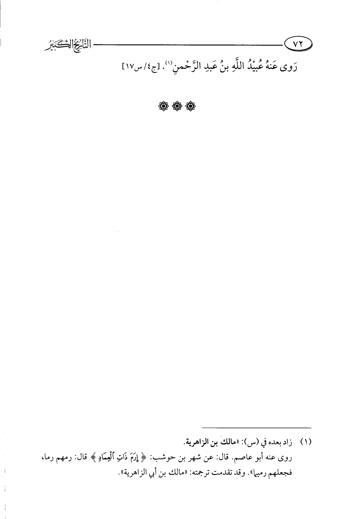 روى عنه أبو عاصم. قال: عن شهر بن حوشب: {إِرَمَ ذَاتِ الْعِمَادِ} قال: رمهم رما، فجعلهم رميما". وقد تقدمت ترجمته: "مالك بن أبي الزاهرية".