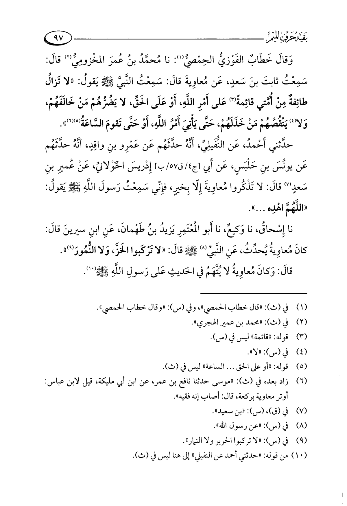 وَقالَ خَطّابٌ الفَوْزيُّ الحِمْصيُّ (¬١): نا مُحمَّدُ بنُ عُمرَ المخْزومِيُّ (¬٢) قالَ: سَمِعْتُ ثابتَ بنَ سَعدٍ، عَن مُعاوِيةَ قالَ: سَمِعْتُ النَّبيَّ -صلى اللَّه عليه وسلم- يَقولُ: "لا تَزالُ طائِفةٌ مِنْ أُمَّتي قائِمةً (¬٣) عَلى أَمْرِ اللَّهِ، أو عَلَى الحَقِّ، لا يَضُرُّهُمْ مَنْ خَالَفَهُمْ، وَلا (¬٤) يَنْقُصُهُمْ مَنْ خَذَلَهُمْ، حَتَّى يَأْتِيَ أَمْرُ اللَّهِ، أو حَتَّى تَقومَ السَّاعَةُ (¬٥) (¬٦) ".
