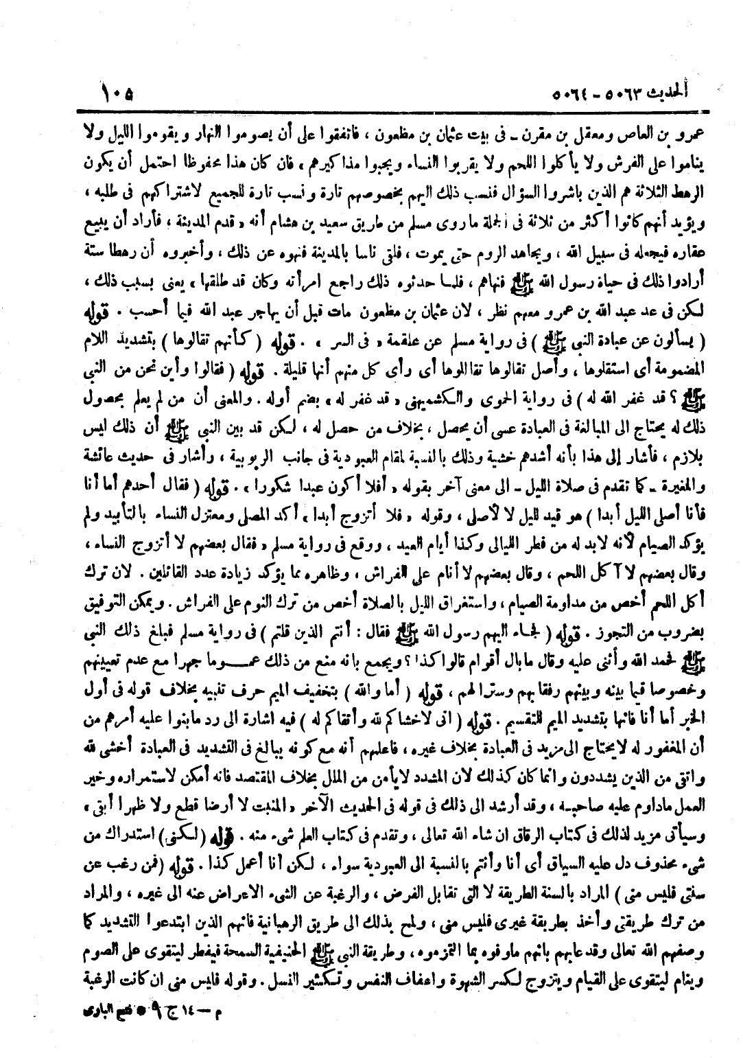عَمْرِو بْنِ الْعَاصِ وَمَعْقِلُ بْنُ مُقَرِّنٍ فِي بَيْتِ عُثْمَانَ بْنِ مَظْعُونٍ فَاتَّفَقُوا عَلَى أَنْ يَصُومُوا النَّهَارَ وَيَقُومُوا اللَّيْلَ وَلَا يَنَامُوا عَلَى الْفُرُشِ وَلَا يَأْكُلُوا اللَّحْمَ وَلَا يَقْرَبُوا النِّسَاءَ وَيَجُبُّوا مَذَاكِيرَهُمْ فَإِنْ كَانَ هَذَا مَحْفُوظًا احْتَمَلَ أَنْ يَكُونَ الرَّهْطُ الثَّلَاثَةُ هُمُ الَّذِينَ بَاشَرُوا السُّؤَالَ فَنُسِبَ ذَلِكَ إِلَيْهِمْ بِخُصُوصِهِمْ تَارَةً وَنُسِبَ تَارَةً لِلْجَمِيعِ لِاشْتِرَاكِهِمْ فِي طَلَبِهِ وَيُؤَيِّدُ أَنَّهُمْ كَانُوا أَكْثَرَ مِنْ ثَلَاثَةٍ فِي الْجُمْلَةِ مَا رَوَى مُسْلِمٌ مِنْ طَرِيقِ سَعِيدِ بْنِ هِشَامٍ أَنَّهُ قَدِمَ الْمَدِينَةَ فَأَرَادَ أَنْ يَبِيعَ عَقَارَهُ فَيَجْعَلَهُ فِي سَبِيلِ اللَّهِ وَيُجَاهِدَ الرُّومَ حَتَّى يَمُوتَ فَلَقِيَ نَاسًا بِالْمَدِينَةِ فَنَهَوْهُ عَنْ ذَلِكَ وَأَخْبَرُوهُ أَنَّ رَهْطًا سِتَّةً أَرَادُوا ذَلِكَ فِي حَيَاةِ رَسُولِ اللَّهِ صَلَّى اللَّهُ عَلَيْهِ وَسَلَّمَ فَنَهَاهُمْ فَلَمَّا حَدَّثُوهُ ذَلِكَ رَاجَعَ امْرَأَتَهُ وَكَانَ قَدْ طَلَّقَهَا يَعْنِي بِسَبَبِ ذَلِكَ لَكِنْ فِي عَدِّ عَبْدِ اللَّهِ بْنِ عَمْرٍو مَعَهُمْ نَظَرٌ لِأَنَّ عُثْمَانَ بْنَ مَظْعُونٍ مَاتَ قَبْلَ أَنْ يُهَاجِرَ عَبْدُ اللَّهِ فِيمَا أَحْسَبُ قَوْلُهُ يَسْأَلُونَ عَنْ عِبَادَةِ النَّبِيِّ صَلَّى اللَّهُ عَلَيْهِ وَسَلَّمَ فِي رِوَايَةِ مُسْلِمٍ عَنْ عَلْقَمَةَ فِي السِّرِّ قَوْلُهُ كَأَنَّهُمْ تَقَالُّوهَا بِتَشْدِيدِ اللَّامِ الْمَضْمُومَةِ أَيِ اسْتَقَلُّوهَا وَأَصْلُ تَقَالُّوهَا تَقَالَلُوهَا أَيْ رَأَى كُلٌّ مِنْهُمْ أَنَّهَا قَلِيلَةٌ قَوْلُهُ فَقَالُوا وَأَيْنَ نَحْنُ مِنَ النَّبِيِّ صَلَّى اللَّهُ عَلَيْهِ وَسَلَّمَ قَدْ غَفَرَ اللَّهُ لَهُ فِي رِوَايَةِ الْحَمَوِيِّ وَالْكُشْمِيهَنِيِّ قَدْ غُفِرَ لَهُ بِضَمِّ أَوَّلِهِ وَالْمَعْنَى أَنَّ مَنْ لَمْ يَعْلَمْ بِحُصُولِ ذَلِكَ لَهُ يُحْتَاجُ إِلَى الْمُبَالَغَةِ فِي الْعِبَادَةِ عَسَى أَنْ يَحْصُلَ بِخِلَافِ مَنْ حَصَلَ لَهُ لَكِنْ قَدْ بَيَّنَ النَّبِيُّ صَلَّى اللَّهُ عَلَيْهِ وَسَلَّمَ أَنَّ ذَلِكَ لَيْسَ بِلَازِمٍ فَأَشَارَ إِلَى هَذَا بِأَنَّهُ أَشَدُّهُمْ خَشْيَةً وَذَلِكَ بِالنِّسْبَةِ لِمَقَامِ الْعُبُودِيَّةِ فِي جَانِبِ الرُّبُوبِيَّةِ وَأَشَارَ فِي حَدِيثِ عَائِشَةَ وَالْمُغِيرَةِ كَمَا تَقَدَّمَ فِي صَلَاةِ اللَّيْلِ إِلَى مَعْنًى آخَرَ بِقَوْلِهِ أَفَلَا أَكُونُ عَبْدًا شَكُورًا قَوْلُهُ فَقَالَ أَحَدُهُمْ أَمَّا أَنَا فَأَنَا أُصَلِّي اللَّيْلَ أَبَدًا هُوَ قيد لِليْل لَا لأصلي وَقَوله فَلَا أَتَزَوَّجُ أَبَدًا أَكَّدَ الْمُصَلِّي وَمُعْتَزِلَ النِّسَاءِ بِالتَّأْبِيدِ وَلَمْ يُؤَكِّدِ الصِّيَامَ لِأَنَّهُ لَا بُدَّ لَهُ مِنْ فِطْرِ اللَّيَالِي وَكَذَا أَيَّامُ الْعِيدِ وَوَقَعَ فِي رِوَايَةِ مُسْلِمٍ فَقَالَ بَعْضُهُمْ لَا أَتَزَوَّجُ النِّسَاءَ وَقَالَ بَعْضُهُمْ لَا آكُلُ اللَّحْمَ وَقَالَ بَعْضُهُمْ لَا أَنَامُ عَلَى الْفِرَاشِ وَظَاهِرُهُ مِمَّا يُؤَكِّدُ زِيَادَةَ عَدَدِ الْقَائِلِينَ لِأَنَّ تَرْكَ أَكْلِ اللَّحْمِ أَخَصُّ مِنْ مُدَاوَمَةِ الصِّيَامِ وَاسْتِغْرَاقَ اللَّيْلِ بِالصَّلَاةِ أَخَصُّ مِنْ تَرْكِ النَّوْمِ عَلَى الْفِرَاشِ وَيُمْكِنُ التَّوْفِيقُ بِضُرُوبٍ مِنَ التَّجَوُّزِ قَوْلُهُ فَجَاءَ إِلَيْهِمْ رَسُولِ اللَّهِ صَلَّى اللَّهُ عَلَيْهِ وَسَلَّمَ فَقَالَ أَنْتُمُ الَّذِينَ قُلْتُمْ فِي رِوَايَةِ مُسْلِمٍ فَبَلَغَ ذَلِكَ النَّبِيَّ صَلَّى اللَّهُ عَلَيْهِ وَسَلَّمَ فَحَمِدَ اللَّهَ وَأَثْنَى عَلَيْهِ وَقَالَ مَا بَالُ أَقْوَامٍ قَال