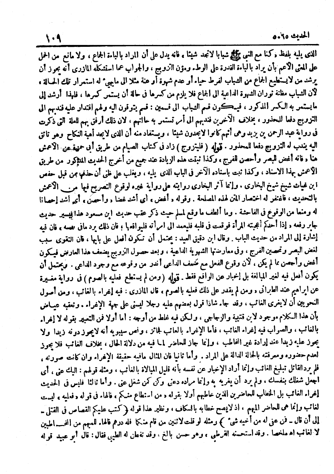الَّذِي يَلِيهِ بِلَفْظِ كُنَّا مَعَ النَّبِيِّ صَلَّى اللَّهُ عَلَيْهِ وَسَلَّمَ شَبَابًا لَا نَجِدُ شَيْئًا فَإِنَّهُ يَدُلُّ عَلَى أَنَّ الْمُرَادَ بِالْبَاءَةِ الْجِمَاعُ وَلَا مَانِعَ مِنَ الْحَمْلِ عَلَى الْمَعْنَى الْأَعَمِّ بِأَنْ يُرَادَ بِالْبَاءَةِ الْقُدْرَةُ عَلَى الْوَطْءِ وَمُؤَنِ التَّزْوِيجِ وَالْجَوَابُ عَمَّا اسْتَشْكَلَهُ الْمَازِرِيُّ أَنَّهُ يَجُوزُ أَنْ يُرْشِدَ مَنْ لَا يَسْتَطِيعُ الْجِمَاعَ مِنَ الشَّبَابِ لِفَرْطِ حَيَاءٍ أَوْ عَدَمِ شَهْوَةٍ أَوْ عَنهُ مثلا إِلَى مَا يهيء لَهُ اسْتِمْرَارِ تِلْكَ الْحَالَةِ لِأَنَّ الشَّبَابَ مَظِنَّةُ ثَوَرَانِ الشَّهْوَةِ الدَّاعِيَةِ إِلَى الْجِمَاعِ فَلَا يَلْزَمُ مِنْ كَسْرِهَا فِي حَالَةِ أَنْ يَسْتَمِرَّ كَسْرُهَا فَلِهَذَا أَرْشَدَ إِلَى مَا يَسْتَمِرُّ بِهِ الْكَسْرُ الْمَذْكُورُ فَيَكُونُ قَسَمَ الشَّبَابَ إِلَى قِسْمَيْنِ قِسْمٌ يَتُوقُونَ إِلَيْهِ وَلَهُمُ اقْتِدَارٌ عَلَيْهِ فَنَدَبَهُمْ إِلَى التَّزْوِيجِ دَفْعًا لِلْمَحْذُورِ بِخِلَافِ الْآخَرِينَ فَنَدَبَهُمْ إِلَى أَمْرٍ تَسْتَمِرُّ بِهِ حَالَتُهُمْ لِأَنَّ ذَلِكَ أَرْفَقُ بِهِمْ لِلْعِلَّةِ الَّتِي ذُكِرَتْ فِي رِوَايَةِ عَبْدِ الرَّحْمَنِ بْنِ يَزِيدَ وَهِيَ أَنَّهُمْ كَانُوا لَا يَجِدُونَ شَيْئًا وَيُسْتَفَادُ مِنْهُ أَنَّ الَّذِي لَا يَجِدُ أُهْبَةَ النِّكَاحِ وَهُوَ تَائِقٌ إِلَيْهِ يُنْدَبُ لَهُ التَّزْوِيجُ دَفْعًا لِلْمَحْذُورِ قَوْلُهُ فَلْيَتَزَوَّجْ زَادَ فِي كِتَابِ الصِّيَامِ مِنْ طَرِيقِ أَبِي حَمْزَةَ عَنِ الْأَعْمَشِ هُنَا فَإِنَّهُ أَغَضُّ لِلْبَصَرِ وَأَحْصَنُ لِلْفَرْجِ وَكَذَا ثَبَتَتْ هَذِهِ الزِّيَادَةُ عِنْدَ جَمِيعِ مَنْ أَخْرَجَ الْحَدِيثَ الْمَذْكُورَ مِنْ طَرِيقِ الْأَعْمَشِ بِهَذَا الْإِسْنَادِ وَكَذَا ثَبَتَ بِإِسْنَادِهِ الْآخَرِ فِي الْبَابِ الَّذِي يَلِيهِ وَيَغْلِبُ عَلَى ظَنِّي أَنَّ حَذْفَهَا مِنْ قِبَلِ حَفْصِ بْنِ غِيَاثٍ شَيْخِ شَيْخِ الْبُخَارِيِّ وَإِنَّمَا آثَرَ الْبُخَارِيُّ رِوَايَتَهُ عَلَى رِوَايَةِ غَيْرِهِ لِوُقُوعِ التَّصْرِيحِ فِيهَا مِنَ الْأَعْمَشِ بِالتَّحْدِيثِ فَاغْتُفِرَ لَهُ اخْتِصَارُ الْمَتْنِ لِهَذِهِ الْمَصْلَحَةِ وَقَوْلُهُ أَغَضُّ أَيْ أَشَدُّ غَضًّا وَأَحْصَنُ أَيْ أَشَدُّ إِحْصَانًا لَهُ وَمَنْعًا مِنَ الْوُقُوعِ فِي الْفَاحِشَةِ وَمَا أَلْطَفَ مَا وَقَعَ لِمُسْلِمٍ حَيْثُ ذكر عقب حَدِيث بن مَسْعُودٍ هَذَا بِيَسِيرِ حَدِيثِ جَابِرٍ رَفَعَهُ إِذَا أَحَدُكُمْ أَعْجَبَتْهُ الْمَرْأَةُ فَوَقَعَتْ فِي قَلْبِهِ فَلْيَعْمِدْ إِلَى امْرَأَتِهِ فَلْيُوَاقِعْهَا فَإِنَّ ذَلِكَ يَرُدُّ مَا فِي نَفْسِهِ فَإِنَّ فِيهِ إِشَارَةً إِلَى الْمُرَادِ من حَدِيث الْبَاب وَقَالَ بن دَقِيقِ الْعِيدِ يَحْتَمِلُ أَنْ تَكُونَ أَفْعَلُ عَلَى بَابِهَا فَإِنَّ التَّقْوَى سَبَبٌ لِغَضِّ الْبَصَرِ وَتَحْصِينِ الْفَرْجِ وَفِي مُعَارَضَتِهَا الشَّهَوِيَّةِ الدَّاعِيَةِ وَبَعْدَ حُصُولِ التَّزْوِيجِ يَضْعُفُ هَذَا الْعَارِضُ فَيَكُونُ أَغَضَّ وَأَحْصَنَ مِمَّا لَمْ يَكُنْ لِأَنَّ وُقُوعَ الْفِعْلِ مَعَ ضَعْفِ الدَّاعِي أَنْدَرُ مِنْ وُقُوعِهِ مِنْ وُجُودِ الدَّاعِي وَيَحْتَمِلُ أَنْ يَكُونَ أَفْعَلُ فِيهِ لِغَيْرِ الْمُبَالَغَةِ بَلْ إِخْبَارٌ عَنِ الْوَاقِعِ فَقَطْ قَوْلُهُ وَمَنْ لَمْ يَسْتَطِعْ فَعَلَيْهِ بِالصَّوْمِ فِي رِوَايَةِ مُغِيرَةَ عَنْ إِبْرَاهِيمَ عِنْدَ الطَّبَرَانِيِّ وَمَنْ لَمْ يَقْدِرْ عَلَى ذَلِكَ فَعَلَيْهِ بِالصَّوْمِ قَالَ الْمَازِرِيُّ فِيهِ إِغْرَاءٌ بِالْغَائِبِ وَمِنْ أُصُولِ النَّحْوِيِّينَ أَنْ لَا يُغْرَى الْغَائِبُ وَقَدْ جَاءَ شَاذًّا قَوْ