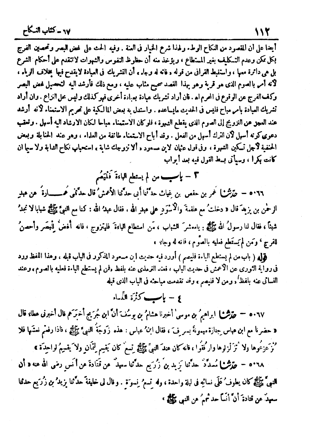 أورد فِيهِ حَدِيث بن مَسْعُودٍ الْمَذْكُورَ فِي الْبَابِ قَبْلَهُ وَهَذَا اللَّفْظُ وَرَدَ فِي رِوَايَةِ الثَّوْرِيِّ عَنِ الْأَعْمَشِ فِي حَدِيثِ الْبَابِ فَعِنْدَ التِّرْمِذِيِّ عَنْهُ بِلَفْظِ فَمَنْ لَمْ يَسْتَطِعِ الْبَاءَةَ فَعَلَيْهِ بِالصَّوْمِ وَعِنْدَ النَّسَائِيِّ عَنْهُ بِلَفْظِ وَمَنْ لَا فَلْيَصُمْ وَقَدْ تَقَدَّمَتْ مَبَاحِثُهُ فِي الْبَابِ الَّذِي قَبْلَهُ قَوْلُهُ بَابُ مَنْ لَمْ يَسْتَطِعِ الْبَاءَةَ فَلْيَصُمْ أورد فِيهِ حَدِيث بن مَسْعُودٍ الْمَذْكُورَ فِي الْبَابِ قَبْلَهُ وَهَذَا اللَّفْظُ وَرَدَ فِي رِوَايَةِ الثَّوْرِيِّ عَنِ الْأَعْمَشِ فِي حَدِيثِ الْبَابِ فَعِنْدَ التِّرْمِذِيِّ عَنْهُ بِلَفْظِ فَمَنْ لَمْ يَسْتَطِعِ الْبَاءَةَ فَعَلَيْهِ بِالصَّوْمِ وَعِنْدَ النَّسَائِيِّ عَنْهُ بِلَفْظِ وَمَنْ لَا فَلْيَصُمْ وَقَدْ تَقَدَّمَتْ مَبَاحِثُهُ فِي الْبَابِ الَّذِي قَبْلَهُ