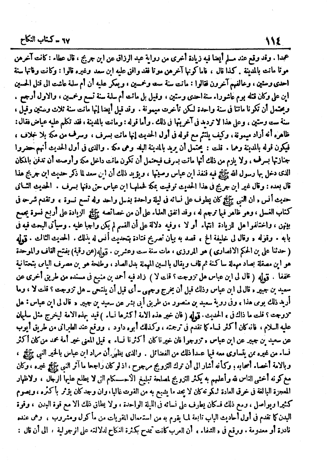 عَمْدًا وَقَدْ وَقَعَ عِنْدَ مُسْلِمٍ أَيْضًا فِيهِ زِيَادَةٌ أُخْرَى مِنْ رِوَايَةِ عَبْدِ الرَّزَّاقِ عَنِ بن جُرَيْجٍ قَالَ عَطَاءٌ وَكَانَتْ آخِرَهُنَّ مَوْتًا مَاتَتْ بِالْمَدِينَةِ كَذَا قَالَ فَأَمَّا كَوْنُهَا آخِرَهُنَّ مَوْتًا فقد وَافق عَلَيْهِ بن سَعْدٍ وَغَيْرُهُ قَالُوا وَكَانَتْ وَفَاتُهَا سَنَةَ إِحْدَى وَسِتِّينَ وَخَالَفَهُمْ آخَرُونَ فَقَالُوا مَاتَتْ سَنَةَ سِتٍّ وَخَمْسِينَ وَيُعَكِّرُ عَلَيْهِ أَنَّ أُمَّ سَلَمَةَ عَاشَتْ إِلَى قَتْلِ الْحُسَيْنِ بْنِ عَلِيٍّ وَكَانَ قَتْلُهُ يَوْمَ عَاشُورَاءَ سَنَةَ إِحْدَى وَسِتِّينَ وَقِيلَ بَلْ مَاتَتْ أُمُّ سَلَمَةَ سَنَةَ تِسْعٍ وَخَمْسِينَ وَالْأَوَّلُ أَرْجَحُ وَيَحْتَمِلُ أَنْ تَكُونَا مَاتَتَا فِي سَنَةٍ وَاحِدَةٍ لَكِنْ تَأَخَّرَتْ مَيْمُونَةُ وَقَدْ قِيلَ أَيْضًا إِنَّهَا مَاتَتْ سَنَةَ ثَلَاثٍ وَسِتِّينَ وَقِيلَ سَنَةَ سِتٍّ وَسِتِّينَ وَعَلَى هَذَا لَا تَرْدِيدَ فِي آخِرِيَّتِهَا فِي ذَلِكَ وَأَمَّا قَوْلُهُ وَمَاتَتْ بِالْمَدِينَةِ فَقَدْ تَكَلَّمَ عَلَيْهِ عِيَاضٌ فَقَالَ ظَاهِرُهُ أَنَّهُ أَرَادَ مَيْمُونَة وَكَيف يَلْتَئِمُ مَعَ قَوْلِهِ فِي أَوَّلِ الْحَدِيثِ إِنَّهَا مَاتَتْ بِسَرِفَ وَسَرِفُ مِنْ مَكَّةَ بِلَا خِلَافٍ فَيَكُونُ قَوْلُهُ بِالْمَدِينَةِ وَهَمًا قُلْتُ يَحْتَمِلُ أَنْ يُرِيدَ بِالْمَدِينَةِ الْبَلَدَ وَهِيَ مَكَّةُ وَالَّذِي فِي أَوَّلِ الْحَدِيثِ أَنَّهُمْ حَضَرُوا جِنَازَتَهَا بِسَرِفَ وَلَا يَلْزَمُ مِنْ ذَلِكَ أَنَّهَا مَاتَتْ بِسَرِفَ فَيَحْتَمِلُ أَنْ تَكُونَ مَاتَتْ دَاخِلَ مَكَّةَ وَأَوْصَتْ أَنْ تُدْفَنَ بِالْمَكَانِ الَّذِي دَخَلَ بِهَا رَسُولِ اللَّهِ صَلَّى اللَّهُ عَلَيْهِ وَسَلَّمَ فِيهِ فنفذ بن عَبَّاس وصيتها وَيُؤَيّد ذَلِك أَن بن سعد لما ذكر حَدِيث بن جريج هَذَا قَالَ بعده وَقَالَ غير بن جُرَيْجٍ فِي هَذَا الْحَدِيثِ تُوُفِّيَتْ بِمَكَّةَ فَحَمَلَهَا بن عَبَّاسٍ حَتَّى دَفَنَهَا بِسَرِفَ الْحَدِيثُ الثَّانِي حَدِيثِ أَنَسٍ أَنَّ النَّبِيَّ صَلَّى اللَّهُ عَلَيْهِ وَسَلَّمَ كَانَ يَطُوفُ عَلَى نِسَائِهِ فِي لَيْلَةٍ وَاحِدَةٍ بِغُسْلٍ وَاحِدٍ وَلَهُ تِسْعُ نِسْوَةٍ وَتَقَدَّمَ شَرْحُهُ فِي كِتَابِ الْغُسْلِ وَهُوَ ظَاهِرٌ فِيمَا تَرْجَمَ لَهُ وَقَدِ اتَّفَقَ الْعُلَمَاءُ عَلَى أَنَّ مِنْ خَصَائِصِهِ صَلَّى اللَّهُ عَلَيْهِ وَسَلَّمَ الزِّيَادَةَ عَلَى أَرْبَعِ نِسْوَةٍ يَجْمَعُ بَيْنَهُنَّ وَاخْتَلَفُوا هَلْ لِلزِّيَادَةِ انْتِهَاءٌ أَوْ لَا وَفِيهِ دَلَالَةٌ عَلَى أَنَّ الْقَسْمَ لَمْ يَكُنْ وَاجِبًا عَلَيْهِ وَسَيَأْتِي الْبَحْثُ فِيهِ فِي بَابِهِ وَقَوْلُهُ