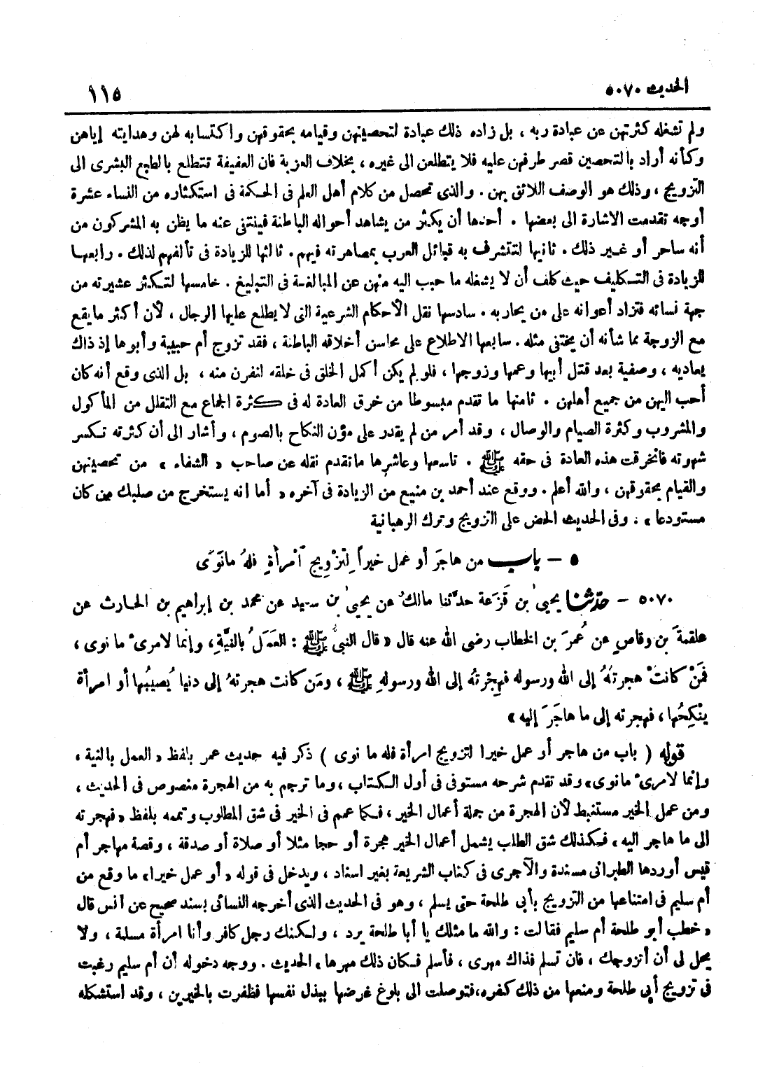 ذَكَرَ فِيهِ حَدِيثَ عُمَرَ بِلَفْظِ الْعَمَلُ بِالنِّيَّةِ وَإِنَّمَا لِامْرِئٍ مَا نَوَى وَقَدْ تَقَدَّمَ شَرْحُهُ مُسْتَوْفًى فِي أَوَّلِ الْكِتَابِ وَمَا تَرْجَمَ بِهِ مِنَ الْهِجْرَةِ مَنْصُوصٌ فِي الْحَدِيثِ وَمَنْ عَمِلَ الْخَيْرَ مُسْتَنْبَطٌ لِأَنَّ الْهِجْرَةَ مِنْ جُمْلَةِ أَعْمَالِ الْخَيْرِ فَكَمَا عَمَّمَ فِي الْخَيْرِ فِي شِقِّ الْمَطْلُوبِ وَتَمَّمَهُ بِلَفْظِ فَهِجْرَتُهُ إِلَى مَا هَاجَرَ إِلَيْهِ فَكَذَلِكَ شِقُّ الطَّلَبِ يَشْمَلُ أَعْمَالَ الْخَيْرِ هِجْرَةً أَوْ حَجًّا مَثَلًا أَوْ صَلَاةً أَوْ صَدَقَةً وَقِصَّةُ مُهَاجِرِ أُمِّ قَيْسٍ أَوْرَدَهَا الطَّبَرَانِيُّ مُسْنَدَةً وَالْآجُرِّيُّ فِي كِتَابِ الشَّرِيعَةِ بِغَيْرِ إِسْنَادٍ وَيَدْخُلُ فِي قَوْلِهِ أَوْ عَمِلَ خَيْرًا مَا وَقَعَ مِنْ أُمِّ سُلَيْمٍ فِي امْتِنَاعِهَا مِنَ التَّزْوِيجِ بِأَبِي طَلْحَةَ حَتَّى يُسْلِمَ وَهُوَ فِي الْحَدِيثِ الَّذِي أَخْرَجَهُ النَّسَائِيُّ بِسَنَدٍ صَحِيحٍ عَنْ أَنَسٍ قَالَ خَطَبَ أَبُو طَلْحَةَ أُمَّ سُلَيْمٍ فَقَالَتْ وَاللَّهِ مَا مِثْلُكَ يَا أَبَا طَلْحَةَ يُرَدُّ وَلَكِنَّكَ رَجُلٌ كَافِرٌ وَأَنَا امْرَأَةٌ مُسْلِمَةٌ وَلَا يَحِلُّ لِي أَنْ أَتَزَوَّجَكَ فَإِنْ تُسْلِمْ فَذَاكَ مَهْرِي فَأَسْلَمَ فَكَانَ ذَلِكَ مَهْرَهَا الْحَدِيثَ وَوَجْهُ دُخُولِهِ أَنَّ أُمَّ سُلَيْمٍ رَغِبَتْ فِي تَزْوِيجِ أَبِي طَلْحَةَ وَمَنَعَهَا مِنْ ذَلِكَ كُفْرُهُ فَتَوَصَّلَتْ إِلَى بُلُوغِ غَرَضِهَا بِبَذْلِ نَفْسِهَا فَظَفِرَتْ بِالْخَيْرَيْنِ وَقَدِ استشكله