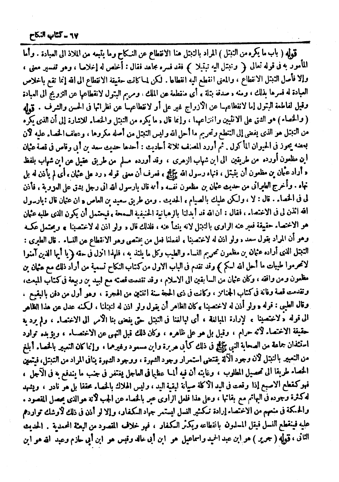 [5073] قَوْلِهِ رَدَّ عَلَى عُثْمَانَ أَيْ لَمْ يَأْذَنْ لَهُ بَلْ نَهَاهُ وَأَخْرَجَ الطَّبَرَانِيُّ مِنْ حَدِيثِ عُثْمَانَ بْنِ مَظْعُونٍ نَفْسِهِ أَنَّهُ قَالَ يَا رَسُولَ اللَّهِ إِنِّي رَجُلٌ يَشُقُّ عَلَيَّ الْعُزُوبَةُ فَأْذَنْ لِي فِي الْخِصَاءِ قَالَ لَا وَلَكِنْ عَلَيْكَ بِالصِّيَامِ الْحَدِيثَ وَمِنْ طَرِيقِ سَعِيدِ بْنِ الْعَاصِ أَنَّ عُثْمَانَ قَالَ يَا رَسُولَ اللَّهِ ائْذَنْ لِي فِي الِاخْتِصَاءِ فَقَالَ إِنَّ اللَّهَ قَدْ أَبْدَلَنَا بِالرَّهْبَانِيَّةِ الْحَنِيفِيَّةَ السَّمْحَةَ فَيَحْتَمِلُ أَنْ يَكُونَ الَّذِي طَلَبَهُ عُثْمَانُ هُوَ الِاخْتِصَاءُ حَقِيقَةً فَعَبَّرَ عَنْهُ الرَّاوِي بِالتَّبَتُّلِ لِأَنَّهُ يَنْشَأُ عَنْهُ فَلِذَلِكَ قَالَ وَلَوْ أَذِنَ لَهُ لَاخْتَصَيْنَا وَيَحْتَمِلُ عَكْسَهَ وَهُوَ أَنَّ الْمُرَادَ بِقَوْلِ سَعْدٍ وَلَوْ أَذِنَ لَهُ لَاخْتَصَيْنَا لَفَعَلْنَا فِعْلَ مَنْ يَخْتَصِي وَهُوَ الِانْقِطَاعُ عَنِ النِّسَاءِ قَالَ الطَّبَرِيُّ التَّبَتُّلُ الَّذِي أَرَادَهُ عُثْمَانُ بْنُ مَظْعُونٍ تَحْرِيمُ النِّسَاءِ وَالطِّيبِ وَكُلِّ مَا يُلْتَذُّ بِهِ فَلِهَذَا أَنْزَلَ فِي حَقِّهِ يَا أَيُّهَا الَّذِينَ آمَنُوا لَا تُحَرِّمُوا طَيِّبَاتِ مَا أَحَلَّ اللَّهُ لَكُمْ وَقَدْ تَقَدَّمَ فِي الْبَابِ الْأَوَّلِ مِنْ كِتَابِ النِّكَاحِ تَسْمِيَةُ مَنْ أَرَادَ ذَلِكَ مَعَ عُثْمَانَ بْنِ مَظْعُونٍ وَمَنْ وَافَقَهُ وَكَانَ عُثْمَانُ مِنَ السَّابِقِينَ إِلَى الْإِسْلَامِ وَقَدْ تَقَدَّمَتْ قِصَّتُهُ مَعَ لَبِيدِ بْنِ رَبِيعَةَ فِي كِتَابِ الْمَبْعَثِ وَتَقَدَّمَتْ قِصَّةُ وَفَاتِهِ فِي كِتَابِ الْجَنَائِزِ وَكَانَتْ فِي ذِي الْحَجَّةِ سَنَةَ اثْنَتَيْنِ مِنَ الْهِجْرَةِ وَهُوَ أَوَّلُ مِنْ دُفِنَ بِالْبَقِيعِ وَقَالَ الطِّيبِيُّ قَولُهُ وَلَوْ أَذِنَ لَهُ لَاخْتَصَيْنَا كَانَ الظَّاهِرُ أَنْ يَقُولَ وَلَوْ أَذِنَ لَهُ لَتَبَتَّلْنَا لَكِنَّهُ عَدَلَ عَنْ هَذَا الظَّاهِرِ إِلَى قَولِهِ لَاخْتَصَيْنَا لِإِرَادَةِ الْمُبَالَغَةِ أَيْ لَبَالَغْنَا فِي التَّبَتُّلِ حَتَّى يُفْضِيَ بِنَا الْأَمْرُ إِلَى الِاخْتِصَاءِ وَلَمْ يُرِدْ بِهِ حَقِيقَةَ الِاخْتِصَاءِ لِأَنَّهُ حَرَامٌ وَقِيلَ بَلْ هُوَ عَلَى ظَاهِرِهِ وَكَانَ ذَلِكَ قَبْلَ النَّهْيِ عَنِ الِاخْتِصَاءِ وَيُؤَيِّدُهُ تَوَارُدُ اسْتِئْذَانِ جَمَاعَةٍ مِنَ الصَّحَابَةِ النَّبِيِّ صَلَّى اللَّهُ عَلَيْهِ وَسَلَّمَ فِي ذَلِكَ كَأبي هُرَيْرَة وبن مَسْعُودٍ وَغَيْرِهِمَا وَإِنَّمَا كَانَ التَّعْبِيرُ بِالْخِصَاءِ أَبْلَغَ من التَّعْبِير بالتبل لِأَنَّ وُجُودَ الْآلَةِ يَقْتَضِي اسْتِمْرَارَ وُجُودِ الشَّهْوَةِ مَوْجُود الشَّهْوَةِ يُنَافِي الْمُرَادَ مِنَ التَّبَتُّلِ فَيَتَعَيَّنُ الْخِصَاءُ طَرِيقًا إِلَى تَحْصِيلِ الْمَطْلُوبِ وَغَايَتُهُ أَنَّ فِيهِ أَلَمًا عَظِيمًا فِي الْعَاجِلِ يُغْتَفَرُ فِي جَنْبِ مَا ينْدَفع بِهِ فِي الْآجِلُ فَهُوَ كَقَطْعِ الْإِصْبَعِ إِذَا وَقَعَتْ فِي الْيَدِ الْأَكِلَةُ صِيَانَةً لِبَقِيَّةِ الْيَدِ وَلَيْسَ الْهَلَاكُ بِالْخِصَاءِ مُحَقَّقًا بَلْ هُوَ نَادِرٌ وَيَشْهَدُ لَهُ كَثْرَةُ وُجُودِهِ فِي الْبَهَائِمِ مَعَ بَقَائِهَا وَعَلَى هَذَا فَلَعَلَّ الرَّاوِيَ عَبَّرَ بِالْخِصَاءِ عَنِ الْجَبِّ لِأَنَّهُ هُوَ الَّذِي يُحَصِّلُ الْمَقْصُودَ وَالْحِكْمَةُ فِي مَنْعِهِمْ مِنَ الِاخْتِصَاءِ إِرَادَةُ تَكْثِيرِ النَّسْلِ لِيَسْتَمِرَّ جِهَادُ الْكُفَّارِ وَإِلَّا لَوْ أَذِنَ فِي ذَلِكَ لَأَوْشَكَ تَوَارُدُهُمْ عَلَيْهِ فَيَنْقَطِعُ النَّسْلُ فَيَقِلُّ الْمُسْلِمُونَ بِانْقِطَاعِهِ وَيَكْثُرُ الْكُفَّارُ فَهُوَ خِلَافُ الْمَقْصُود