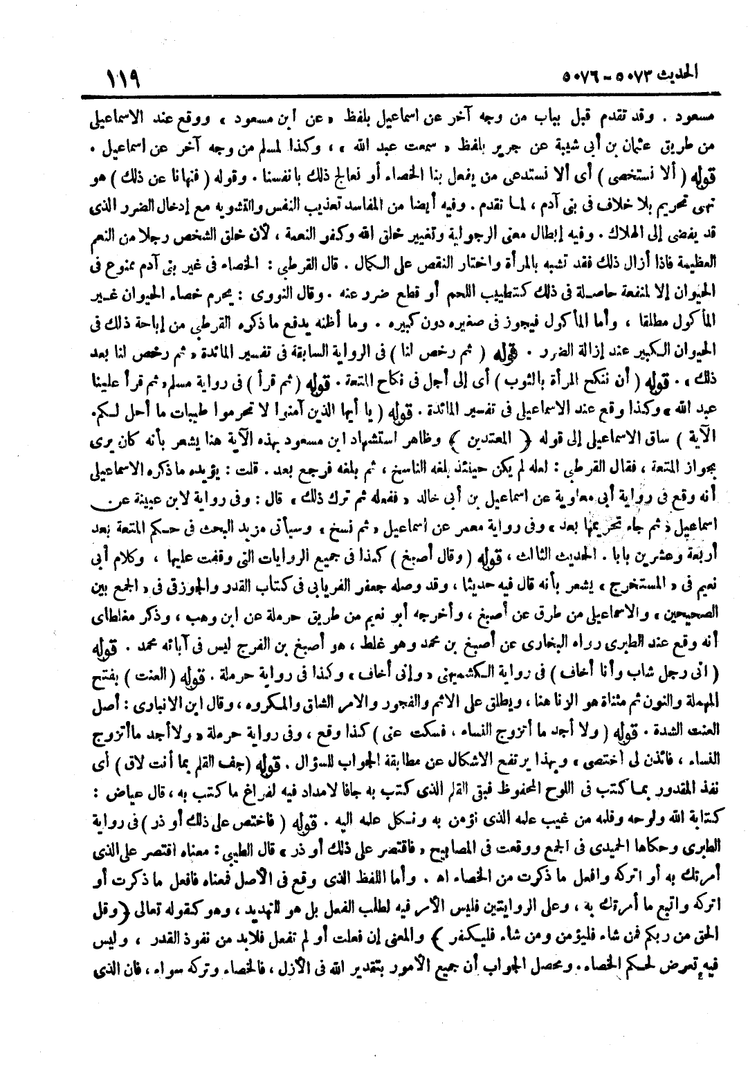مَسْعُودٍ وَقَدْ تَقَدَّمَ قَبْلُ بِبَابٍ مِنْ وَجْهٍ آخر عَن إِسْمَاعِيل بِلَفْظ عَن بن مَسْعُودٍ وَوَقَعَ عِنْدَ الْإِسْمَاعِيلِيِّ مِنْ طَرِيقِ عُثْمَانَ بْنِ أَبِي شَيْبَةَ عَنْ جَرِيرٍ بِلَفْظِ سَمِعْتُ عَبْدَ اللَّهِ وَكَذَا لِمُسْلِمٍ مِنْ وَجْهٍ آخَرَ عَنْ إِسْمَاعِيلَ قَوْلُهُ أَلَا نَسْتَخْصِي أَيْ أَلَا نستدعي من يفعل بِنَا الْخِصَاءَ أَوْ نُعَالِجُ ذَلِكَ بأَنْفُسِنَا وَقَوْلُهُ فَنَهَانَا عَنْ ذَلِكَ هُوَ نَهْيُ تَحْرِيمٍ بِلَا خِلَافٍ فِي بَنِي آدَمَ لِمَا تَقَدَّمَ وَفِيهِ أَيْضًا مِنَ الْمَفَاسِدِ تَعْذِيبِ النَّفْسِ وَالتَّشْوِيهِ مَعَ إِدْخَالِ الضَّرَرِ الَّذِي قَدْ يُفْضِي إِلَى الْهَلَاكِ وَفِيهِ إِبْطَالُ مَعْنَى الرُّجُولِيَّةِ وَتَغْيِيرُ خَلْقِ اللَّهِ وَكُفْرُ النِّعْمَةِ لِأَنَّ خَلْقَ الشَّخْصِ رَجُلًا مِنَ النِّعَمِ الْعَظِيمَةِ فَإِذَا أَزَالَ ذَلِكَ فَقَدْ تَشَبَّهَ بِالْمَرْأَةِ وَاخْتَارَ النَّقْصَ عَلَى الْكَمَالِ قَالَ الْقُرْطُبِيُّ الْخِصَاءُ فِي غَيْرِ بَنِي آدَمَ مَمْنُوعٌ فِي الْحَيَوَانِ إِلَّا لِمَنْفَعَةٍ حَاصِلَةٍ فِي ذَلِكَ كَتَطْيِيبِ اللَّحْمِ أَوْ قَطْعِ ضَرَرٍ عَنْهُ وَقَالَ النَّوَوِيُّ يَحْرُمُ خِصَاءُ الْحَيَوَانِ غَيْرِ الْمَأْكُولِ مُطْلَقًا وَأَمَّا الْمَأْكُولُ فَيَجُوزُ فِي صَغِيرِهِ دُونَ كَبِيرِهِ وَمَا أَظُنُّهُ يَدْفَعُ مَا ذَكَرَهُ الْقُرْطُبِيُّ مِنْ إِبَاحَةِ ذَلِكَ فِي الْحَيَوَانِ الْكَبِيرِ عِنْدَ إِزَالَةِ الضَّرَرِ قَوْلُهُ ثُمَّ رَخَّصَ لَنَا فِي الرِّوَايَةِ السَّابِقَةِ فِي تَفْسِيرِ الْمَائِدَةِ ثُمَّ رَخَّصَ لَنَا بَعْدَ ذَلِكَ قَوْلُهُ أَنْ نَنْكِحَ الْمَرْأَةَ بِالثَّوْبِ أَيْ إِلَى أَجَلٍ فِي نِكَاحِ الْمُتْعَةِ قَوْلُهُ ثُمَّ قَرَأَ فِي رِوَايَةِ مُسْلِمٍ ثُمَّ قَرَأَ عَلَيْنَا عَبْدُ اللَّهِ وَكَذَا وَقَعَ عِنْدَ الْإِسْمَاعِيلِيِّ فِي تَفْسِيرِ الْمَائِدَةِ قَوْلِهِ يَا أَيُّهَا الَّذِينَ آمَنُوا لَا تُحَرِّمُوا طَيِّبَاتِ مَا أَحَلَّ لكم الْآيَةَ سَاقَ الْإِسْمَاعِيلِيُّ إِلَى قَوْلِهِ الْمُعْتَدِينَ وَظَاهِرُ استشهاد بن مَسْعُودٍ بِهَذِهِ الْآيَةِ هُنَا يُشْعِرُ بِأَنَّهُ كَانَ يَرَى بِجَوَازِ الْمُتْعَةِ فَقَالَ الْقُرْطُبِيُّ لَعَلَّهُ لَمْ يَكُنْ حِينَئِذٍ بَلَغَهُ النَّاسِخُ ثُمَّ بَلَغَهُ فَرَجَعَ بَعْدُ قُلْتُ يُؤَيِّدُهُ مَا ذَكَرَهُ الْإِسْمَاعِيلِيُّ أَنَّهُ وَقَعَ فِي رِوَايَةِ أَبِي مُعَاوِيَةَ عَنْ إِسْمَاعِيلَ بْنِ أَبِي خَالِدٍ فَفَعَلَهُ ثُمَّ تَرَكَ ذَلِكَ قَالَ وَفِي رِوَايَةٍ لِابْنِ عُيَيْنَةَ عَنْ إِسْمَاعِيلَ ثُمَّ جَاءَ تَحْرِيمُهَا بَعْدُ وَفِي رِوَايَةِ مَعْمَرٍ عَنْ إِسْمَاعِيلَ ثُمَّ نُسِخَ وَسَيَأْتِي مَزِيدُ الْبَحْثِ فِي حُكْمِ الْمُتْعَةِ بَعْدَ أَرْبَعَةٍ وَعِشْرِينَ بَابًا الْحَدِيثُ الثَالِثُ