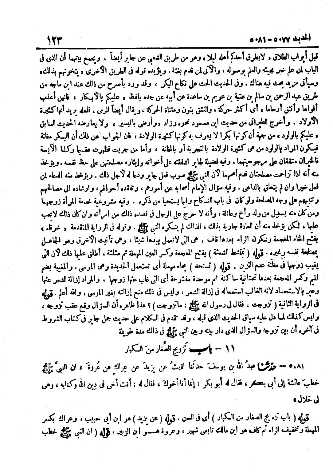 قَبْلَ أَبْوَابِ الطَّلَاقِ لَا يَطْرُقْ أَحَدُكُمْ أَهْلَهُ لَيْلًا وَهُوَ مِنْ طَرِيقِ الشَّعْبِيِّ عَنْ جَابِرٍ أَيْضًا وَيَجْمَعُ بَيْنَهُمَا أَنَّ الَّذِي فِي الْبَابِ لمن علم خبر مَجِيئُهُ وَالْعِلْمُ بِوُصُولِهِ وَالْآتِي لِمَنْ قَدِمَ بَغْتَةً وَيُؤَيِّدُهُ قَوْلُهُ فِي الطَّرِيقِ الْأُخْرَى يَتَخَوَّنُهُمْ بِذَلِكَ وَسَيَأْتِي مَزِيدُ بَحْثٍ فِيهِ هُنَاكَ وَفِي الْحَدِيثِ الْحَثُّ عَلَى نِكَاحِ الْبِكْرِ وَقَدْ وَرَدَ بِأَصْرَحَ من ذَلِك عِنْد بن مَاجَهْ مِنْ طَرِيقِ عَبْدِ الرَّحْمَنِ بْنِ سَالِمِ بْنِ عُتْبَةَ بْنِ عُوَيْمِ بْنِ سَاعِدَةَ عَنْ أَبِيهِ عَنْ جَدِّهِ بِلَفْظِ عَلَيْكُمْ بِالْأَبْكَارِ فَإِنَّهُنَّ أَعْذَبُ أَفْوَاهًا وَأَنْتَقُ أَرْحَامًا أَيْ أَكْثَرُ حَرَكَةً وَالنَّتَقُ بِنُونٍ وَمُثَنَّاةٍ الْحَرَكَةُ وَيُقَالُ أَيْضًا لِلرَّمْيِ فَلَعَلَّهُ يُرِيدُ أَنَّهَا كَثِيرَةُ الْأَوْلَادِ وَأَخْرَجَ الطَّبَرَانِيُّ من حَدِيث بن مَسْعُود نَحوه وَزَاد وأرضى بِالْيَسِيرِ وَلَا يُعَارِضُهُ الْحَدِيثُ السَّابِقُ عَلَيْكُمْ بِالْوَلُودِ مِنْ جِهَةِ أَنَّ كَوْنَهَا بِكْرًا لَا يُعْرَفُ بِهِ كَوْنُهَا كَثِيرَةَ الْوِلَادَةِ فَإِنَّ الْجَوَابَ عَنْ ذَلِكَ أَنَّ الْبِكْرَ مَظِنَّةٌ فَيَكُونُ الْمُرَادُ بِالْوَلُودِ مَنْ هِيَ كَثِيرَةُ الْوِلَادَةِ بِالتَّجْرِبَةِ أَوْ بِالْمَظِنَّةِ وَأَمَّا مَنْ جُرِّبَتْ فَظَهَرَتْ عَقِيمًا وَكَذَا الْآيِسَةُ فَالْخَبَرَانِ مُتَّفِقَانِ عَلَى مَرْجُوحِيَّتِهِمَا وَفِيهِ فَضِيلَةٌ لِجَابِرٍ لِشَفَقَتِهِ عَلَى أَخَوَاتِهِ وَإِيثَارِهِ مَصْلَحَتَهُنَّ عَلَى حَظِّ نَفسه ويوخذ مِنْهُ أَنَّهُ إِذَا تَزَاحَمَتْ مَصْلَحَتَانِ قُدِّمَ أَهَمُّهُمَا لِأَنَّ النَّبِيَّ صَلَّى اللَّهُ عَلَيْهِ وَسَلَّمَ صَوَّبَ فِعْلَ جَابِرٍ وَدَعَا لَهُ لِأَجْلِ ذَلِكَ وَيُؤْخَذُ مِنْهُ الدُّعَاءُ لِمَنْ فَعَلَ خَيْرًا وَإِنْ لَمْ يَتَعَلَّقْ بِالدَّاعِي وَفِيهِ سُؤَالُ الْإِمَامِ أَصْحَابَهُ عَنْ أُمُورِهِمْ وَتَفَقُّدُهُ أَحْوَالَهُمْ وَإِرْشَادُهُ إِلَى مَصَالِحِهِمْ وَتَنْبِيهُهُمْ عَلَى وَجْهِ الْمَصْلَحَةِ وَلَوْ كَانَ فِي بَابِ النِّكَاحِ وَفِيمَا يُسْتَحَيَا مِنْ ذِكْرِهِ وَفِيهِ مَشْرُوعِيَّةُ خِدْمَةِ الْمَرْأَةِ زَوْجَهَا وَمَنْ كَانَ مِنْهُ بِسَبِيلٍ مِنْ وَلَدٍ وَأَخٍ وَعَائِلَةٍ وَأَنَّهُ لَا حَرَجَ عَلَى الرَّجُلِ فِي قَصْدِهِ ذَلِكَ مِنِ امْرَأَتِهِ وَإِنْ كَانَ ذَلِكَ لَا يَجِبُ عَلَيْهَا لَكِنْ يُؤْخَذُ مِنْهُ أَنَّ الْعَادَةَ جَارِيَةٌ بِذَلِكَ فَلِذَلِكَ لَمْ يُنْكِرْهُ النَّبِيِّ صَلَّى اللَّهُ عَلَيْهِ وَسَلَّمَ وَقَوْلُهُ فِي الرِّوَايَةِ الْمُتَقَدِّمَةِ خَرْقَاءَ بِفَتْحِ الْخَاءِ الْمُعْجَمَةِ وَسُكُونِ الرَّاءِ بَعْدَهَا قَافٌ هِيَ الَّتِي لَا تَعْمَلُ بِيَدِهَا شَيْئًا وَهِيَ تَأْنِيثُ الْأَخْرَقِ وَهُوَ الْجَاهِلُ بِمَصْلَحَةِ نَفْسِهِ وَغَيْرِهِ قَوْلُهُ تَمْتَشِطَ الشَّعِثَةُ بِفَتْحِ الْمُعْجَمَةِ وَكَسْرِ الْعَيْنِ الْمُهْمَلَةِ ثُمَّ مُثَلَّثَةٍ أَطْلَقَ عَلَيْهَا ذَلِكَ لِأَنَّ الَّتِي يَغِيبُ زَوْجُهَا فِي مَظِنَّةِ عَدَمِ التَّزَيُّنِ قَوْلُهُ تَسْتَحِدَّ بِحَاءٍ مُهْمَلَةٍ أَيْ تَسْتَعْمِلَ الْحَدِيدَةَ وَهِيَ الْمُوسَى وَالْمُغِيبَةُ بِضَمِّ الْمِيمِ وَكَسْرِ الْمُعْجَمَةِ بَعْدَهَا تَحْتَانِيَّةٌ سَاكِنَةٌ ثُمَّ مُوَحَّدَةٌ مَفْتُوحَةٌ أَيِ الَّتِي غَابَ عَنْهَا زَوْجُهَا وَالْمُرَادُ إِزَالَةُ الشَّعْرِ عَنْهَا وَعَبَّرَ بِالِاسْتِحْدَادِ لِأَنَّهُ الْغَالِبُ اسْتِعْمَالُهُ فِي إِزَالَةِ الشَّعْرِ وَلَيْسَ فِي ذَلِكَ مَنْعُ إِزَالَتِهِ بِغَيْرِ الْمُوسَى وَالل