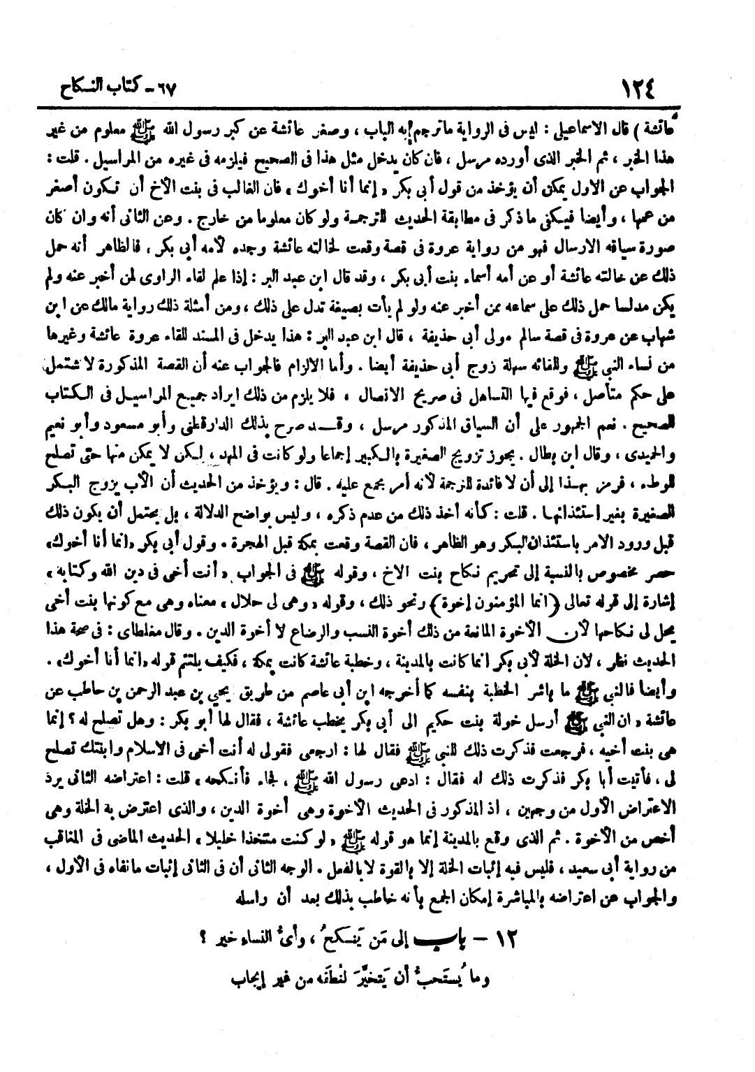 عَائِشَةَ قَالَ الْإِسْمَاعِيلِيُّ لَيْسَ فِي الرِّوَايَةِ مَا تَرْجَمَ بِهِ الْبَابَ وَصِغَرُ عَائِشَةَ عَنْ كِبَرِ رَسُولِ اللَّهِ صَلَّى اللَّهُ عَلَيْهِ وَسَلَّمَ مَعْلُومٌ مِنْ غَيْرِ هَذَا الْخَبَرِ ثُمَّ الْخَبَرُ الَّذِي أَوْرَدَهُ مُرْسَلٌ فَإِنْ كَانَ يَدْخُلُ مِثْلُ هَذَا فِي الصَّحِيحِ فَيَلْزَمُهُ فِي غَيْرِهِ مِنَ الْمَرَاسِيلِ قُلْتُ الْجَوَابُ عَنِ الْأَوَّلِ يُمْكِنُ أَنْ يُؤْخَذَ مِنْ قَوْلِ أَبِي بَكْرٍ إِنَّمَا أَنَا أَخُوكَ فَإِنَّ الْغَالِبَ فِي بِنْتِ الْأَخِ أَنْ تَكُونَ أَصْغَرَ مِنْ عَمِّهَا وَأَيْضًا فَيَكْفِي مَا ذُكِرَ فِي مُطَابَقَةِ الْحَدِيثِ لِلتَّرْجَمَةِ وَلَوْ كَانَ مَعْلُومًا مِنْ خَارِجٍ وَعَنِ الثَّانِي أَنَّهُ وَإِنْ كَانَ صُورَةُ سِيَاقِهِ الْإِرْسَالَ فَهُوَ مِنْ رِوَايَةِ عُرْوَةَ فِي قِصَّةٍ وَقَعَتْ لِخَالَتِهِ عَائِشَةَ وَجَدِّهِ لِأُمِّهِ أَبِي بَكْرٍ فَالظَّاهِرُ أَنَّهُ حَمَلَ ذَلِكَ عَنْ خَالَتِهِ عَائِشَةَ أَوْ عَنْ أُمِّهِ أَسْمَاءَ بِنْتِ أبي بكر وَقد قَالَ بن عَبْدِ الْبَرِّ إِذَا عُلِمَ لِقَاءُ الرَّاوِي لِمَنْ أَخْبَرَ عَنْهُ وَلَمْ يَكُنْ مُدَلِّسًا حُمِلَ ذَلِكَ عَلَى سَمَاعِهِ مِمَّنْ أَخْبَرَ عَنْهُ وَلَوْ لَمْ يَأْتِ بِصِيغَةٍ تَدُلُّ عَلَى ذَلِكَ وَمِنْ أَمْثِلَةِ ذَلِك رِوَايَة مَالك عَن بن شِهَابٍ عَنْ عُرْوَةَ فِي قِصَّةِ سَالِمٍ مَوْلَى أبي حُذَيْفَة قَالَ بن عَبْدِ الْبَرِّ هَذَا يَدْخُلُ فِي الْمُسْنَدِ لِلِقَاءِ عُرْوَةَ عَائِشَةَ وَغَيْرَهَا مِنْ نِسَاءِ النَّبِيِّ صَلَّى اللَّهُ عَلَيْهِ وَسَلَّمَ وَلِلِقَائِهِ سَهْلَةَ زَوْجَ أَبِي حُذَيْفَةَ أَيْضًا وَأَمَّا الْإِلْزَامُ فَالْجَوَابُ عَنْهُ أَنَّ الْقِصَّةَ الْمَذْكُورَةَ لَا تَشْتَمِلُ عَلَى حُكْمٍ مُتَأَصِّلٍ فَوَقَعَ فِيهَا التَّسَاهُلُ فِي صَرِيحِ الِاتِّصَالِ فَلَا يَلْزَمُ مِنْ ذَلِكَ إِيرَادُ جَمِيعِ الْمَرَاسِيلِ فِي الْكِتَابِ الصَّحِيحِ نَعَمِ الْجُمْهُورُ عَلَى أَنَّ السِّيَاقَ الْمَذْكُورَ مُرْسَلٌ وَقَدْ صَرَّحَ بِذَلِكَ الدَّارَقُطْنِيُّ وَأَبُو مَسْعُود وَأَبُو نعيم والْحميدِي وَقَالَ بن بَطَّالٍ يَجُوزُ تَزْوِيجُ الصَّغِيرَةِ بِالْكَبِيرِ إِجْمَاعًا وَلَوْ كَانَتْ فِي الْمَهْدِ لَكِنْ لَا يُمَكَّنُ مِنْهَا حَتَّى تَصْلُحَ لِلْوَطْءِ فَرَمَزَ بِهَذَا إِلَى أَنْ لَا فَائِدَةَ لِلتَّرْجَمَةِ لِأَنَّهُ أَمْرٌ مُجْمَعٌ عَلَيْهِ قَالَ وَيُؤْخَذُ مِنَ الْحَدِيثِ أَنَّ الْأَبَ يُزَوِّجُ الْبِكْرَ الصَّغِيرَةَ بِغَيْرِ اسْتِئْذَانِهَا قُلْتُ كَأَنَّهُ أَخَذَ ذَلِكَ مِنْ عَدَمِ ذِكْرِهِ وَلَيْسَ بِوَاضِحِ الدَّلَالَةِ بَلْ يَحْتَمِلُ أَنْ يَكُونَ ذَلِكَ قَبْلَ وُرُودِ الْأَمْرِ بِاسْتِئْذَانِ الْبِكْرِ وَهُوَ الظَّاهِرُ فَإِنَّ الْقِصَّةَ وَقَعَتْ بِمَكَّةَ قَبْلَ الْهِجْرَةِ وَقَوْلُ أَبِي بَكْرٍ إِنَّمَا أَنَا أَخُوكَ حَصْرٌ مَخْصُوصٌ بِالنِّسْبَةِ إِلَى تَحْرِيمِ نِكَاحِ بِنْتِ الْأَخِ وَقَوْلُهُ صَلَّى اللَّهُ عَلَيْهِ وَسَلَّمَ فِي الْجَوَابِ أَنْتَ أَخِي فِي دِينِ اللَّهِ وَكِتَابِهِ إِشَارَةٌ إِلَى قَوْلِهِ تَعَالَى إِنَّمَا الْمُؤْمِنُونَ اخوة وَنَحْوُ ذَلِكَ وَقَوْلُهُ وَهِيَ لِي حَلَالٌ مَعْنَاهُ وَهِيَ مَعَ كَوْنِهَا بِنْتَ أَخِي يَحِلُّ لِي نِكَاحُهَا لِأَنَّ الْأُخُوَّةَ الْمَانِعَةَ مِنْ ذَلِكَ أُخُوَّةُ النَّسَبِ وَالرَّضَاعِ لَا أُخُوَّةُ الدِّينِ وَقَالَ مُغَلْطَايْ فِي صِحَّةِ هَذَا الْحَدِيثِ نَظَرٌ لِأَنَّ الْخُلَّةَ لِأَبِي بَكْرٍ إِنَّمَا كَانَتْ بِالْمَدِينَةِ وَخُطْبَةُ عَائِشَةَ كَانَتْ بِمَكَّةَ فَكَيْفَ يَلْتَئِمُ قَولُهُ إِنَّمَا أَنَا أَخُوكَ وَأَيْضًا فَالنَّبِيُّ صَلَّى اللَّه