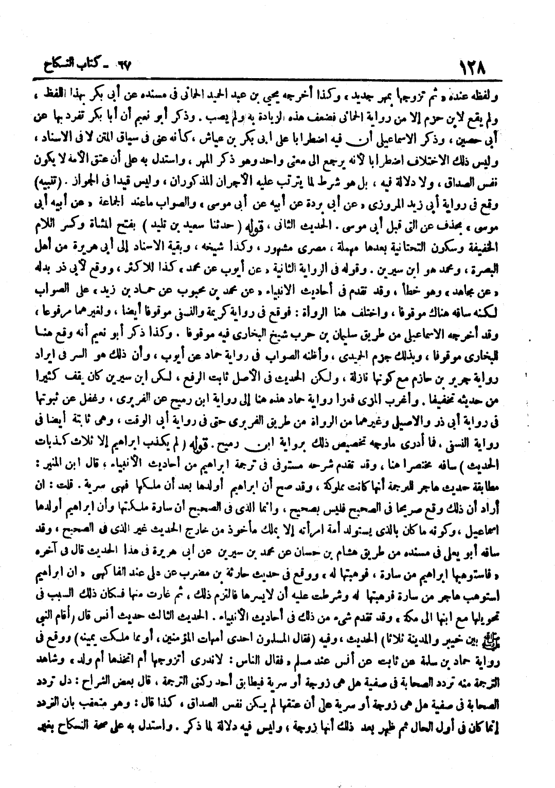 [5084] قَوْلُهُ حَدَّثَنَا سَعِيدُ بْنُ تَلِيدٍ بِفَتْحِ الْمُثَنَّاةِ وَكَسْرِ اللَّامِ الْخَفِيفَةِ وَسُكُونِ التَّحْتَانِيَّةِ بَعْدَهَا مُهْمَلَةٌ مِصْرِيٌّ مَشْهُورٌ وَكَذَا شَيْخُهُ وَبَقِيَّةُ الْإِسْنَادِ إِلَى أَبِي هُرَيْرَةَ مِنْ أهل الْبَصْرَة وَمُحَمّد هُوَ بن سِيرِينَ وَقَوْلُهُ فِي الرِّوَايَةِ الثَّانِيَةِ عَنْ أَيُّوبَ عَنْ مُحَمَّدٍ كَذَا لِلْأَكْثَرِ وَوَقَعَ لِأَبِي ذَرٍّ بَدَلَهُ عَنْ مُجَاهِدٍ وَهُوَ خَطَأٌ وَقَدْ تَقَدَّمَ فِي أَحَادِيثِ الْأَنْبِيَاءِ عَنْ مُحَمَّدِ بْنِ مَحْبُوبٍ عَنْ حَمَّادِ بْنِ زَيْدٍ عَلَى الصَّوَابِ لَكِنَّهُ سَاقَهُ هُنَاكَ مَوْقُوفًا وَاخْتَلَفَ هُنَا الرُّوَاةُ فَوَقَعَ فِي رِوَايَةِ كَرِيمَةَ وَالنَّسَفِيِّ مَوْقُوفًا أَيْضًا وَلِغَيْرِهِمَا مَرْفُوعًا وَقَدْ أَخْرَجَهُ الْإِسْمَاعِيلِيُّ مِنْ طَرِيقِ سُلَيْمَانَ بْنِ حَرْبٍ شَيْخِ الْبُخَارِيِّ فِيهِ مَوْقُوفًا وَكَذَا ذكر أَبُو نعيم أَنه وَقع هُنَا البُخَارِيّ مَوْقُوفًا وَبِذَلِكَ جَزَمَ الْحُمَيْدِيُّ وَأَظُنُّهُ الصَّوَابَ فِي رِوَايَةِ حَمَّادٍ عَنْ أَيُّوبَ وَأَنَّ ذَلِكَ هُوَ السِّرُّ فِي إِيرَادِ رِوَايَةِ جَرِيرِ بْنِ حَازِمٍ مَعَ كَوْنِهَا نَازِلَةً وَلَكِنَّ الْحَدِيثَ فِي الْأَصْلِ ثَابت الرّفْع لَكِن بن سِيرِينَ كَانَ يَقِفُ كَثِيرًا مِنْ حَدِيثِهِ تَخْفِيفًا وَأَغْرَبَ الْمِزِّيُّ فَعَزَا رِوَايَةَ حَمَّادٍ هَذِهِ هُنَا إِلَى رِوَايَة بن رُمَيْحٍ عَنِ الْفَرَبْرِيِّ وَغَفَلَ عَنْ ثُبُوتِهَا فِي رِوَايَةِ أَبِي ذَرٍّ وَالْأَصِيلِيِّ وَغَيْرِهِمَا مِنَ الرُّوَاةِ مِنْ طَرِيقِ الْفَرَبْرِيِّ حَتَّى فِي رِوَايَةِ أَبِي الْوَقْتِ وَهِيَ ثَابِتَةٌ أَيْضًا فِي رِوَايَةِ النَّسَفِيِّ فَمَا أَدْرِي مَا وَجْهُ تَخْصِيصِ ذَلِكَ بِرِوَايَةِ بن رُمَيْحٍ قَوْلُهُ لَمْ يَكْذِبْ إِبْرَاهِيمُ إِلَّا ثَلَاثَ كَذَبَاتٍ الْحَدِيثَ سَاقَهُ مُخْتَصَرًا هُنَا وَقَدْ تَقَدَّمَ شَرْحُهُ مُسْتَوْفًى فِي تَرْجَمَةِ إِبْرَاهِيمَ مِنْ أَحَادِيثِ الْأَنْبِيَاء قَالَ بن الْمُنِيرِ مُطَابَقَةُ حَدِيثِ هَاجَرَ لِلتَّرْجَمَةِ أَنَّهَا كَانَتْ مَمْلُوكَةً وَقَدْ صَحَّ أَنَّ إِبْرَاهِيمَ أَوْلَدَهَا بَعْدَ أَنْ مَلَكَهَا فَهِيَ سُرِّيَّةٌ قُلْتُ إِنْ أَرَادَ أَنَّ ذَلِكَ وَقَعَ صَرِيحًا فِي الصَّحِيحِ فَلَيْسَ بِصَحِيحٍ وَإِنَّمَا الَّذِي فِي الصَّحِيحِ أَنَّ سَارَّةَ مَلَكَتْهَا وَأَنَّ إِبْرَاهِيمَ أَوْلَدَهَا إِسْمَاعِيلَ وَكَوْنُهُ مَا كَانَ بِالَّذِي يَسْتَوْلِدُ أَمَةَ امْرَأَتِهِ إِلَّا بِمِلْكٍ مَأْخُوذٍ مِنْ خَارِجِ الْحَدِيثِ غَيْرِ الَّذِي فِي الصَّحِيحِ وَقَدْ سَاقَهُ أَبُو يَعْلَى فِي مُسْنَدِهِ مِنْ طَرِيقِ هِشَامِ بْنِ حَسَّانَ عَنْ مُحَمَّدِ بْنِ سِيرِينَ عَنْ أَبِي هُرَيْرَةَ فِي هَذَا الْحَدِيثِ قَالَ فِي آخِرِهِ فَاسْتَوْهَبَهَا إِبْرَاهِيمُ مِنْ سَارَّةَ فَوَهَبَتْهَا لَهُ وَوَقَعَ فِي حَدِيثِ حَارِثَةَ بْنِ مُضَرِّبٍ عَنْ عَلِيٍّ عِنْدَ الْفَاكِهِيِّ إِنَّ إِبْرَاهِيمَ اسْتَوْهَبَ هَاجَرَ مِنْ سَارَّةَ فَوَهَبَتْهَا لَهُ وَشَرَطَتْ عَلَيْهِ أَنْ لَا يُسِرَّهَا فَالْتَزَمَ ذَلِكَ ثُمَّ غَارَتْ مِنْهَا فَكَانَ ذَلِكَ السَّبَبَ فِي تَحْوِيلِهَا مَعَ ابْنِهَا إِلَى مَكَّةَ وَقَدْ تَقَدَّمَ شَيْءٌ مِنْ ذَلِكَ فِي أَحَادِيثِ الْأَنْبِيَاءِ الْحَدِيثُ الثَّالِثُ حَدِيثُ أَنَسٍ قَالَ