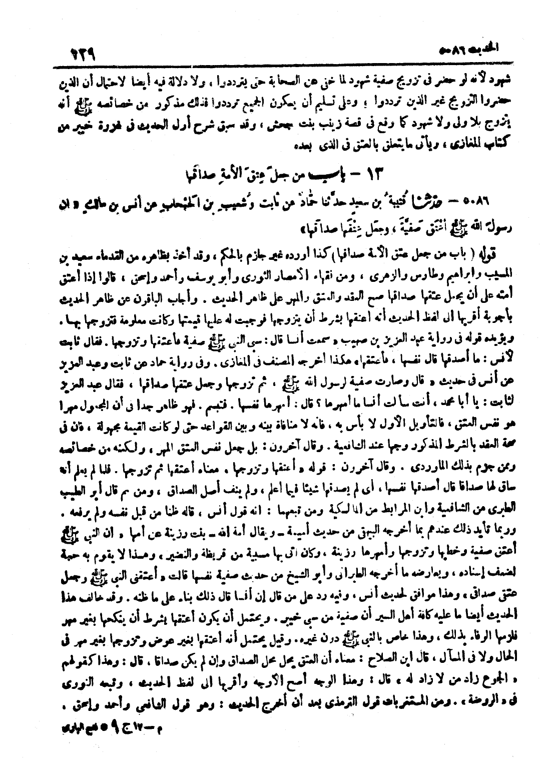 كَذَا أَوْرَدَهُ غَيْرَ جَازِمٍ بِالْحُكْمِ وَقَدْ أَخَذَ بِظَاهِرِهِ مِنَ الْقُدَمَاءِ سَعِيدُ بْنُ الْمُسَيَّبِ وَإِبْرَاهِيمُ وَطَاوُسٌ وَالزُّهْرِيُّ وَمِنْ فُقَهَاءِ الْأَمْصَارِ الثَّوْرِيُّ وَأَبُو يُوسُفَ وَأَحْمَدُ وَإِسْحَاقُ قَالُوا إِذَا أَعْتَقَ أَمَتَهُ عَلَى أَنْ يَجْعَلَ عِتْقَهَا صَدَاقَهَا صَحَّ الْعَقْدُ وَالْعِتْقُ وَالْمَهْرُ عَلَى ظَاهِرِ الْحَدِيثِ وَأَجَابَ الْبَاقُونَ عَن ظَاهر الحَدِيث بأجوبة أقربها إِلَى لَفْظُ الْحَدِيثِ أَنَّهُ أَعْتَقَهَا بِشَرْطِ أَنْ يَتَزَوَّجَهَا فَوَجَبَتْ لَهُ عَلَيْهَا قِيمَتُهَا وَكَانَتْ مَعْلُومَةً فَتَزَوَّجَهَا بِهَا وَيُؤَيِّدُهُ قَوْلُهُ فِي رِوَايَةِ عَبْدِ الْعَزِيزِ بْنِ صُهَيْبٍ سَمِعْتُ أَنَسًا قَالَ سَبَى النَّبِيُّ صَلَّى اللَّهُ عَلَيْهِ وَسَلَّمَ صَفِيَّةَ فَأَعْتَقَهَا وَتَزَوَّجَهَا فَقَالَ ثَابِتٌ لِأَنَسٍ مَا أَصْدَقَهَا قَالَ نَفْسَهَا فَأَعْتَقَهَا هَكَذَا أَخْرَجَهُ الْمُصَنِّفُ فِي الْمَغَازِي وَفِي رِوَايَةِ حَمَّادٍ عَنْ ثَابِتٍ وَعَبْدِ الْعَزِيزِ عَنْ أَنَسٍ فِي حَدِيثٍ قَالَ وَصَارَتْ صَفِيَّةُ لِرَسُولِ اللَّهِ صَلَّى اللَّهُ عَلَيْهِ وَسَلَّمَ ثُمَّ تَزَوَّجَهَا وَجَعَلَ عِتْقَهَا صَدَاقَهَا فَقَالَ عَبْدُ الْعَزِيزِ لِثَابِتٍ يَا أَبَا مُحَمَّدٍ أَنْتَ سَأَلْتَ أَنَسًا مَا أَمْهَرَهَا قَالَ أَمْهَرَهَا نَفْسَهَا فَتَبَسَّمَ فَهُوَ ظَاهِرٌ جدا فِي أَن المجمول مَهْرًا هُوَ نَفْسُ الْعِتْقِ فَالتَّأْوِيلُ الْأَوَّلُ لَا بَأْسَ بِهِ فَإِنَّهُ لَا مُنَافَاةَ بَيْنَهُ وَبَيْنَ الْقَوَاعِدِ حَتَّى لَوْ كَانَتِ الْقِيمَةُ مَجْهُولَةً فَإِنَّ فِي صِحَّةِ الْعَقْدِ بِالشَّرْطِ الْمَذْكُورِ وَجْهًا عِنْدَ الشَّافِعِيَّةِ وَقَالَ آخَرُونَ بَلْ جَعَلَ نَفْسَ الْعِتْقِ الْمَهْرَ وَلَكِنَّهُ مِنْ خَصَائِصِهِ وَمِمَّنْ جَزَمَ بِذَلِكَ الْمَاوَرْدِيُّ وَقَالَ آخَرُونَ قَوْلُهُ أَعْتَقَهَا وَتَزَوَّجَهَا مَعْنَاهُ أَعْتَقَهَا ثُمَّ تَزَوَّجَهَا فَلَمَّا لَمْ يَعْلَمْ أَنَّهُ سَاقَ لَهَا صَدَاقًا قَالَ أَصْدَقَهَا نَفْسَهَا أَيْ لَمْ يُصْدِقْهَا شَيْئًا فِيمَا أَعْلَمُ وَلَمْ يَنْفِ أَصْلَ الصَّدَاقِ وَمِنْ ثَمَّ قَالَ أَبُو الطَّيِّبِ الطَّبَرِيّ من الشَّافِعِيَّة وبن الْمُرَابِطِ مِنَ الْمَالِكِيَّةِ وَمَنْ تَبِعَهُمَا أَنَّهُ قَوْلُ أَنَسٍ قَالَهُ ظَنًّا مِنْ قِبَلِ نَفْسِهِ وَلَمْ يَرْفَعْهُ وَرُبَّمَا تَأَيَّدَ ذَلِكَ عِنْدَهُمْ بِمَا أَخْرَجَهُ الْبَيْهَقِيُّ مِنْ حَدِيثِ أُمَيْمَةَ وَيُقَالُ أَمَةُ اللَّهِ بِنْتُ رَزِينَةَ عَنِ أُمِّهَا أَنَّ النَّبِيَّ صَلَّى اللَّهُ عَلَيْهِ وَسَلَّمَ أَعْتَقَ صَفِيَّةَ وَخَطَبَهَا وَتَزَوَّجَهَا وَأَمْهَرَهَا رَزِينَةَ وَكَانَ أَتَى بِهَا مَسْبِيَّةً مِنْ قُرَيْظَةَ وَالنَّضِيرِ وَهَذَا لَا يَقُومُ بِهِ حُجَّةٌ لِضَعْفِ إِسْنَادِهِ وَيُعَارِضُهُ مَا أَخْرَجَهُ الطَّبَرَانِيُّ وَأَبُو الشَّيْخِ مِنْ حَدِيثِ صَفِيَّةَ نَفْسِهَا قَالَتْ أَعْتَقَنِي النَّبِيُّ صَلَّى اللَّهُ عَلَيْهِ وَسَلَّمَ وَجَعَلَ عِتْقِي صَدَاقِي وَهَذَا مُوَافِقٌ لِحَدِيثِ أَنَسٍ وَفِيهِ رَدٌّ عَلَى مَنْ قَالَ إِنَّ أَنَسًا قَالَ ذَلِكَ بِنَاءً عَلَى مَا ظَنَّهُ وَقَدْ خَالَفَ هَذَا الْحَدِيثَ أَيْضًا مَا عَلَيْهِ كَافَّةُ أَهْلِ السِّيَرِ أَنَّ صَفِيَّةَ مِنْ سَبْيِ خَيْبَرَ وَيَحْتَمِلُ أَنْ يَكُونَ أَعْتَقَهَا بِشَرْطِ أَنْ يَنْكِحَهَا بِغَيْرِ مَهْرٍ فَلَزِمَهَا الْوَفَاءُ بِذَلِكَ وَهَذَا خَاصٌّ بِالنَّبِيِّ صَلَّى اللَّهُ عَلَيْهِ وَسَلَّمَ دُونَ غَيْرِهِ وَقِيلَ يَحْتَمِلُ أَنَّهُ أَعْتَقَهَا بِغَيْرِ عِوَضٍ وَتَزَوَّجَهَا بِغَيْرِ مَهْرٍ 