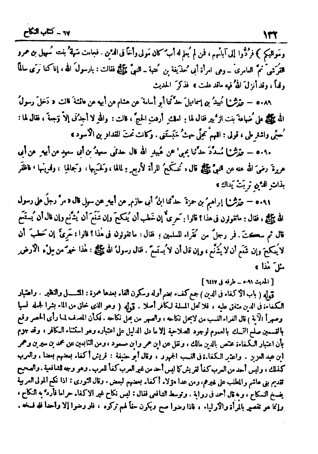 فِي الدِّينِ جَمْعُ كُفْءٍ بِضَمِّ أَوَّلِهِ وَسُكُونِ الْفَاءِ بَعْدَهَا هَمْزَةٌ الْمِثْلُ وَالنَّظِيرُ وَاعْتِبَارُ الْكَفَاءَةِ فِي الدِّينِ مُتَّفَقٌ عَلَيْهِ فَلَا تَحِلُّ الْمُسْلِمَةُ لِكَافِرٍ أَصْلًا قَوْلُهُ وَهُوَ الَّذِي خَلَقَ مِنَ الْمَاءِ بَشَرًا فَجَعَلَهُ نَسَبًا وصهرا الْآيَةَ قَالَ الْفَرَّاءُ النَّسَبُ مَنْ لَا يَحِلُّ نِكَاحُهُ وَالصِّهْرُ مَنْ يَحِلُّ نِكَاحُهُ فَكَأَنَّ الْمُصَنِّفَ لَمَّا رَأَى الْحَصْرَ وَقَعَ بِالْقِسْمَيْنِ صَلُحَ التَّمَسُّكُ بِالْعُمُومِ لِوُجُودِ الصَّلَاحِيَّةِ إِلَّا مَا دَلَّ الدَّلِيلُ عَلَى اعْتِبَارِهِ وَهُوَ اسْتِثْنَاءُ الْكَافِرِ وَقَدْ جَزَمَ بِأَنَّ اعْتِبَارَ الْكَفَاءَةِ مُخْتَصٌّ بِالدِّينِ مَالِكٌ وَنُقِلَ عَن بن عمر وبن مَسْعُودٍ وَمِنَ التَّابِعِينَ عَنْ مُحَمَّدِ بْنِ سِيرِينَ وَعُمَرَ بْنِ عَبْدِ الْعَزِيزِ وَاعْتَبَرَ الْكَفَاءَةَ فِي النَّسَبِ الْجُمْهُورُ وَقَالَ أَبُو حَنِيفَةَ قُرَيْشٌ أَكْفَاءُ بَعْضِهِمْ بَعْضًا وَالْعَرَبُ كَذَلِكَ وَلَيْسَ أَحَدٌ مِنَ الْعَرَبِ كُفْأً لِقُرَيْشٍ كَمَا لَيْسَ أَحَدٌ مِنْ غَيْرِ الْعَرَبِ كُفْأً لِلْعَرَبِ وَهُوَ وَجْهٌ لِلشَّافِعِيَّةِ وَالصَّحِيحُ تَقْدِيمُ بَنِي هَاشِمٍ وَالْمُطَّلِبِ عَلَى غَيْرِهِمْ وَمَنْ عَدَا هَؤُلَاءِ أَكْفَاءُ بَعْضُهُمْ لِبَعْضٍ وَقَالَ الثَّوْرِيُّ إِذَا نَكَحَ الْمَوْلَى الْعَرَبِيَّةَ يُفْسَخُ النِّكَاحُ وَبِهِ قَالَ أَحْمَدُ فِي رِوَايَةٍ وَتَوَسَّطَ الشَّافِعِيُّ فَقَالَ لَيْسَ نِكَاحُ غَيْرِ الْأَكْفَاءِ حَرَامًا فَأَرُدُّ بِهِ النِّكَاحَ وَإِنَّمَا هُوَ تَقْصِيرٌ بِالْمَرْأَةِ وَالْأَوْلِيَاءِ فَإِذَا رَضُوا صَحَّ وَيَكُونُ حَقًّا لَهُمْ تَرَكُوهُ فَلَوْ رَضُوا إِلَّا وَاحِدًا فَلَهُ فَسْخُهُ