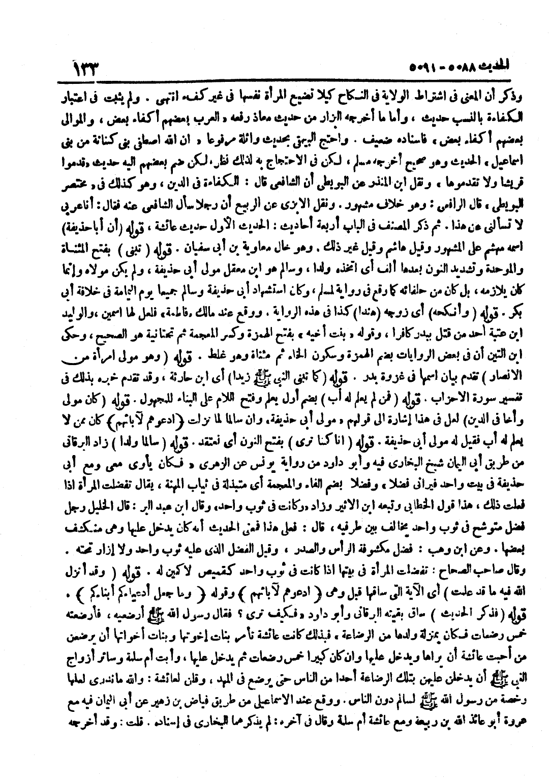 [5088] قَوْلُهُ أَنَّ أَبَا حُذَيْفَة اسْمه مهشم على الْمَشْهُور وَقيل هَاشم وَقِيلَ غَيْرُ ذَلِكَ وَهُوَ خَالُ مُعَاوِيَةَ بْنِ أَبِي سُفْيَانَ قَوْلُهُ تَبَنَّى بِفَتْحِ الْمُثَنَّاةِ وَالْمُوَحَّدَةِ وَتَشْدِيدِ النُّونِ بَعْدَهَا أَلِفٌ أَيِ اتَّخَذَهُ وَلَدًا وَسَالم هُوَ بن مَعْقِلٍ مَوْلَى أَبِي حُذَيْفَةَ وَلَمْ يَكُنْ مَوْلَاهُ وَإِنَّمَا كَانَ يُلَازِمُهُ بَلْ كَانَ مِنْ حُلَفَائِهِ كَمَا وَقَعَ فِي رِوَايَةٍ لِمُسْلِمٍ وَكَانَ اسْتِشْهَادُ أَبِي حُذَيْفَةَ وَسَالِمٍ جَمِيعًا يَوْمَ الْيَمَامَةِ فِي خِلَافَةِ أَبِي بَكْرٍ قَوْلُهُ وَأَنْكَحَهُ أَيْ زَوَّجَهُ هِنْدًا كَذَا فِي هَذِهِ الرِّوَايَةِ وَوَقَعَ عِنْدَ مَالِكٍ فَاطِمَةَ فَلَعَلَّ لَهَا اسْمَيْنِ وَالْوَلِيدُ بْنُ عُتْبَةَ أَحَدُ مَنْ قُتِلَ بِبَدْرٍ كَافِرًا وَقَوْلُهُ بِنْتُ أَخِيهِ بِفَتْحِ الْهَمْزَةِ وَكَسْرِ الْمُعْجَمَةِ ثُمَّ تَحْتَانِيَّة هُوَ الصَّحِيح وَحكى بن التِّينِ أَنَّ فِي بَعْضِ الرِّوَايَاتِ بِضَمِّ الْهَمْزَةِ وَسُكُونِ الْخَاءِ ثُمَّ مُثَنَّاةٍ وَهُوَ غَلَطٌ قَوْلُهُ وَهُوَ مَوْلَى امْرَأَةٍ مِنَ الْأَنْصَارِ تَقَدَّمَ بَيَانُ اسْمِهَا فِي غَزْوَةِ بَدْرٍ قَوْلُهُ كَمَا تَبَنَّى النَّبِيُّ صَلَّى اللَّهُ عَلَيْهِ وَسَلَّمَ زَيْدًا أَيِ بن حَارِثَةَ وَقَدْ تَقَدَّمَ خَبَرُهُ بِذَلِكَ فِي تَفْسِيرِ سُورَةِ الْأَحْزَابِ قَوْلُهُ فَمَنْ لَمْ يُعْلَمْ لَهُ أَبٌ بِضَمِّ أَوَّلِ يُعْلَمُ وَفَتْحِ اللَّامِ عَلَى الْبِنَاءِ لِلْمَجْهُولِ قَوْلُهُ كَانَ مَوْلًى وَأَخًا فِي الدِّينِ لَعَلَّ فِي هَذَا إِشَارَةً إِلَى قَوْلِهِمْ مَوْلَى أَبِي حُذَيْفَةَ وَإِنَّ سَالِمًا لَمَّا نَزَلَتْ ادعوهُمْ لِآبَائِهِمْ كَانَ مِمَّنْ لَا يُعْلَمُ لَهُ أَبٌ فَقِيلَ لَهُ مَوْلَى أَبِي حُذَيْفَةَ قَوْلُهُ إِنَّا كُنَّا نَرَى بِفَتْحِ النُّونِ أَيْ نَعْتَقِدُ قَوْلُهُ سَالِمًا وَلَدًا زَادَ الْبَرْقَانِيُّ مِنْ طَرِيقِ أَبِي الْيَمَانِ شَيْخِ الْبُخَارِيِّ فِيهِ وَأَبُو دَاوُدَ مِنْ رِوَايَةِ يُونُسَ عَنِ الزُّهْرِيِّ فَكَانَ يَأْوِي مَعِي وَمَعَ أَبِي حُذَيْفَةَ فِي بَيْتٍ وَاحِدٍ فَيَرَانِي فُضُلًا وَفُضُلًا بِضَمِّ الْفَاءِ وَالْمُعْجَمَةِ أَيْ مُتَبَذِّلَةً فِي ثِيَابِ الْمِهْنَةِ يُقَالُ تَفَضَّلَتِ الْمَرْأَةُ إِذَا فَعَلَتْ ذَلِك هَذَا قَوْله الْخطابِيّ وَتَبعهُ بن الْأَثِيرِ وَزَادَ وَكَانَتْ فِي ثَوْبٍ وَاحِدٍ وَقَالَ بن عَبْدِ الْبَرِّ قَالَ الْخَلِيلُ رَجُلٌ فُضُلٌ مُتَوَشِّحٌ فِي ثَوْبٍ وَاحِدٍ يُخَالِفُ بَيْنَ طَرَفَيْهِ قَالَ فَعَلَى هَذَا فَمَعْنَى الْحَدِيثِ أَنَّهُ كَانَ يَدْخُلُ عَلَيْهَا وَهِي منكشف بَعْضهَا وَعَن بن وَهْبٍ فُضُلٌ مَكْشُوفَةُ الرَّأْسِ وَالصَّدْرِ وَقِيلَ الْفُضُلُ الَّذِي عَلَيْهِ ثَوْبٌ وَاحِدٌ وَلَا إِزَارَ تَحْتَهُ وَقَالَ صَاحِبُ الصِّحَاحِ تَفَضَّلَتِ الْمَرْأَةُ فِي بَيْتِهَا إِذَا كَانَتْ فِي ثَوْبٍ وَاحِدٍ كَقَمِيصٍ لَا كُمَّيْنِ لَهُ قَوْلُهُ وَقَدْ أَنْزَلَ اللَّهُ فِيهِ مَا قَدْ عَلِمْتَ أَيِ الْآيَةَ الَّتِي سَاقَهَا قبل وَهِي ادعوهُمْ لِآبَائِهِمْ وَقَوله وَمَا جعل ادعياءكم ابناءكم قَوْلُهُ فَذَكَرَ الْحَدِيثَ سَاقَ بَقِيَّتَهُ الْبَرْقَانِيُّ وَأَبُو دَاوُدَ فَكَيْفَ تَرَى فَقَالَ رَسُولُ اللَّهِ صَلَّى اللَّهُ عَلَيْهِ وَسَلَّمَ أَرْضِعِيهِ فَأَرْضَعَتْهُ خَمْسَ رَضَعَاتٍ فَكَانَ بِمَنْزِلَةِ وَلَدِهَا مِنَ الرَّضَاعَةِ فَبِذَلِكَ كَانَتْ عَائِشَةُ تَأْمُرُ بَنَاتِ إِخْوَتِهَا وَبَنَاتِ أَخَوَاتِهَا أَنْ يُرْضِعْنَ مَنْ أَحَبَّتْ عَائِشَةَ أَنْ يَرَاهَا وَيَدْخُلَ عَلَيْهَا وَإِنْ كَانَ كَبِيرًا خَمْسَ رَضَعَاتٍ ثُمَّ يَدْخُلُ عَ