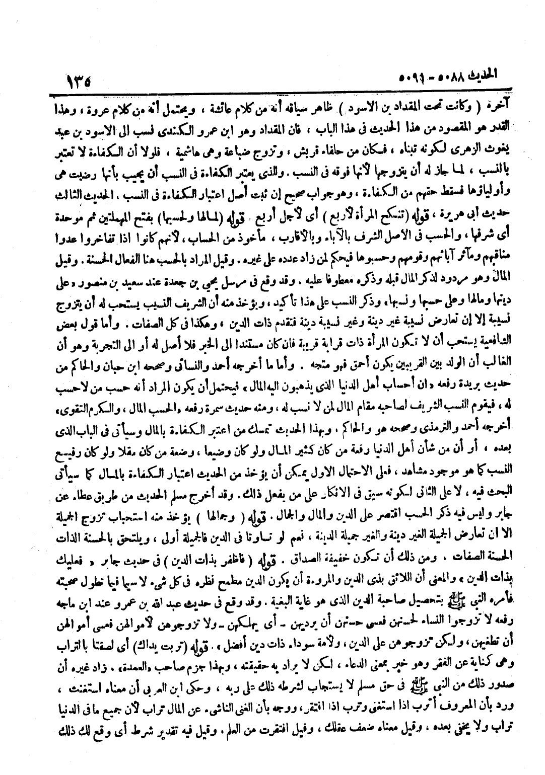 آخِرِهِ وَكَانَتْ تَحْتَ الْمِقْدَادِ بْنِ الْأَسْوَدِ ظَاهِرُ سِيَاقِهِ أَنَّهُ مِنْ كَلَامِ عَائِشَةَ وَيَحْتَمِلُ أَنَّهُ مِنْ كَلَامِ عُرْوَةَ وَهَذَا الْقَدْرُ هُوَ الْمَقْصُودُ مِنْ هَذَا الْحَدِيثِ فِي هَذَا الْبَابِ فَانَّ الْمِقْدَاد وَهُوَ بن عَمْرٍو الْكِنْدِيُّ نُسِبَ إِلَى الْأَسْوَدِ بْنِ عَبْدِ يَغُوثَ الزُّهْرِيِّ لِكَوْنِهِ تَبَنَّاهُ فَكَانَ مِنْ حُلَفَاءِ قُرَيْشٍ وَتَزَوَّجَ ضُبَاعَةَ وَهِيَ هَاشِمِيَّةٌ فَلَوْلَا أَنَّ الْكَفَاءَةَ لَا تُعْتَبَرُ بِالنَّسَبِ لَمَا جَازَ لَهُ أَنْ يَتَزَوَّجَهَا لِأَنَّهَا فَوْقَهُ فِي النَّسَبِ وَلِلَّذِي يَعْتَبِرُ الْكَفَاءَةَ فِي النَّسَبِ أَنْ يُجِيبَ بِأَنَّهَا رَضِيَتْ هِيَ وَأَوْلِيَاؤُهَا فَسَقَطَ حَقُّهُمْ مِنَ الْكَفَاءَةِ وَهُوَ جَوَابٌ صَحِيحٌ إِنْ ثَبَتَ أَصْلُ اعْتِبَارِ الْكَفَاءَةِ فِي النَّسَبِ الْحَدِيثُ الثَّالِثُ حَدِيثُ أَبِي هُرَيْرَةَ