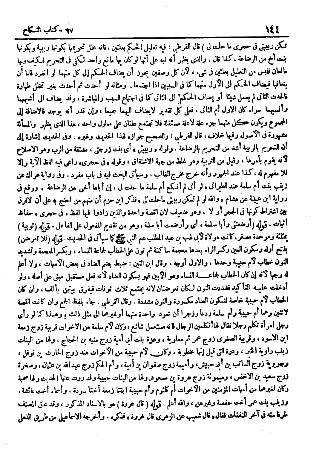 تَكُنْ رَبِيبَتِي فِي حِجْرِي مَا حَلَّتْ لِي قَالَ الْقُرْطُبِيُّ فِيهِ تَعْلِيلُ الْحُكْمِ بِعِلَّتَيْنِ فَإِنَّهُ عَلَّلَ تَحْرِيمَهَا بِكَوْنِهَا رَبِيبَةً وَبِكَوْنِهَا بِنْتَ أَخٍ مِنَ الرَّضَاعَةِ كَذَا قَالَ وَالَّذِي يَظْهَرُ أَنَّهُ نَبَّهَ عَلَى أَنَّهَا لَوْ كَانَ بِهَا مَانِعٌ وَاحِد لكفى فِي التَّحْرِيم فَكيف وَبهَا العان فَلَيْسَ مِنَ التَّعْلِيلِ بِعِلَّتَيْنِ فِي شَيْءٍ لِأَنَّ كُلَّ وَصْفَيْنِ يَجُوزُ أَنْ يُضَافَ الْحُكْمُ إِلَى كُلٍّ مِنْهُمَا لَوِ انْفَرَدَ فَإِمَّا أَنْ يَتَعَاقَبَا فَيُضَافُ الْحُكْمُ إِلَى الْأَوَّلِ مِنْهُمَا كَمَا فِي السَّبَبَيْنِ إِذَا اجْتَمَعَا وَمِثَالُهُ لَوْ أَحْدَثَ ثُمَّ أَحْدَثَ بِغَيْرِ تَخَلُّلِ طَهَارَةٍ فَالْحَدَثُ الثَّانِي لَمْ يَعْمَلْ شَيْئًا أَوْ يُضَافُ الْحُكْمُ إِلَى الثَّانِي كَمَا فِي اجْتِمَاعِ السَّبَبِ وَالْمُبَاشَرَةِ وَقَدْ يُضَافُ إِلَى أَشْبَهِهِمَا وَأَنْسَبِهِمَا سَوَاءٌ كَانَ الْأَوَّلَ أَمِ الثَّانِيَ فَعَلَى كُلِّ تَقْدِيرٍ لَا يُضَافُ إِلَيْهِمَا جَمِيعًا وَإِنْ قُدِّرَ أَنَّهُ يُوجَدُ فَالْإِضَافَةُ إِلَى الْمَجْمُوعِ وَيَكُونُ كُلٌّ مِنْهُمَا جُزْءَ عِلَّةٍ لَا عِلَّةً مُسْتَقِلَّةً فَلَا تَجْتَمِعُ عِلَّتَانِ عَلَى مَعْلُولٍ وَاحِدٍ هَذَا الَّذِي يَظْهَرُ وَالْمَسْأَلَةُ مَشْهُورَةٌ فِي الْأُصُولِ وَفِيهَا خِلَافٌ قَالَ الْقُرْطُبِيُّ وَالصَّحِيحُ جَوَازُهُ لِهَذَا الْحَدِيثِ وَغَيْرِهِ وَفِي الْحَدِيثِ إِشَارَةٌ إِلَى أَنَّ التَّحْرِيمَ بِالرَّبِيبَةِ أَشَدُّ مِنَ التَّحْرِيمِ بِالرَّضَاعَةِ وَقَوْلُهُ رَبِيبَتِي أَيْ بِنْتُ زَوْجَتِي مُشْتَقَّةٌ مِنَ الرَّبِّ وَهُوَ الْإِصْلَاحُ لِأَنَّهُ يَقُومُ بِأَمْرِهَا وَقِيلَ مِنَ التَّرْبِيَةِ وَهُوَ غَلَطٌ مِنْ جِهَةِ الِاشْتِقَاقِ وَقَوْلُهُ فِي حِجْرِي رَاعَى فِيهِ لَفْظَ الْآيَةِ وَإِلَّا فَلَا مَفْهُومَ لَهُ كَذَا عِنْدَ الْجُمْهُورِ وَأَنَّهُ خَرَجَ مَخْرَجَ الْغَالِبِ وَسَيَأْتِي الْبَحْثُ فِيهِ فِي بَابٍ مُفْرَدٍ وَفِي رِوَايَةِ عِرَاكٍ عَنْ زَيْنَبَ بِنْتِ أُمِّ سَلَمَةَ عِنْدَ الطَّبَرَانِيِّ لَوْ أَنِّي لَمْ أَنْكِحْ أُمَّ سَلَمَةَ مَا حَلَّتْ لِي إِنَّ أَبَاهَا أَخِي مِنَ الرَّضَاعَةِ وَوَقَعَ فِي رِوَايَة بن عُيَيْنَةَ عَنْ هِشَامٍ وَاللَّهِ لَوْ لَمْ تَكُنْ ربيبتي مَا حلت لي فَذكر بن حَزْمٍ أَنَّ مِنْهُمْ مَنِ احْتَجَّ بِهِ عَلَى أَنْ لَا فَرْقَ بَيْنَ اشْتِرَاطِ كَوْنِهَا فِي الْحَجْرِ أَوْ لَا وَهُوَ ضَعِيفٌ لِأَنَّ الْقِصَّةَ وَاحِدَةٌ وَالَّذِينَ زَادُوا فِيهَا لَفْظَ فِي حِجْرِي حُفَّاظٌ أَثَبَاتٌ قَوْلُهُ أَرْضَعَتْنِي وَأَبَا سَلَمَةَ أَيْ وأرضعت أَبَا سَلَمَةَ وَهُوَ مِنْ تَقْدِيمِ الْمَفْعُولِ عَلَى الْفَاعِل قَوْله ثويبة بمثلثة وموحدة مصغر كَانَتْ مَوْلَاةً لِأَبِي لَهَبِ بْنِ عَبْدِ الْمُطَّلِبِ عَمُّ النَّبِيِّ صَلَّى اللَّهُ عَلَيْهِ وَسَلَّمَ كَمَا سَيَأْتِي فِي الْحَدِيثِ قَوْلُهُ فَلَا تَعْرِضْنَ بِفَتْحِ أَوَّلِهِ وَسُكُونِ الْعَيْنِ وَكَسْرِ الرَّاءِ بَعْدَهَا مُعْجَمَةٌ سَاكِنَةٌ ثُمَّ نُونٌ عَلَى الْخِطَابِ لِجَمَاعَةِ النِّسَاءِ وَبِكَسْرِ الْمُعْجَمَةِ وَتَشْدِيدِ النُّونِ خِطَابٌ لِأُمِّ حَبِيبَةَ وَحدهَا وَالْأول أوجه وَقَالَ بن التِّينِ ضُبِطَ بِضَمِّ الضَّادِ فِي بَعْضِ الْأُمَّهَاتِ وَلَا أَعْلَمُ لَهُ وَجْهًا لِأَنَّهُ إِنْ كَانَ الْخِطَابُ لِجَمَاعَةِ النِّسَاءِ وَهُوَ الْأَبْيَنُ فَهُوَ بِسُكُونِ الضَّادِ لِأَنَّهُ فِعْلٌ مُسْتَقْبَلٌ مَبْنِيٌّ عَلَى أَصْلِهِ وَلَوْ أَدْخَلْتَ عَلَيْهِ التَّأْكِيدَ فَشَدَّدْتَ النُّونَ لَكَانَ تَعْرِضَنَانِّ لِأَنَّهُ يَجْتَمِعُ ثَ