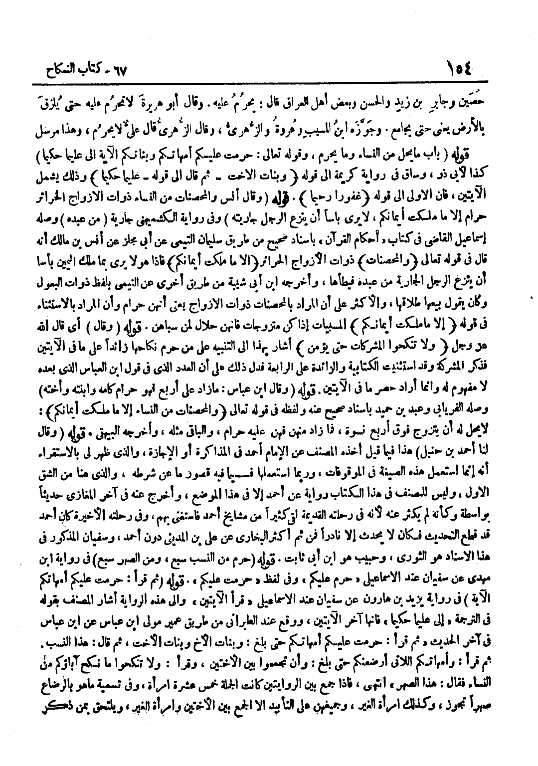 وَقَوْلُهُ تَعَالَى حُرِّمَتْ عَلَيْكُمْ أُمَّهَاتُكُمْ وَبَنَاتُكُمْ الْآيَةَ إِلَى عَلِيمًا حَكِيمًا كَذَا لِأَبِي ذَرٍّ وَسَاقَ فِي رِوَايَةِ كَرِيمَةَ إِلَى قَوْلِهِ وَبَنَاتُ الْأُخْتِ ثُمَّ قَالَ إِلَى قَوْلِهِ عَلِيمًا حَكِيمًا وَذَلِكَ يَشْمَل الْآيَتَيْنِ فَإِن الأولى إِلَى قَوْلِهِ غَفُورًا رَحِيمًا قَوْلُهُ وَقَالَ أَنَسٌ وَالْمُحْصَنَاتُ مِنَ النِّسَاءِ ذَوَاتِ الْأَزْوَاجِ الْحَرَائِرِ حَرَامٌ إِلَّا مَا مَلَكَتْ أَيْمَانُكُمْ لَا يَرَى بَأْسًا أَنْ يَنْزِعَ الرَّجُلُ جَارِيَتَهُ وَفِي رِوَايَةِ الْكُشْمِيهَنِيِّ جَارِيَةً مِنْ عَبْدِهِ وَصَلَهُ إِسْمَاعِيلُ الْقَاضِي فِي كِتَابِ أَحْكَامِ الْقُرْآنِ بِإِسْنَادٍ صَحِيحٍ مِنْ طَرِيقِ سُلَيْمَانَ التَّيْمِيِّ عَنْ أَبِي مِجْلَزٍ عَنْ أَنَسِ بْنِ مَالِكٍ أَنَّهُ قَالَ فِي قَوْلِهِ تَعَالَى وَالْمُحْصَنَاتُ ذَوَاتُ الْأَزْوَاجِ الْحَرَائِرِ إِلَّا مَا مَلَكَتْ أَيْمَانكُم فَإِذَا هُوَ لَا يَرَى بِمَا مَلَكَ الْيَمِينُ بَأْسًا أَنْ يَنْزِعَ الرَّجُلُ الْجَارِيَةَ مِنْ عَبْدِهِ فيطأها وَأخرجه بن أَبِي شَيْبَةَ مِنْ طَرِيقٍ أُخْرَى عَنِ التَّيْمِيِّ بِلَفْظِ ذَوَاتِ الْبُعُولِ وَكَانَ يَقُولُ بَيْعُهَا طَلَاقُهَا وَالْأَكْثَرُ عَلَى أَنَّ الْمُرَادَ بِالْمُحْصَنَاتِ ذَوَاتُ الْأَزْوَاجِ يَعْنِي أَنَّهُنَّ حَرَامٌ وَأَنَّ الْمُرَادَ بِالِاسْتِثْنَاءِ فِي قَوْله الا مَا ملكت ايمانكم الْمَسْبِيَّاتُ إِذَا كُنَّ مُتَزَوِّجَاتٍ فَإِنَّهُنَّ حَلَالٌ لِمَنْ سَبَاهُنَّ قَوْلُهُ وَقَالَ أَيْ قَالَ اللَّهُ عَزَّ وَجل وَلَا تنْكِحُوا المشركات حَتَّى يُؤمن أَشَارَ بِهَذَا إِلَى التَّنْبِيهِ عَلَى مَنْ حَرُمَ نِكَاحُهَا زَائِدًا عَلَى مَا فِي الْآيَتَيْنِ فَذَكَرَ الْمُشْرِكَةَ وَقَدِ اسْتُثْنِيَتِ الْكِتَابِيَّةُ وَالزَّائِدَةُ عَلَى الرَّابِعَةِ فَدَلَّ ذَلِكَ عَلَى أَنَّ الْعَدَدَ الَّذِي فِي قَول بن الْعَبَّاسِ الَّذِي بَعْدَهُ لَا مَفْهُومَ لَهُ وَإِنَّمَا أَرَادَ حَصْرَ مَا فِي الْآيَتَيْنِ قَوْلُهُ وَقَالَ بن عَبَّاسٍ مَا زَادَ عَلَى أَرْبَعٍ فَهُوَ حَرَامٌ كَأُمِّهِ وَابْنَتِهِ وَأُخْتِهِ وَصَلَهُ الْفِرْيَابِيُّ وَعَبْدُ بْنُ حُمَيْدٍ بِإِسْنَادٍ صَحِيحٍ عَنْهُ وَلَفْظُهُ فِي قَوْلِهِ تَعَالَى وَالْمُحْصَنَاتُ مِنَ النِّسَاءِ إِلَّا مَا مَلَكَتْ ايمانكم لَا يَحِلُّ لَهُ أَنْ يَتَزَوَّجَ فَوْقَ أَرْبَعِ نسْوَة فَمَا زَاد مِنْهُنَّ فهن عَلَيْهِ حَرَامٌ وَالْبَاقِي مِثْلُهُ وَأَخْرَجَهُ الْبَيْهَقِيُّ قَوْلُهُ وَقَالَ لَنَا أَحْمَدُ بْنُ حَنْبَلٍ هَذَا فِيمَا قِيلَ أَخَذَهُ الْمُصَنِّفُ عَنِ الْإِمَامِ أَحْمَدَ فِي الْمُذَاكَرَةِ أَوِ الْإِجَازَةِ وَالَّذِي ظَهَرَ لِي بِالِاسْتِقْرَاءِ أَنَّهُ إِنَّمَا اسْتَعْمَلَ هَذِهِ الصِّيغَةَ فِي الْمَوْقُوفَاتِ وَرُبَّمَا اسْتَعْمَلَهَا فِيمَا فِيهِ قُصُورٌ مَا عَنْ شَرْطِهِ وَالَّذِي هُنَا مِنَ الشِّقِّ الْأَوَّلِ وَلَيْسَ لِلْمُصَنِّفِ فِي هَذَا الْكِتَابِ رِوَايَةٌ عَنْ أَحْمَدَ إِلَّا فِي هَذَا الْمَوْضِعِ وَأَخْرَجَ عَنْهُ فِي آخِرِ الْمَغَازِي حَدِيثًا بِوَاسِطَةٍ وَكَأَنَّهُ لَمْ يُكْثِرْ عَنْهُ لِأَنَّهُ فِي رِحْلَتِهِ الْقَدِيمَةِ لَقِيَ كَثِيرًا مِنْ مَشَايِخِ أَحْمَدَ فَاسْتَغْنَى بِهِمْ وَفِي رِحْلَتِهِ الْأَخِيرَةِ كَانَ أَحْمَدُ قَدْ قَطَعَ التَّحْدِيثَ فَكَانَ لَا يُحَدِّثُ إِلَّا نَادِرًا فَمِنْ ثَمَّ أَكْثَرَ الْبُخَارِيُّ عَنْ عَلِيِّ بْنِ الْمَدِينِيِّ دُونَ أَحْمَدَ وَسُفْيَانُ الْمَذْكُورُ فِي هَذَا الْإِسْنَادِ هُوَ الثَّوْرِيُّ وحبِيب هُوَ بن أَبِي ثَابِتٍ قَوْلُهُ حَرُمَ مِنَ النَّسَبِ سَبْعٌ وَمِنَ الصِّهْرِ سَبْعٌ ف