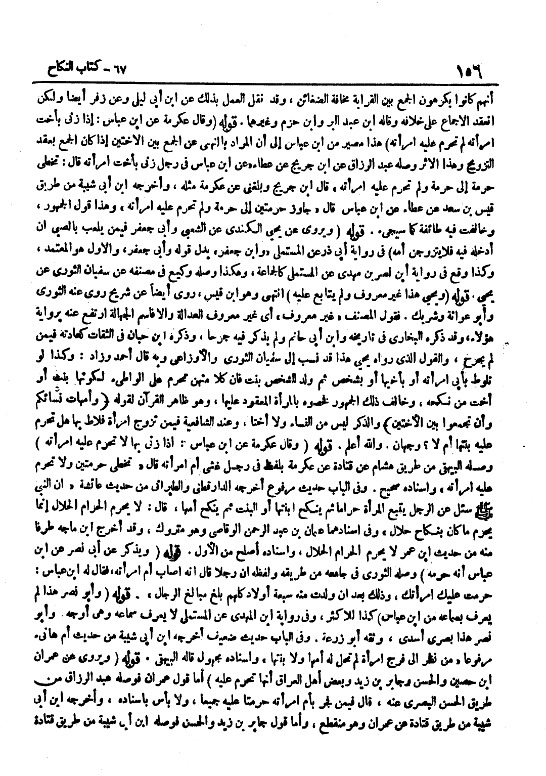 أَنَّهُمْ كَانُوا يَكْرَهُونَ الْجَمْعَ بَيْنَ الْقَرَابَةِ مَخَافَةَ الضغائن وَقد نقل الْعَمَل بذلك عَن بن أَبِي لَيْلَى وَعَنْ زُفَرَ أَيْضًا وَلَكِنِ انْعَقَدَ الْإِجْمَاع على خلَافَة وَقَالَهُ بن عبد الْبر وبن حزم وَغَيرهمَا قَوْله وَقَالَ عِكْرِمَة عَن بن عَبَّاس إِذا زنى بأخت امْرَأَته لم تحرم عَلَيْهِ امْرَأَته هَذَا مصير من بن عَبَّاسٍ إِلَى أَنَّ الْمُرَادَ بِالنَّهْيِ عَنِ الْجَمْعِ بَيْنَ الْأُخْتَيْنِ إِذَا كَانَ الْجَمْعُ بِعَقْدِ التَّزْوِيجِ وَهَذَا الْأَثر وَصله عبد الرَّزَّاق عَن بن جريج عَن عَطاء عَن بن عَبَّاسٍ فِي رَجُلٍ زَنَى بِأُخْتِ امْرَأَتِهِ قَالَ تَخَطَّى حُرْمَةً إِلَى حُرْمَةٍ وَلَمْ تَحْرُمْ عَلَيْهِ امْرَأَته قَالَ بن جريج وَبَلغنِي عَن عِكْرِمَة مثله وَأخرجه بن أَبِي شَيْبَةَ مِنْ طَرِيقِ قَيْسِ بْنِ سَعْدٍ عَنْ عَطَاءٍ عَن بن عَبَّاسٍ قَالَ جَاوَزَ حُرْمَتَيْنِ إِلَى حُرْمَةٍ وَلَمْ تَحْرُمْ عَلَيْهِ امْرَأَتُهُ وَهَذَا قَوْلُ الْجُمْهُورِ وَخَالَفَتْ فِيهِ طَائِفَةٌ كَمَا سَيَجِيءُ قَوْلُهُ وَيُرْوَى عَنْ يحيى الْكِنْدِيّ عَن الشّعبِيّ وَأبي جَعْفَر فِيمَن يَلْعَبُ بِالصَّبِيِّ إِنْ أَدْخَلَهُ فِيهِ فَلَا يَتَزَوَّجَنَّ أُمَّهُ فِي رِوَايَةِ أَبِي ذَرٍّ عَنِ الْمُسْتَمْلِي وبن جَعْفَرٍ يَدُلُّ قَوْلُهُ وَأَبِي جَعْفَرٍ وَالْأَوَّلُ هُوَ الْمُعْتَمد وَكَذَا وَقع فِي رِوَايَة بن نَصْرِ بْنِ مَهْدِيٍّ عَنِ الْمُسْتَمْلِي كَالْجَمَاعَةِ وَهَكَذَا وَصَلَهُ وَكِيعٌ فِي مُصَنَّفِهِ عَنْ سُفْيَانَ الثَّوْرِيِّ عَنْ يَحْيَى قَوْلُهُ وَيَحْيَى هَذَا غَيْرُ مَعْرُوفٍ وَلم يُتَابع عَلَيْهِ انْتهى وَهُوَ بن قَيْسٍ رَوَى أَيْضًا عَنْ شُرَيْحٍ رَوَى عَنْهُ الثَّوْرِيُّ وَأَبُو عَوَانَةَ وَشَرِيكٌ فَقَوْلُ الْمُصَنِّفِ غَيْرُ مَعْرُوفٍ أَيْ غَيْرُ مَعْرُوفِ الْعَدَالَةِ وَإِلَّا فَاسْمُ الْجَهَالَةِ ارْتَفَعَ عَنْهُ بِرِوَايَةِ هَؤُلَاءِ وَقَدْ ذَكَرَهُ البُخَارِيّ فِي تَارِيخه وبن أَبِي حَاتِمٍ وَلَمْ يَذْكُرْ فِيهِ جَرْحًا وَذَكَرَهُ بن حِبَّانَ فِي الثِّقَاتِ كَعَادَتِهِ فِيمَنْ لَمْ يُجَرَّحْ وَالْقَوْلُ الَّذِي رَوَاهُ يَحْيَى هَذَا قَدْ نُسِبَ إِلَى سُفْيَانَ الثَّوْرِيِّ وَالْأَوْزَاعِيِّ وَبِهِ قَالَ أَحْمَدُ وَزَادَ وَكَذَا لَوْ تَلَوَّطَ بِأَبِي امْرَأَتِهِ أَوْ بِأَخِيهَا أَوْ بِشَخْصٍ ثُمَّ وُلِدَ لِلشَّخْصِ بِنْتٌ فَإِن كلا مِنْهُنَّ تحرم على الواطيء لِكَوْنِهَا بِنْتَ أَوْ أُخْتَ مَنْ نَكَحَهُ وَخَالَفَ ذَلِكَ الْجُمْهُورُ فَخَصُّوهُ بِالْمَرْأَةِ الْمَعْقُودِ عَلَيْهَا وَهُوَ ظَاهر الْقُرْآن لقَوْله وَأُمَّهَات نِسَائِكُم وَأَن تجمعُوا بَين الاختين وَالذَّكَرُ لَيْسَ مِنَ النِّسَاءِ وَلَا أُخْتًا وَعِنْدَ الشَّافِعِيَّةِ فِيمَنْ تَزَوَّجَ امْرَأَةً فَلَاطَ بِهَا هَلْ تَحْرُمُ عَلَيْهِ بِنْتُهَا أَمْ لَا وَجْهَانِ وَاللَّهُ أعلم قَوْله وَقَالَ عِكْرِمَة عَن بن عَبَّاسٍ إِذَا زَنَى بِهَا لَا تَحْرُمُ عَلَيْهِ امْرَأَتُهُ وَصَلَهُ الْبَيْهَقِيُّ مِنْ طَرِيقِ هِشَامٍ عَنْ قَتَادَةَ عَنْ عِكْرِمَةَ بِلَفْظِ فِي رَجُلٍ غَشِيَ أُمَّ امْرَأَتِهِ قَالَ تَخَطَّى حُرْمَتَيْنِ وَلَا تَحْرُمُ عَلَيْهِ امْرَأَتُهُ وَإِسْنَادُهُ صَحِيحٌ وَفِي الْبَابِ حَدِيثٌ مَرْفُوعٌ أَخْرَجَهُ الدَّارَقُطْنِيُّ وَالطَّبَرَانِيُّ مِنْ حَدِيثَ عَائِشَةَ أَنَّ النَّبِيَّ صَلَّى اللَّهُ عَلَيْهِ وَسَلَّمَ سُئِلَ عَنِ الرَّجُلِ يَتْبَعُ الْمَرْأَةَ حَرَامًا ثُمَّ يَنْكِحُ ابْنَتَهَا أَوِ الْبِنْتُ ثُمَّ يَنْكِحُ أُمَّهَا قَالَ لَا يُحَرِّمُ الْحَرَامُ الْحَلَالَ إِنَّمَا يُحَرِّمُ مَا كَانَ بِنِكَاحٍ حَلَالٍ وَفِي إِسْنَادِهِمَا عُثْمَانُ بْنُ