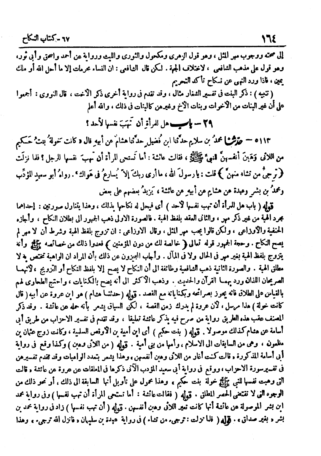 [5113] قَوْله حَدثنَا هِشَام هُوَ بن عُرْوَةَ عَنْ أَبِيهِ قَالَ كَانَتْ خَوْلَةُ هَذَا مُرْسَلٌ لِأَنَّ عُرْوَةَ لَمْ يُدْرِكِ زَمَنَ الْقِصَّةِ لَكِنَّ السِّيَاقَ يُشْعِرُ بِأَنَّهُ حَمَلَهُ عَنْ عَائِشَةَ وَقَدْ ذَكَرَ الْمُصَنِّفُ عَقِبَ هَذِهِ الطَّرِيقِ رِوَايَةَ مَنْ صَرَّحَ فِيهِ بِذِكْرِ عَائِشَةَ تَعْلِيقًا وَقَدْ تَقَدَّمَ فِي تَفْسِيرِ الْأَحْزَابِ مِنْ طَرِيقِ أَبِي أُسَامَةَ عَنْ هِشَامٍ كَذَلِكَ مَوْصُولًا قَوْلُهُ بِنْتُ حَكِيم أَي بن أُمَيَّةَ بْنِ الْأَوْقَصِ السِّلَمِيَّةُ وَكَانَتْ زَوْجَ عُثْمَانَ بْنِ مَظْعُونٍ وَهِيَ مِنَ السَّابِقَاتِ إِلَى الْإِسْلَامِ وَأُمُّهَا مِنْ بَنِي أُمَيَّةَ قَوْلُهُ مِنَ اللَّائِي وَهَبْنَ وَكَذَا وَقَعَ فِي رِوَايَةِ أَبِي أُسَامَةَ الْمَذْكُورَةِ قَالَتْ كُنْتُ أَغَارُ مِنَ اللَّائِي وَهَبْنَ أَنْفُسَهُنَّ وَهَذَا يُشْعِرُ بِتَعَدُّدِ الْوَاهِبَاتِ وَقَدْ تَقَدَّمَ تَفْسِيرُهُنَّ فِي تَفْسِيرِ سُورَةِ الْأَحْزَابِ وَوَقَعَ فِي رِوَايَةِ أَبِي سَعِيدٍ الْمُؤَدِّبِ الْآتِي ذِكْرُهَا فِي الْمُعَلَّقَاتِ عَنْ عُرْوَةَ عَنْ عَائِشَةَ قَالَتِ الَّتِي وَهَبَتْ نَفْسَهَا لِلنَّبِيِّ صَلَّى اللَّهُ عَلَيْهِ وَسَلَّمَ خَوْلَةُ بِنْتُ حَكِيمٍ وَهَذَا مَحْمُولٌ عَلَى تَأْوِيلِ أَنَّهَا السَّابِقَةُ إِلَى ذَلِكَ أَوْ نَحْوِ ذَلِكَ مِنَ الْوُجُوهِ الَّتِي لَا تَقْتَضِي الْحَصْرَ الْمُطْلَقَ قَوْلُهُ فَقَالَتْ عَائِشَةُ أَمَا تَسْتَحِي الْمَرْأَةُ أَنْ تَهَبَ نَفْسَهَا وَفِي رِوَايَةِ مُحَمَّدِ بْنِ بِشْرٍ الْمَوْصُولَةِ عَنْ عَائِشَةَ أَنَّهَا كَانَتْ تُعَيِّرُ اللَّائِي وَهَبْنَ أَنْفُسَهُنَّ قَوْلُهُ أَنْ تَهَبَ نَفْسَهَا زَادَ فِي رِوَايَةِ مُحَمَّدِ بْنِ بِشْرٍ بِغَيْرِ صَدَاقٍ قَوْله فَلَمَّا نزلت ترجئ من تشَاء فِي رِوَايَةِ عَبَدَةَ بْنِ سُلَيْمَانَ فَأَنْزَلَ اللَّهُ ترجئ وَهَذَا