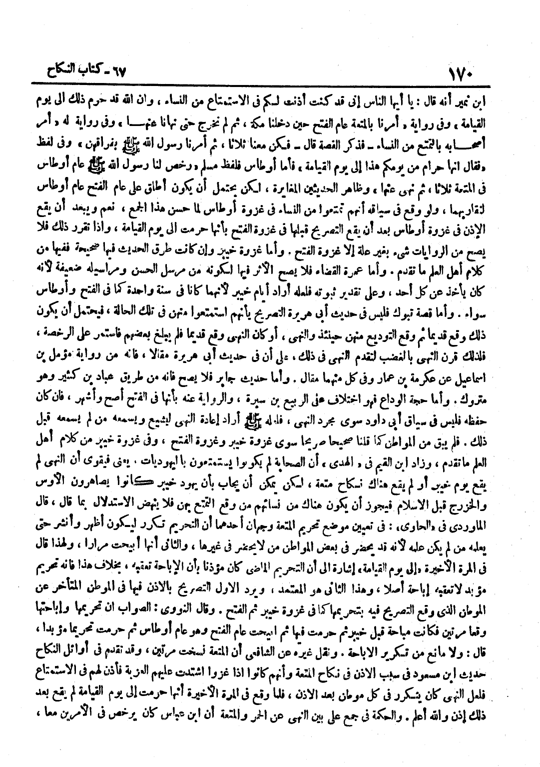 بن نُمَيْرٍ أَنَّهُ قَالَ يَا أَيُّهَا النَّاسُ إِنِّي قَدْ كُنْتُ أَذِنْتُ لَكُمْ فِي الِاسْتِمْتَاعِ مِنَ النِّسَاءِ وَأَنَّ اللَّهَ قَدْ حَرَّمَ ذَلِكَ إِلَى يَوْمِ الْقِيَامَةِ وَفِي رِوَايَةِ أَمَرَنَا بِالْمُتْعَةِ عَامَ الْفَتْحِ حِينَ دَخَلْنَا مَكَّةَ ثُمَّ لَمْ نَخْرُجْ حَتَّى نَهَانَا عَنْهَا وَفِي رِوَايَةٍ لَهُ أَمَرَ أَصْحَابَهُ بِالتَّمَتُّعِ مِنَ النِّسَاءِ فَذَكَرَ الْقِصَّةَ قَالَ فَكُنَّ مَعَنَا ثَلَاثًا ثُمَّ أَمَرَنَا رَسُولُ اللَّهِ صَلَّى اللَّهُ عَلَيْهِ وَسَلَّمَ بِفِرَاقِهِنَّ وَفِي لَفْظٍ فَقَالَ إِنَّهَا حَرَامٌ مِنْ يَوْمِكُمْ هَذَا إِلَى يَوْمِ الْقِيَامَةِ فَأَمَّا أَوْطَاسُ فَلَفْظُ مُسْلِمٍ رَخَّصَ لَنَا رَسُولُ اللَّهِ صَلَّى اللَّهُ عَلَيْهِ وَسَلَّمَ عَامَ أَوْطَاسَ فِي الْمُتْعَةِ ثَلَاثًا ثُمَّ نَهَى عَنْهَا وَظَاهِرُ الْحَدِيثَيْنِ الْمُغَايَرَةُ لَكِنْ يَحْتَمِلُ أَنْ يَكُونَ أَطْلَقَ عَلَى عَامِ الْفَتْحِ عَامَ أَوْطَاسَ لِتُقَارِبِهُمَا وَلَوْ وَقَعَ فِي سِيَاقِهِ أَنَّهُمْ تَمَتَّعُوا مِنَ النِّسَاءِ فِي غَزْوَةِ أَوْطَاسَ لَمَّا حَسُنَ هَذَا الْجَمْعُ نَعَمْ وَيَبْعُدُ أَنْ يَقَعَ الْإِذْنُ فِي غَزْوَةِ أَوْطَاسَ بَعْدَ أَنْ يَقَعَ التَّصْرِيحُ قَبْلَهَا فِي غَزْوَةِ الْفَتْحِ بِأَنَّهَا حَرُمَتْ إِلَى يَوْمِ الْقِيَامَةِ وَإِذَا تَقَرَّرَ ذَلِكَ فَلَا يَصِحُّ مِنَ الرِّوَايَاتِ شَيْءٌ بِغَيْرِ عِلَّةٍ إِلَّا غَزْوَةُ الْفَتْحِ وَأَمَّا غَزْوَةُ خَيْبَرَ وَإِنْ كَانَتْ طُرُقُ الْحَدِيثِ فِيهَا صَحِيحَةً فَفِيهَا مِنْ كَلَامِ أَهْلِ الْعِلْمِ مَا تَقَدَّمَ وَأَمَّا عُمْرَةُ الْقَضَاءِ فَلَا يَصِحُّ الْأَثَرُ فِيهَا لِكَوْنِهِ مِنْ مُرْسَلِ الْحَسَنِ وَمَرَاسِيلُهُ ضَعِيفَةٌ لِأَنَّهُ كَانَ يَأْخُذُ عَنْ كُلِّ أَحَدٍ وَعَلَى تَقْدِيرِ ثُبُوتِهِ فَلَعَلَّهُ أَرَادَ أَيَّامَ خَيْبَر لِأَنَّهُمَا كَانَا فِي سنة وَاحِدَة كَمَا فِي الْفَتْحِ وَأَوْطَاسُ سَوَاءً وَأَمَّا قِصَّةُ تَبُوكُ فَلَيْسَ فِي حَدِيثِ أَبِي هُرَيْرَةَ التَّصْرِيحُ بِأَنَّهُمُ اسْتَمْتَعُوا مِنْهُنَّ فِي تِلْكَ الْحَالَةِ فَيَحْتَمِلُ أَنْ يَكُونَ ذَلِكَ وَقَعَ قَدِيمًا ثُمَّ وَقَعَ التَّوْدِيعُ مِنْهُنَّ حِينَئِذٍ وَالنَّهْيُ أَوْ كَانَ النَّهْيُ وَقَعَ قَدِيمًا فَلَمْ يَبْلُغْ بَعْضُهُمْ فَاسْتَمَرَّ عَلَى الرُّخْصَةِ فَلِذَلِكَ قَرَنَ النَّهْيَ بِالْغَضَبِ لِتَقَدُّمِ النَّهْيِ فِي ذَلِكَ عَلَى أَنَّ فِي حَدِيثِ أَبِي هُرَيْرَةَ مَقَالًا فَإِنَّهُ مِنْ رِوَايَةِ مُؤَمِّلَ بْنِ إِسْمَاعِيلَ عَنْ عِكْرِمَةَ بْنِ عَمَّارٍ وَفِي كُلٍّ مِنْهُمَا مَقَالٌ وَأَمَّا حَدِيثُ جَابِرٍ فَلَا يَصِحُّ فَإِنَّهُ مِنْ طَرِيقِ عَبَّادِ بْنِ كَثِيرٍ وَهُوَ مَتْرُوكٌ وَأَمَّا حَجَّةُ الْوَدَاعِ فَهُوَ اخْتِلَافٌ عَلَى الرَّبِيعِ بْنِ سَبْرَةَ وَالرِّوَايَةُ عَنْهُ بِأَنَّهَا فِي الْفَتْحِ أَصَحُّ وَأَشْهَرُ فَإِنْ كَانَ حَفِظَهُ فَلَيْسَ فِي سِيَاقِ أَبِي دَاوُدَ سِوَى مُجَرَّدِ النَّهْيِ فَلَعَلَّهُ صَلَّى اللَّهُ عَلَيْهِ وَسَلَّمَ أَرَادَ إِعَادَةَ النَّهْيِ لِيَشِيعَ وَيَسْمَعَهُ مَنْ لَمْ يَسْمَعْهُ قَبْلَ ذَلِكَ فَلَمْ يَبْقَ مِنَ الْمَوَاطِنِ كَمَا قُلْنَا صَحِيحًا صَرِيحًا سِوَى غَزْوَةِ خَيْبَرَ وَغَزْوَةِ الْفَتْحِ وَفِي غَزْوَةِ خَيْبَرَ مِنْ كَلَامِ أَهْلِ الْعِلْمِ مَا تقدم وَزَاد بن الْقَيِّمِ فِي الْهَدْيِ أَنَّ الصَّحَابَةَ لَمْ يَكُونُوا يَسْتَمْتِعُونَ بِالْيَهُودِيَّاتِ يَعْنِي فَيَقْوَى أَنَّ النَّهْيَ لَمْ يَقَعْ يَوْمَ خَيْبَرَ أَوْ لَمْ يَقَعْ هُنَاكَ نِكَاحُ مُتْعَةٍ لَكِنْ يُمْكِنُ أَنْ يُجَابَ بِأَنَّ يَهُودَ خَيْبَرَ 