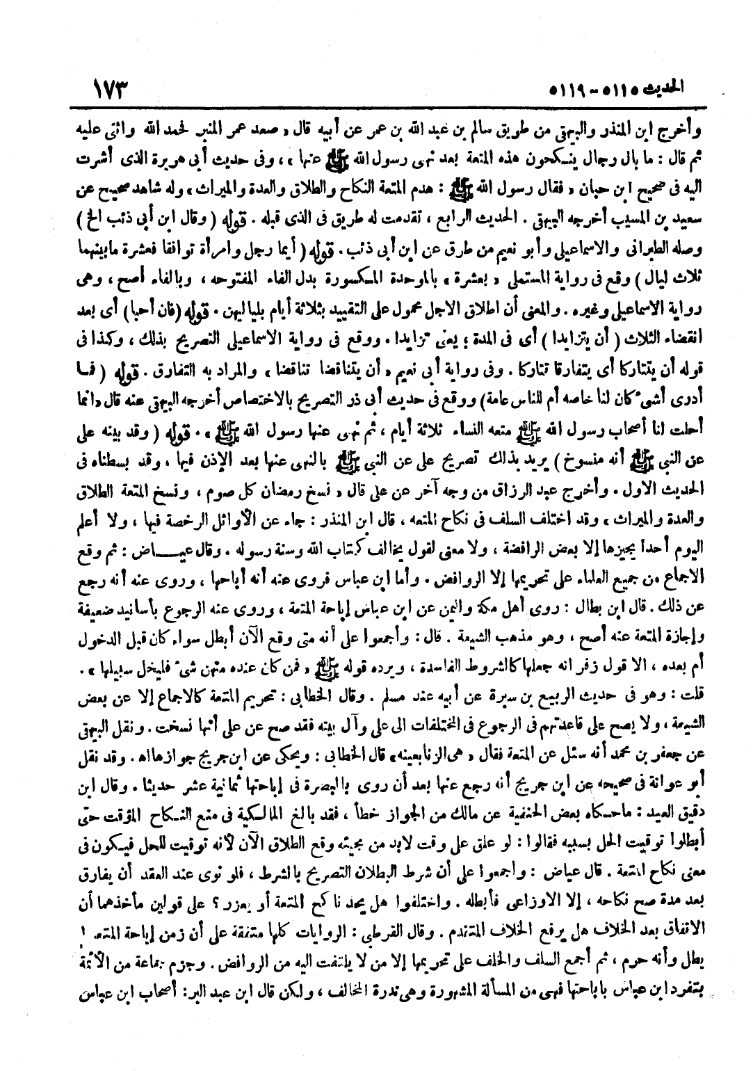 وَأخرج بن الْمُنْذِرِ وَالْبَيْهَقِيُّ مِنْ طَرِيقِ سَالِمِ بْنِ عَبْدِ اللَّهِ بْنِ عُمَرَ عَنْ أَبِيهِ قَالَ صَعِدَ عُمَرُ الْمِنْبَرَ فَحَمِدَ اللَّهَ وَأَثْنَى عَلَيْهِ ثُمَّ قَالَ مَا بَالُ رِجَالٍ يَنْكِحُونَ هَذِهِ الْمُتْعَةَ بَعْدَ نَهَى رَسُولُ اللَّهِ صَلَّى اللَّهُ عَلَيْهِ وَسَلَّمَ عَنْهَا وَفِي حَدِيثِ أَبِي هُرَيْرَةَ الَّذِي أَشرت إِلَيْهِ فِي صَحِيح بن حِبَّانَ فَقَالَ رَسُولُ اللَّهِ صَلَّى اللَّهُ عَلَيْهِ وَسَلَّمَ هَدَمَ الْمُتْعَةَ النِّكَاحُ وَالطَّلَاقُ وَالْعِدَّةُ وَالْمِيرَاثُ وَلَهُ شَاهِدٌ صَحِيحٌ عَنْ سَعِيدِ بْنِ الْمُسَيَّبِ أخرجه الْبَيْهَقِيّ الحَدِيث الرَّابِع تقدّمت لَهُ طَرِيق فِي الَّذِي قبله قَوْله وَقَالَ بن أَبِي ذِئْبٍ إِلَخْ وَصَلَهُ الطَّبَرَانِيُّ وَالْإِسْمَاعِيلِيُّ وَأَبُو نعيم من طرق عَن بن أَبِي ذِئْبٍ قَوْلُهُ أَيُّمَا رَجُلٍ وَامْرَأَةٍ تَوَافَقَا فَعِشْرَةُ مَا بَيْنَهُمَا ثَلَاثُ لَيَالٍ وَقَعَ فِي رِوَايَةِ الْمُسْتَمْلِي بِعَشَرَةٍ بِالْمُوَحَّدَةِ الْمَكْسُورَةِ بَدَلَ الْفَاءِ الْمَفْتُوحَةِ وَبِالْفَاءِ أَصَحُّ وَهِيَ رِوَايَةُ الْإِسْمَاعِيلِيِّ وَغَيْرِهِ وَالْمَعْنَى أَنَّ إِطْلَاقَ الْأَجَلِ مَحْمُولٌ عَلَى التَّقْيِيدِ بِثَلَاثَةِ أَيَّامٍ بِلَيَالِيِهِنَّ قَوْلُهُ فَإِنْ أَحَبَّا أَيْ بَعْدَ انْقِضَاءِ الثَّلَاثِ أَنْ يَتَزَايَدَا أَيْ فِي الْمُدَّةِ يَعْنِي تَزَايَدَا وَوَقَعَ فِي رِوَايَةِ الْإِسْمَاعِيلِيِّ التَّصْرِيحُ بِذَلِكَ وَكَذَا فِي قَوْلِهِ أَنْ يَتَتَارَكَا أَيْ يَتَفَارَقَا تَتَارَكَا وَفِي رِوَايَةِ أَبِي نُعَيْمٍ أَنْ يَتَنَاقَضَا تَنَاقَضَا وَالْمُرَادُ بِهِ التَّفَارُقُ قَوْلُهُ فَمَا أَدْرِي أَشَيْءٌ كَانَ لَنَا خَاصَّةً أَمْ لِلنَّاسِ عَامَّةً وَوَقَعَ فِي حَدِيثِ أَبِي ذَرٍّ التَّصْرِيحُ بِالِاخْتِصَاصِ أَخْرَجَهُ الْبَيْهَقِيُّ عَنْهُ قَالَ إِنَّمَا أُحِلَّتْ لَنَا أَصْحَابِ رَسُولِ اللَّهِ صَلَّى اللَّهُ عَلَيْهِ وَسَلَّمَ مُتْعَةُ النِّسَاءِ ثَلَاثَةَ أَيَّامٍ ثُمَّ نَهَى عَنْهَا رَسُولِ اللَّهِ صَلَّى اللَّهُ عَلَيْهِ وَسَلَّمَ قَوْلُهُ وَقَدْ بَيَّنَهُ عَلِيٌّ عَنِ النَّبِيِّ صَلَّى اللَّهُ عَلَيْهِ وَسَلَّمَ أَنَّهُ مَنْسُوخٌ يُرِيدُ بِذَلِكَ تَصْرِيحَ عَلِيٍّ عَنِ النَّبِيِّ صَلَّى اللَّهُ عَلَيْهِ وَسَلَّمَ بِالنَّهْيِ عَنْهَا بَعْدَ الْإِذْنِ فِيهَا وَقد بسطناه فِي الحَدِيث الْأَوَّلِ وَأَخْرَجَ عَبْدُ الرَّزَّاقِ مِنْ وَجْهٍ آخَرَ عَنْ عَلِيٍّ قَالَ نَسَخَ رَمَضَانُ كُلَّ صَوْمٍ وَنَسَخَ الْمُتْعَةَ الطَّلَاقُ وَالْعِدَّةُ وَالْمِيرَاثُ وَقَدِ اخْتَلَفَ السّلف فِي نِكَاح الْمُتْعَة قَالَ بن الْمُنْذِرِ جَاءَ عَنِ الْأَوَائِلِ الرُّخْصَةُ فِيهَا وَلَا أَعْلَمُ الْيَوْمَ أَحَدًا يُجِيزُهَا إِلَّا بَعْضُ الرَّافِضَةِ وَلَا مَعْنَى لِقَوْلٍ يُخَالِفُ كِتَابَ اللَّهِ وَسُنَّةَ رَسُولِهِ وَقَالَ عِيَاضٌ ثُمَّ وَقَعَ الْإِجْمَاعُ مِنْ جَمِيعِ الْعُلَمَاءِ عَلَى تَحْرِيمِهَا إِلَّا الرَّوَافِضَ وَأَمَّا بن عَبَّاسٍ فَرُوِيَ عَنْهُ أَنَّهُ أَبَاحَهَا وَرُوِيَ عَنْهُ أَنه رَجَعَ عَن ذَلِك قَالَ بن بطال روى أهل مَكَّة واليمن عَن بن عَبَّاسٍ إِبَاحَةَ الْمُتْعَةِ وَرُوِيَ عَنْهُ الرُّجُوعُ بِأَسَانِيدَ ضَعِيفَةٍ وَإِجَازَةُ الْمُتْعَةِ عَنْهُ أَصَحُّ وَهُوَ مَذْهَبُ الشِّيعَةِ قَالَ وَأَجْمَعُوا عَلَى أَنَّهُ مَتَى وَقَعَ الْآنَ أُبْطِلَ سَوَاءٌ كَانَ قَبْلَ الدُّخُولِ أَمْ بَعْدَهُ إِلَّا قَوْلَ زُفَرَ إِنَّهُ جَعَلَهَا كَالشُّرُوطِ الْفَاسِدَةِ وَيَرُدُّهُ قَوْلُهُ صَلَّى اللَّهُ عَلَيْهِ وَسَلَّمَ فَمَنْ كَانَ عِنْدَهُ مِنْهُنَّ شَيْءٌ فَلْيُخَ