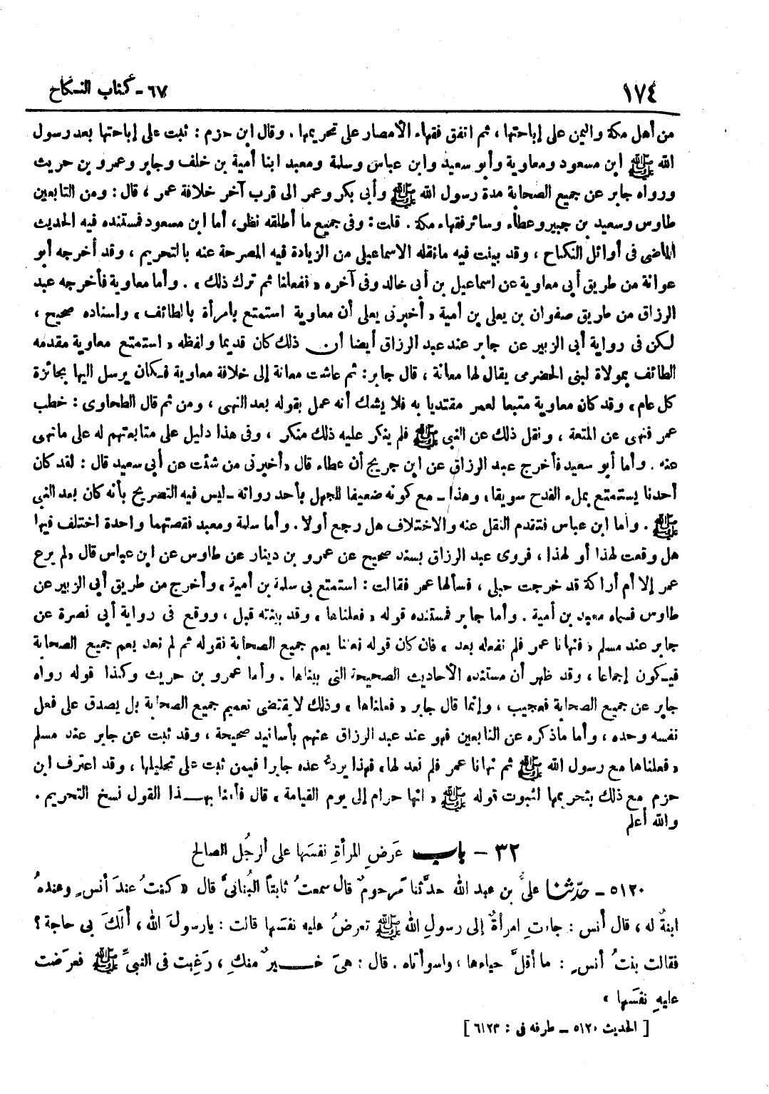 مِنْ أَهْلِ مَكَّةَ وَالْيَمَنِ عَلَى إِبَاحَتِهَا ثُمَّ اتّفق فُقَهَاء الْأَمْصَار على تَحْرِيمهَا وَقَالَ بن حَزْمٍ ثَبَتَ عَلَى إِبَاحَتِهَا بَعْدَ رَسُولِ اللَّهِ صَلَّى اللَّهُ عَلَيْهِ وَسَلَّمَ بن مَسْعُود وَمُعَاوِيَة وَأَبُو سعيد وبن عَبَّاسٍ وَسَلَمَةُ وَمَعْبَدٌ ابْنَا أُمَيَّةَ بْنِ خَلَفٍ وَجَابِرٌ وَعَمْرُو بْنُ حُرَيْثٍ وَرَوَاهُ جَابِرٌ عَنْ جَمِيعِ الصَّحَابَةِ مُدَّةَ رَسُولِ اللَّهِ صَلَّى اللَّهُ عَلَيْهِ وَسَلَّمَ وَأَبِي بَكْرٍ وَعُمَرَ إِلَى قُرْبِ آخِرِ خِلَافَةِ عُمَرَ قَالَ وَمِنَ التَّابِعِينَ طَاوُسٌ وَسَعِيدُ بْنُ جُبَيْرٍ وَعَطَاءٌ وَسَائِرُ فُقَهَاءِ مَكَّةَ قُلْتُ وَفِي جَمِيعِ مَا أَطْلَقَهُ نَظَرٌ أَمَّا بن مَسْعُودٍ فَمُسْتَنَدُهُ فِيهِ الْحَدِيثُ الْمَاضِي فِي أَوَائِلِ النِّكَاحِ وَقَدْ بَيَّنْتُ فِيهِ مَا نَقَلَهُ الْإِسْمَاعِيلِيُّ من الزِّيَادَة فِيهِ المصرحة عَنهُ بِالتَّحْرِيمِ وقداخرجه أَبُو عَوَانَةَ مِنْ طَرِيقِ أَبِي مُعَاوِيَةَ عَنْ إِسْمَاعِيلَ بْنِ أَبِي خَالِدٍ وَفِي آخِرِهِ فَفَعَلْنَا ثُمَّ تُرِكَ ذَلِكَ وَأَمَّا مُعَاوِيَةُ فَأَخْرَجَهُ عَبْدُ الرَّزَّاقِ مِنْ طَرِيقِ صَفْوَانَ بْنِ يَعْلَى بْنِ أُمَيَّةَ أَخْبَرَنِي يَعْلَى أَنَّ مُعَاوِيَةَ اسْتَمْتَعَ بِامْرَأَةٍ بِالطَّائِفِ وَإِسْنَادُهُ صَحِيحٌ لَكِنْ فِي رِوَايَةِ أَبِي الزُّبَيْرِ عَنْ جَابِرٍ عِنْدَ عَبْدِ الرَّزَّاقِ أَيْضًا أَنَّ ذَلِكَ كَانَ قَدِيمًا وَلَفْظُهُ اسْتَمْتَعَ مُعَاوِيَةُ مَقْدِمَهُ الطَّائِفَ بِمَوْلَاةٍ لِبَنِي الْحَضْرَمِيِّ يُقَالُ لَهَا مُعَانَةُ قَالَ جَابِرٍ ثُمَّ عَاشَتْ مُعَانَةُ إِلَى خِلَافَةِ مُعَاوِيَةَ فَكَانَ يُرْسِلُ إِلَيْهَا بِجَائِزَةٍ كُلَّ عَامٍ وَقَدْ كَانَ مُعَاوِيَةُ مُتَّبِعًا لِعُمَرَ مُقْتَدِيًا بِهِ فَلَا يَشُكُّ أَنَّهُ عَمَلَ بِقَوْلِهِ بَعْدَ النَّهْيِ وَمِنْ ثَمَّ قَالَ الطَّحَاوِيُّ خَطَبَ عُمَرُ فَنَهَى عَنِ الْمُتْعَةِ وَنَقَلَ ذَلِكَ عَنِ النَّبِيِّ صَلَّى اللَّهُ عَلَيْهِ وَسَلَّمَ فَلَمْ يُنْكِرْ عَلَيْهِ ذَلِكَ مُنْكِرٌ وَفِي هَذَا دَلِيلٌ عَلَى مُتَابَعَتِهِمْ لَهُ عَلَى مَا نَهَى عَنْهُ وَأَمَّا أَبُو سعيد فَأخْرج عبد الرَّزَّاق عَن بن جُرَيْجٍ أَنَّ عَطَاءً قَالَ أَخْبَرَنِي مَنْ شِئْتَ عَنْ أَبِي سَعِيدٍ قَالَ لَقَدْ كَانَ أَحَدُنَا يَسْتَمْتِعُ بِمِلْءِ الْقَدَحِ سَوِيقًا وَهَذَا مَعَ كَوْنِهِ ضَعِيفًا لِلْجَهْلِ بِأَحَدِ رُوَاتِهِ لَيْسَ فِيهِ التَّصْرِيحُ بِأَنَّهُ كَانَ بَعْدَ النَّبِيِّ صَلَّى اللَّهُ عَلَيْهِ وَسَلَّمَ وَأَمَّا بن عَبَّاسٍ فَتَقَدَّمَ النَّقْلُ عَنْهُ وَالِاخْتِلَافُ هَلْ رَجَعَ أَوْ لَا وَأَمَّا سَلَمَةُ وَمَعْبَدٌ فَقِصَّتُهُمَا وَاحِدَةٌ اخْتُلِفَ فِيهَا هَلْ وَقَعَتْ لِهَذَا أَوْ لِهَذَا فَرَوَى عَبْدُ الرَّزَّاقِ بِسَنَدٍ صَحِيحٍ عَنْ عَمْرِو بْنِ دِينَارٍ عَنْ طَاوُسٍ عَنِ بن عَبَّاسٍ قَالَ لَمْ يَرْعَ عُمَرُ إِلَّا أُمَّ أَرَاكَةَ قَدْ خَرَجَتْ حُبْلَى فَسَأَلَهَا عُمَرُ فَقَالَتِ اسْتَمْتَعَ بِي سَلَمَةُ بْنُ أُمَيَّةَ وَأَخْرَجَ مِنْ طَرِيقِ أَبِي الزُّبَيْرِ عَنْ طَاوُسٍ فَسَمَّاهُ مَعْبَدُ بْنُ أُمَيَّةَ وَأَمَّا جَابِرٌ فَمُسْتَنَدُهُ قَوْلُهُ فَعَلْنَاهَا وَقَدْ بَيَّنْتُهُ قَبْلُ وَوَقَعَ فِي رِوَايَةِ أَبِي نُصْرَةَ عَنْ جَابِرٍ عِنْدَ مُسْلِمٍ فَنَهَانَا عُمَرُ فَلَمْ نَفْعَلْهُ بَعْدُ فَإِنْ كَانَ قَوْلُهُ فَعَلْنَا يَعُمُّ جَمِيعَ الصَّحَابَةِ فَقَوْلُهُ ثُمَّ لَمْ نَعُدْ يَعُمُّ جَمِيعَ الصَّحَابَةِ فَيَكُونُ إِجْمَاعًا وَقَدْ ظَهَرَ أَنَّ مُسْتَنَدَهُ الْأَحَادِيثُ الصَّحِيحَةُ الَّتِي بَيَّنَّاهَا وَأَمَّا عَمْرُو بْنُ حُر