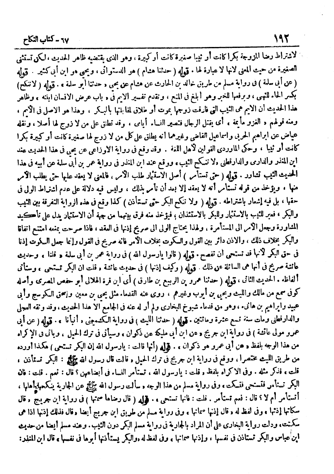 [5136] قَوْله حَدَّثَنَا هِشَامٌ هُوَ الدَّسْتُوَائِيُّ وَيَحْيَى هُوَ بن أَبِي كَثِيرٍ قَوْلُهُ عَنْ أَبِي سَلَمَةَ فِي رِوَايَةِ مُسْلِمٍ مِنْ طَرِيقِ خَالِدِ بْنِ الْحَارِثِ عَنْ هِشَامٍ عَنْ يَحْيَى حَدَّثَنَا أَبُو سَلَمَةَ قَوْلُهُ لَا تُنْكِحُ بِكَسْرِ الْحَاءِ لِلنَّهْيِ وَبِرَفْعِهَا لِلْخَبَرِ وَهُوَ أَبْلَغُ فِي الْمَنْعِ وَتَقَدَّمَ تَفْسِيرُ الْأَيِّمِ فِي بَابِ عَرْضِ الْإِنْسَانِ ابْنَتَهُ وَظَاهِرُ هَذَا الْحَدِيثِ أَنَّ الْأَيِّمَ هِيَ الثَّيِّبُ الَّتِي فَارَقَتْ زَوْجَهَا بِمَوْتٍ أَوْ طَلَاقٍ لِمُقَابَلَتِهَا بِالْبِكْرِ وَهَذَا هُوَ الْأَصْلُ فِي الْأَيِّمِ وَمِنْهُ قَوْلِهِمْ الْغَزْوُ مَأْيَمَةٌ أَيْ يَقْتُلُ الرِّجَالَ فَتَصِيرُ النِّسَاءُ أَيَامَى وَقَدْ تُطْلَقُ عَلَى مَنْ لَا زَوْجَ لَهَا أَصْلًا وَنَقَلَهُ عِيَاضٌ عَنْ إِبْرَاهِيمَ الْحَرْبِيِّ وَإِسْمَاعِيلَ الْقَاضِي وَغَيْرِهِمَا أَنَّهُ يُطْلَقُ عَلَى كُلِّ مَنْ لَا زَوْجَ لَهَا صَغِيرَةً كَانَتْ أَوْ كَبِيرَةً بِكْرًا كَانَتْ أَوْ ثَيِّبًا وَحَكَى الْمَاوَرْدِيُّ الْقَوْلَيْنِ لِأَهْلِ اللُّغَةِ وَقَدْ وَقَعَ فِي رِوَايَةِ الْأَوْزَاعِيِّ عَنْ يَحْيَى فِي هَذَا الْحَدِيثِ عِنْدَ بن الْمُنْذِرِ وَالدَّارِمِيِّ وَالدَّارَقُطْنِيِّ لَا تُنْكَحُ الثَّيِّبُ وَوَقَعَ عِنْد بن الْمُنْذِرِ فِي رِوَايَةِ عُمَرَ بْنِ أَبِي سَلَمَةَ عَنْ أَبِيهِ فِي هَذَا الْحَدِيثِ الثَّيِّبُ تُشَاوَرُ قَوْله حَتَّى تستأمر أصل الاستثمار طَلَبُ الْأَمْرِ فَالْمَعْنَى لَا يَعْقِدُ عَلَيْهَا حَتَّى يَطْلُبَ الْأَمْرَ مِنْهَا وَيُؤْخَذُ مِنْ قَوْلِهِ تُسْتَأْمَرُ أَنَّهُ لَا يَعْقِدُ إِلَّا بَعْدَ أَنْ تَأْمُرَ بِذَلِكَ وَلَيْسَ فِيهِ دَلَالَةٌ عَلَى عَدَمِ اشْتِرَاطِ الْوَلِيِّ فِي حَقِّهَا بَلْ فِيهِ إِشْعَارٌ بِاشْتِرَاطِهِ قَوْلُهُ وَلَا تُنْكَحُ الْبِكْرُ حَتَّى تُسْتَأْذَنَ كَذَا وَقَعَ فِي هَذِهِ الرِّوَايَةِ التَّفْرِقَةُ بَيْنَ الثَّيِّبِ وَالْبكْر فَعبر للثيب بالاستثمار وَلِلْبِكْرِ بِالِاسْتِئْذَانِ فَيُؤْخَذُ مِنْهُ فَرْقٌ بَيْنَهُمَا مِنْ جِهَة أَن الاستثمار يَدُلُّ عَلَى تَأْكِيدِ الْمُشَاوَرَةِ وَجَعْلِ الْأَمْرِ إِلَى الْمُسْتَأْمَرَةِ وَلِهَذَا يَحْتَاجُ الْوَلِيُّ إِلَى صَرِيحِ إِذْنِهَا فِي الْعَقْدِ فَإِذَا صَرَّحَتْ بِمَنْعِهِ امْتَنَعَ اتِّفَاقًا وَالْبِكْرُ بِخِلَافِ ذَلِكَ وَالْإِذْنُ دَائِرٌ بَيْنَ الْقَوْلِ وَالسُّكُوتِ بِخِلَافِ الْأَمْرِ فَإِنَّهُ صَرِيحٌ فِي الْقَوْلِ وَإِنَّمَا جَعَلَ السُّكُوتَ إِذْنًا فِي حَقِّ الْبِكْرِ لِأَنَّهَا قَدْ تَسْتَحِي أَنْ تُفْصِحَ قَوْلُهُ قَالُوا يَا رَسُولَ اللَّهِ فِي رِوَايَةِ عُمَرَ بْنِ أَبِي سَلَمَةَ قُلْنَا وَحَدِيثُ عَائِشَةَ صَرِيحٌ فِي أَنَّهَا هِيَ السَّائِلَةُ عَنْ ذَلِكَ قَوْلُهُ كَيْفَ إِذْنُهَا فِي حَدِيثِ عَائِشَةَ قُلْتُ إِنَّ الْبِكْرِ تَسْتَحي وَسَتَأْتِي أَلْفَاظه الحَدِيث الثَّانِي