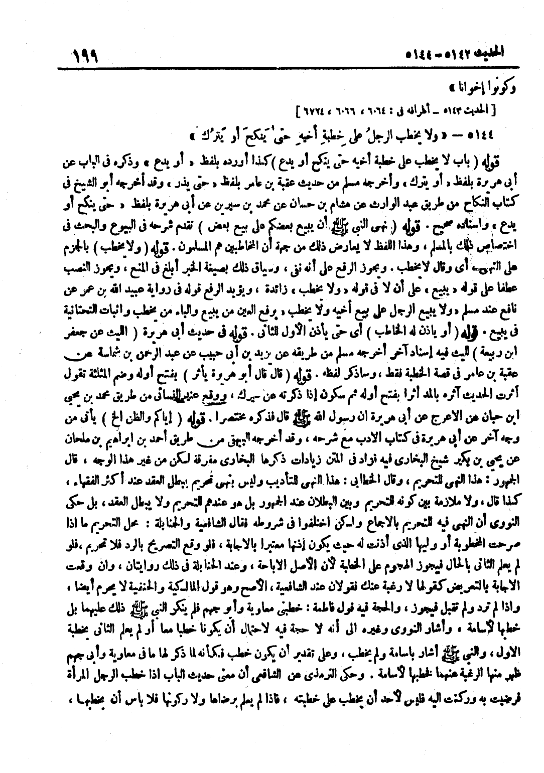 [5142] قَوْلُهُ نَهَى النَّبِيُّ صَلَّى اللَّهُ عَلَيْهِ وَسَلَّمَ أَنْ يَبِيعَ بَعْضُكُمْ عَلَى بَيْعِ بَعْضٍ تَقَدَّمَ شَرْحُهُ فِي الْبُيُوعِ وَالْبَحْثُ فِي اخْتِصَاصِ ذَلِكَ بِالْمُسْلِمِ وَهَذَا اللَّفْظُ لَا يُعَارِضُ ذَلِكَ مِنْ جِهَةِ أَنَّ الْمُخَاطَبِينَ هُمُ الْمُسْلِمُونَ قَوْلُهُ وَلَا يَخْطُبْ بِالْجَزْمِ عَلَى النَّهْيِ أَيْ وَقَالَ لَا يَخْطُبُ وَيَجُوزُ الرَّفْعُ عَلَى أَنَّهُ نَفْيٌ وَسِيَاقُ ذَلِكَ بِصِيغَةِ الْخَبَرِ أَبْلَغُ فِي الْمَنْعِ وَيَجُوزُ النَّصْبُ عَطْفًا عَلَى قَوْلِهِ يَبِيعَ عَلَى أَنَّ لَا فِي قَوْلِهِ وَلَا يَخْطُبْ زَائِدَةٌ وَيُؤَيِّدُ الرَّفْعَ قَوْلُهُ فِي رِوَايَةِ عُبَيْدِ اللَّهِ بْنِ عُمَرَ عَنِ نَافِعٍ عِنْدَ مُسْلِمٍ وَلَا يَبِيعَ الرَّجُلُ عَلَى بَيْعِ أَخِيهِ وَلَا يَخْطُبَ بِرَفْعِ الْعَيْنِ مِنْ يَبِيعُ وَالْبَاءِ مِنْ يَخْطُبُ وَإِثْبَاتِ التَّحْتَانِيَّةِ فِي يَبِيعُ قَوْلُهُ أَوْ يَأْذَنَ لَهُ الْخَاطِبُ أَيْ حَتَّى يَأْذَنَ الْأَوَّلُ لِلثَّانِي قَوْلُهُ فِي حَدِيثِ أَبِي هُرَيْرَةَ