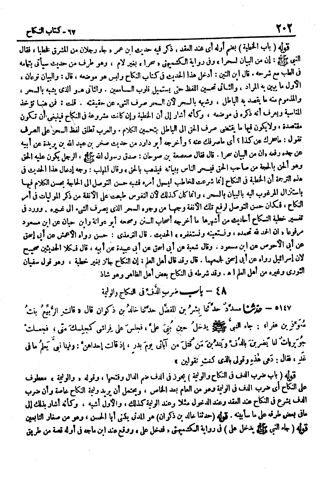 بِضَمِّ أَوَّلِهِ أَيْ عِنْدَ العقد ذكر فِيهِ حَدِيث بن عُمَرَ جَاءَ رَجُلَانِ مِنَ الْمَشْرِقِ فَخَطَبَا فَقَالَ النَّبِيُّ صَلَّى اللَّهُ عَلَيْهِ وَسَلَّمَ إِنَّ مِنَ الْبَيَانِ لَسِحْرًا وَفِي رِوَايَةِ الْكُشْمِيهَنِيِّ سِحْرًا بِغَيْرِ لَامٍ وَهُوَ طَرَفٌ مِنْ حَدِيثٍ سَيَأْتِي بِتَمَامِهِ فِي الطِّبّ مَعَ شَرحه حَدِيث بن عُمَرَ جَاءَ رَجُلَانِ مِنَ الْمَشْرِقِ فَخَطَبَا فَقَالَ النَّبِيُّ صَلَّى اللَّهُ عَلَيْهِ وَسَلَّمَ إِنَّ مِنَ الْبَيَانِ لَسِحْرًا وَفِي رِوَايَةِ الْكُشْمِيهَنِيِّ سِحْرًا بِغَيْرِ لَامٍ وَهُوَ طَرَفٌ مِنْ حَدِيثٍ سَيَأْتِي بِتَمَامِهِ فِي الطِّبّ مَعَ شَرحه قَالَ بن التِّينِ أَدْخَلَ هَذَا الْحَدِيثَ فِي كِتَابِ النِّكَاحِ وَلَيْسَ هُوَ مَوْضِعِهِ قَالَ وَالْبَيَانُ نَوْعَانِ الْأَوَّلُ مَا يُبَيِّنُ بِهِ الْمُرَادُ وَالثَّانِي تَحْسِينُ اللَّفْظِ حَتَّى يَسْتَمِيلَ قُلُوبَ السَّامِعِينَ وَالثَّانِي هُوَ الَّذِي يُشَبَّهُ بِالسَّحَرِ وَالْمَذْمُومُ مِنْهُ مَا يُقْصَدُ بِهِ الْبَاطِلُ وَشَبَّهَهُ بِالسَّحَرِ لِأَنَّ السَّحَرَ صَرْفُ الشَّيْءِ عَنْ حَقِيقَتِهِ قُلْتُ فَمِنْ هُنَا تُؤْخَذُ الْمُنَاسَبَةُ وَيُعْرَفُ أَنَّهُ ذَكَرَهُ فِي مَوْضِعِهِ وَكَأَنَّهُ أَشَارَ إِلَى أَنَّ الْخِطْبَةَ وَإِنْ كَانَتْ مَشْرُوعَةً فِي النِّكَاحِ فَيَنْبَغِي أَنْ تَكُونَ مُقْتَصِدَةً وَلَا يَكُونَ فِيهَا مَا يَقْتَضِي صَرْفَ الْحَقِّ إِلَى الْبَاطِلِ بِتَحْسِينِ الْكَلَامِ وَالْعَرَبُ تُطْلِقُ لَفْظَ السَّحَرِ عَلَى الصَّرْفِ تَقُولُ مَا سَحَرَكَ عَنْ كَذَا أَيْ مَا صَرَفَكَ عَنْهُ وَأَخْرَجَهُ أَبُو دَاوُدَ مِنْ حَدِيثِ صَخْرِ بْنِ عَبْدِ اللَّهِ بْنِ بُرَيْدَةَ عَنْ أَبِيهِ عَنْ جَدِّهِ رَفَعَهُ إِنَّ مِنَ الْبَيَانِ سِحْرًا قَالَ فَقَالَ صَعْصَعَةُ بْنُ صُوحَانَ صَدَقَ رَسُولُ اللَّهِ صَلَّى اللَّهُ عَلَيْهِ وَسَلَّمَ الرَّجُلُ يَكُونُ عَلَيْهِ الْحَقُّ وَهُوَ أَلْحَنُ بِالْحُجَّةِ مِنْ صَاحِبِ الْحَقِّ فَيَسْحَرُ النَّاسَ بِبَيَانِهِ فَيَذْهَبُ بِالْحَقِّ وَقَالَ الْمُهَلَّبُ وَجْهُ إِدْخَالِ هَذَا الْحَدِيثِ فِي هَذِهِ التَّرْجَمَةِ أَنَّ الْخُطْبَةَ فِي النِّكَاحِ إِنَّمَا شُرِعَتْ لِلْخَاطِبِ لِيَسْهُلَ أَمْرُهُ فَشُبِّهَ حُسْنُ التَّوَصُّلِ إِلَى الْحَاجَةِ بِحُسْنِ الْكَلَامِ فِيهَا بِاسْتِنْزَالِ الْمَرْغُوبِ إِلَيْهِ بِالْبَيَانِ بِالسِّحْرِ وَإِنَّمَا كَانَ كَذَلِكَ لِأَنَّ النُّفُوسَ طُبِعَتْ عَلَى الْأَنَفَةِ مِنْ ذِكْرِ الْمَوْلَيَاتِ فِي أَمْرِ النِّكَاحِ فَكَانَ حُسْنُ التَّوَصُّلِ لِرَفْعِ تِلْكَ الْأَنَفَةِ وَجْهًا مِنْ وُجُوهِ السِّحْرِ الَّذِي يَصْرِفُ الشَّيْءَ إِلَى غَيْرِهِ وَوَرَدَ فِي تَفْسِيرِ خُطْبَةِ النِّكَاحِ أَحَادِيثُ مِنْ أَشْهَرِهَا مَا أَخْرَجَهُ أَصْحَابُ السُّنَنِ وَصَحَّحَهُ أَبُو عَوَانَةَ وبن حبَان عَن بن مَسْعُودٍ مَرْفُوعًا إِنَّ الْحَمْدَ لِلَّهِ نَحْمَدُهُ وَنَسْتَعِينُهُ وَنَسْتَغْفِرُهُ الْحَدِيثَ قَالَ التِّرْمِذِيُّ حَسَنٌ رَوَاهُ الْأَعْمَشُ عَنْ أَبِي إِسْحَاقَ عَنْ أَبِي الْأَحْوَصَ عَنِ بن مَسْعُودٍ وَقَالَ شُعْبَةُ عَنْ أَبِي إِسْحَاقَ عَنْ أَبِي عُبَيْدَةِ عَنْ أَبِيهِ قَالَ فَكِلَا الْحَدِيثَيْنِ صَحِيحٌ لِأَنَّ إِسْرَائِيلَ رَوَاهُ عَنْ أَبِي إِسْحَاقَ فَجَمَعَهُمَا قَالَ وَقَدْ قَالَ أَهْلُ الْعِلْمِ إِنَّ النِّكَاحَ جَائِزٌ بِغَيْرِ خُطْبَةٍ وَهُوَ قَوْلُ سُفْيَانَ الثَّوْرِيِّ وَغَيْرِهِ مِنْ أَهْلِ الْعِلْمِ اه وَقَدْ شَرَطَهُ فِي النِّكَاحِ بَعْضُ أَهْلِ الظَّاهِرِ وَهُوَ شَاذ قَوْلُهُ بَابُ ضَرْبِ الدُّفِّ فِي النِّكَاحِ وَالْوَلِيمَةِ يَجُوزُ فِي الدُّفِّ ضَ