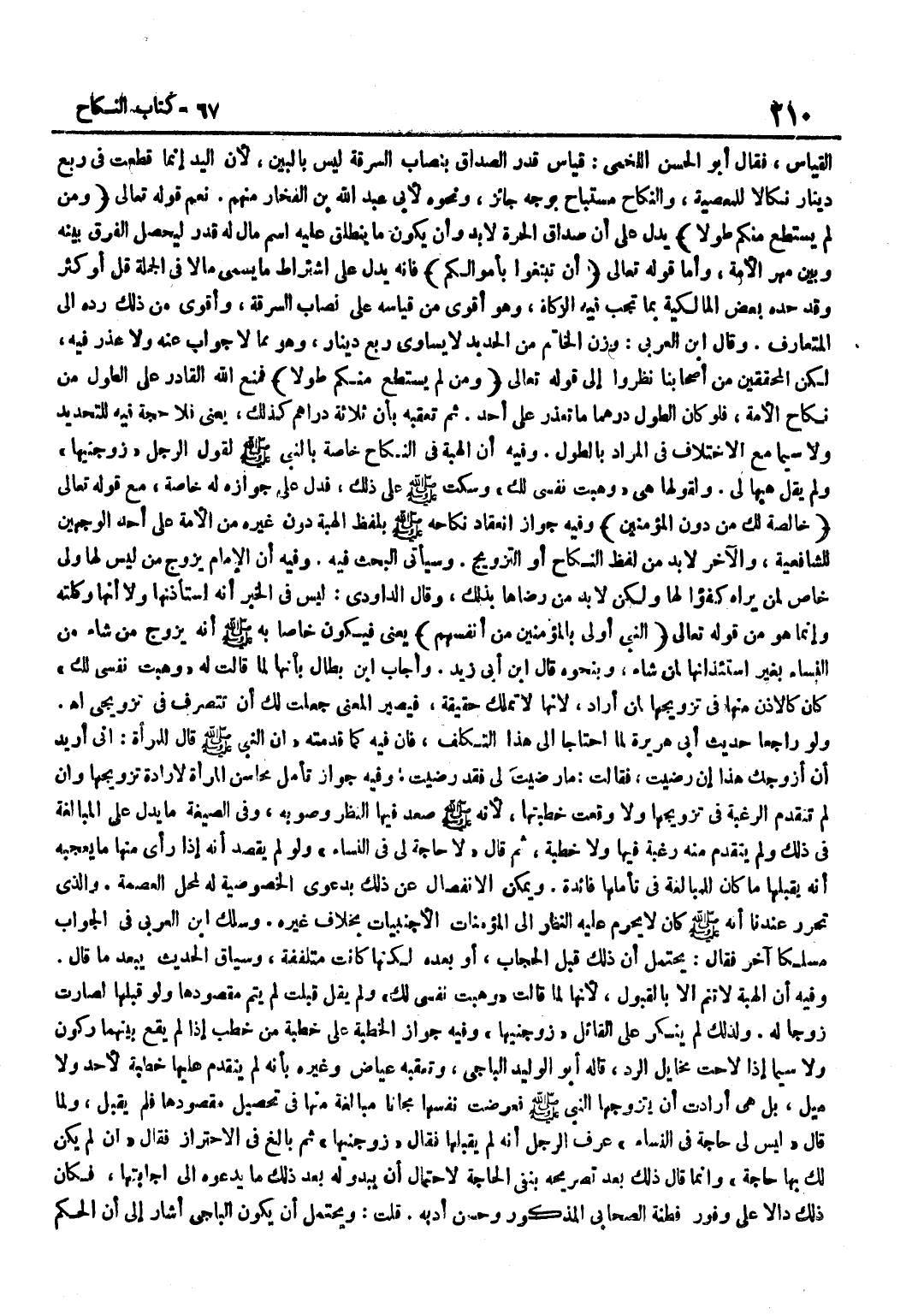 الْقِيَاسَ فَقَالَ أَبُو الْحَسَنِ اللَّخْمِيُّ قِيَاسُ قَدْرِ الصَّدَاقِ بِنِصَابِ السَّرِقَةِ لَيْسَ بِالْبَيِّنِ لِأَنَّ الْيَدَ إِنَّمَا قُطِعَتْ فِي رُبْعِ دِينَارٍ نَكَالًا لِلْمَعْصِيَةِ وَالنِّكَاحُ مُسْتَبَاحٌ بِوَجْهٍ جَائِزٍ وَنَحْوُهُ لِأَبِي عَبْدِ اللَّهِ بْنِ الْفَخَّارِ مِنْهُمْ نَعَمْ قَوْلُهُ تَعَالَى وَمن لم يسْتَطع مِنْكُم طولا يَدُلُّ عَلَى أَنَّ صَدَاقَ الْحُرَّةِ لَا بُدَّ وَأَنْ يَكُونَ مَا يَنْطَلِقُ عَلَيْهِ اسْمُ مَالٍ لَهُ قَدْرٌ لِيَحْصُلَ الْفَرْقُ بَيْنَهُ وَبَيْنَ مَهْرِ الْأَمَةِ وَأَمَّا قَوْلُهُ تَعَالَى أَنْ تَبْتَغُوا بِأَمْوَالِكُمْ فَإِنَّهُ يَدُلُّ عَلَى اشْتِرَاطِ مَا يُسَمَّى مَالًا فِي الْجُمْلَةِ قَلَّ أَوْ كَثُرَ وَقَدْ حَدَّهُ بَعْضُ الْمَالِكِيَّةِ بِمَا تَجِبُ فِيهِ الزَّكَاةُ وَهُوَ أَقْوَى مِنْ قِيَاسِهِ عَلَى نِصَابِ السَّرِقَةِ وَأَقْوَى من ذَلِك رده إِلَى الْمُتَعَارف وَقَالَ بن الْعَرَبِيِّ وَزْنُ الْخَاتَمِ مِنَ الْحَدِيدِ لَا يُسَاوِي رُبْعَ دِينَارٍ وَهُوَ مِمَّا لَا جَوَابَ عَنْهُ وَلَا عُذْرَ فِيهِ لَكِنَّ الْمُحَقِّقِينَ مِنْ أَصْحَابِنَا نَظَرُوا إِلَى قَوْلِهِ تَعَالَى وَمَنْ لَمْ يَسْتَطِعْ مِنْكُم طولا فَمَنَعَ اللَّهُ الْقَادِرَ عَلَى الطَّوْلِ مِنْ نِكَاحِ الْأَمَةِ فَلَوْ كَانَ الطَّوْلُ دِرْهَمًا مَا تَعَذَّرَ عَلَى أَحَدٍ ثُمَّ تَعَقَّبَهُ بِأَنَّ ثَلَاثَةَ دَرَاهِمَ كَذَلِكَ يَعْنِي فَلَا حُجَّةَ فِيهِ لِلتَّحْدِيدِ وَلَا سِيَّمَا مَعَ الِاخْتِلَافِ فِي الْمُرَادِ بِالطَّوْلِ وَفِيهِ أَنَّ الْهِبَةَ فِي النِّكَاحِ خَاصَّةٌ بِالنَّبِيِّ صَلَّى اللَّهُ عَلَيْهِ وَسَلَّمَ لِقَوْلِ الرَّجُلِ زَوِّجْنِيهَا وَلَمْ يَقُلْ هَبْهَا لِي وَلِقَوْلِهَا هِيَ وَهَبْتُ نَفْسِي لَكَ وَسَكَتَ صَلَّى اللَّهُ عَلَيْهِ وَسَلَّمَ عَلَى ذَلِكَ فَدَلَّ عَلَى جَوَازِهِ لَهُ خَاصَّةً مَعَ قَوْله تَعَالَى خَالِصَة لَك من دون الْمُؤمنِينَ وَفِيهِ جَوَازُ انْعِقَادِ نِكَاحِهِ صَلَّى اللَّهُ عَلَيْهِ وَسَلَّمَ بِلَفْظِ الْهِبَةِ دُونَ غَيْرِهِ مِنَ الْأُمَّةِ عَلَى أَحَدِ الْوَجْهَيْنِ لِلشَّافِعِيَّةِ وَالْآخَرُ لَا بُدَّ مِنْ لَفْظِ النِّكَاحِ أَوِ التَّزْوِيجِ وَسَيَأْتِي الْبَحْثُ فِيهِ وَفِيهِ أَنَّ الْإِمَامَ يُزَوِّجُ مَنْ لَيْسَ لَهَا وَلِيٌّ خَاصٌّ لِمَنْ يَرَاهُ كُفُؤًا لَهَا وَلَكِنْ لَا بُدَّ مِنْ رِضَاهَا بِذَلِكَ وَقَالَ الدَّاوُدِيُّ لَيْسَ فِي الْخَبَرِ أَنَّهُ اسْتَأْذَنَهَا وَلَا أَنَّهَا وَكَلَّتْهُ وَإِنَّمَا هُوَ مِنْ قَوْلِهِ تَعَالَى النَّبِي أولي بِالْمُؤْمِنِينَ من أنفسهم يَعْنِي فَيَكُونُ خَاصًّا بِهِ صَلَّى اللَّهُ عَلَيْهِ وَسَلَّمَ أَنَّهُ يُزَوِّجُ مَنْ شَاءَ مِنَ النِّسَاءِ بِغَيْر استئذانها لمن شَاءَ وبنحوه قَالَ بن أبي زيد وَأجَاب بن بَطَّالٍ بِأَنَّهَا لَمَّا قَالَتْ لَهُ وَهَبْتُ نَفْسِي لَكَ كَانَ كَالْإِذْنِ مِنْهَا فِي تَزْوِيجِهَا لِمَنْ أَرَادَ لِأَنَّهَا لَا تُمْلَكُ حَقِيقَةً فَيَصِيرُ الْمَعْنَى جَعَلْتُ لَكَ أَنْ تَتَصَرَّفَ فِي تَزْوِيجِي اه وَلَوْ رَاجَعَا حَدِيثَ أَبِي هُرَيْرَةَ لَمَا احْتَاجَا إِلَى هَذَا التَّكَلُّفِ فَإِنَّ فِيهِ كَمَا قَدَّمْتُهُ أَنَّ النَّبِيَّ صَلَّى اللَّهُ عَلَيْهِ وَسَلَّمَ قَالَ لِلْمَرْأَةِ إِنِّي أُرِيدُ أَنْ أُزَوِّجَكِ هَذَا إِنْ رَضِيتِ فَقَالَتْ مَا رَضِيتَ لِي فَقَدْ رَضِيتُ وَفِيهِ جَوَازُ تَأَمُّلِ مَحَاسِنِ الْمَرْأَةِ لِإِرَادَةِ تَزْوِيجِهَا وَإِنْ لَمْ تَتَقَدَّمِ الرَّغْبَةُ فِي تَزْوِيجِهَا وَلَا وَقَعَتْ خِطْبَتُهَا لِأَنَّهُ صَلَّى اللَّهُ عَلَيْهِ وَسَلَّمَ صَعَّدَ فِيهَا النَّظَرَ وَصَوَّبَهُ وَفِي الصِّي