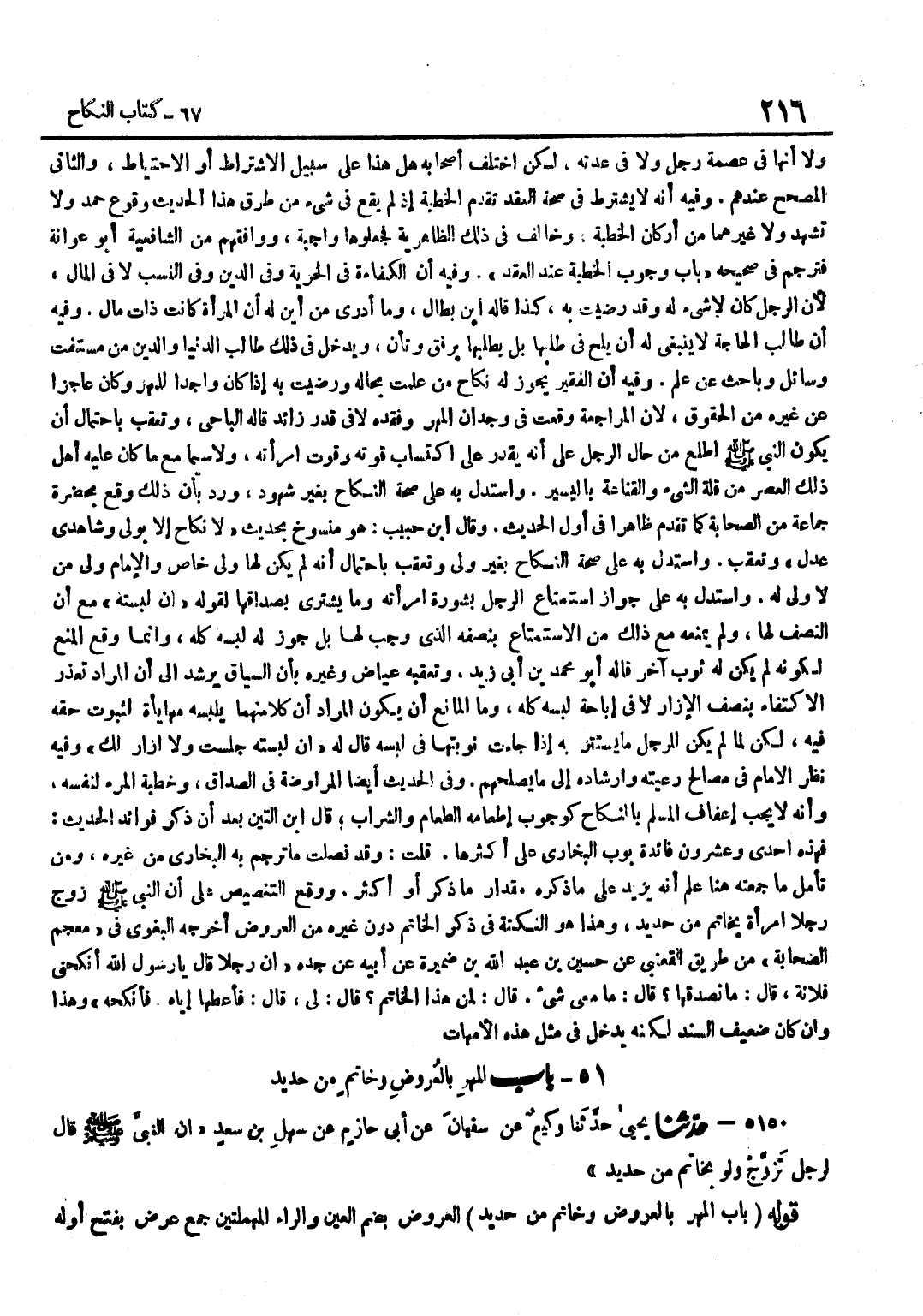 وَلَا أَنَّهَا فِي عِصْمَةِ رَجُلٍ وَلَا فِي عِدَّتِهِ لَكِنِ اخْتَلَفَ أَصْحَابُهُ هَلْ هَذَا عَلَى سَبِيلِ الِاشْتِرَاطِ أَوْ الِاحْتِيَاطِ وَالثَّانِي الْمُصَحَّحُ عِنْدَهُمْ وَفِيهِ أَنَّهُ لَا يُشْتَرَطُ فِي صِحَّةِ الْعَقْدِ تَقَدُّمُ الْخِطْبَةِ إِذْ لَمْ يَقَعْ فِي شَيْءٍ مِنْ طُرُقِ هَذَا الْحَدِيثِ وُقُوعَ حَمْدٍ وَلَا تَشَهُّدٍ وَلَا غَيْرِهِمَا مِنْ أَرْكَانِ الْخُطْبَةِ وَخَالَفَ فِي ذَلِكَ الظَّاهِرِيَّةُ فَجَعَلُوهَا وَاجِبَةً وَوَافَقَهُمْ مِنَ الشَّافِعِيَّةِ أَبُو عَوَانَةَ فَتَرْجَمَ فِي صَحِيحِهِ بَابُ وُجُوبِ الْخُطْبَةِ عِنْدَ الْعَقْدِ وَفِيهِ أَنَّ الْكَفَاءَةَ فِي الْحُرِّيَّةِ وَفِي الدِّينِ وَفِي النَّسَبِ لَا فِي الْمَالِ لِأَنَّ الرَّجُلَ كَانَ لَا شَيْءَ لَهُ وَقَدْ رضيت بِهِ كَذَا قَالَه بن بَطَّالٍ وَمَا أَدْرِي مِنْ أَيْنَ لَهُ أَنَّ الْمَرْأَةَ كَانَتْ ذَاتَ مَالٍ وَفِيهِ أَنَّ طَالِبَ الْحَاجَةِ لَا يَنْبَغِي لَهُ أَنْ يُلِحَّ فِي طَلَبِهَا بَلْ يَطْلُبُهَا بِرِفْقٍ وَتَأَنٍّ وَيَدْخُلُ فِي ذَلِكَ طَالِبُ الدُّنْيَا وَالدِّينِ مِنْ مُسْتَفْتٍ وَسَائِلٍ وَبَاحِثٍ عَنْ عِلْمٍ وَفِيهِ أَنَّ الْفَقِيرَ يَجُوزُ لَهُ نِكَاحُ مَنْ عَلِمَتْ بِحَالِهِ وَرَضِيَتْ بِهِ إِذَا كَانَ وَاجِدًا لِلْمَهْرِ وَكَانَ عَاجِزًا عَنْ غَيْرِهِ مِنَ الْحُقُوقِ لِأَنَّ الْمُرَاجَعَةَ وَقَعَتْ فِي وِجْدَانِ الْمَهْرِ وَفَقْدِهِ لَا فِي قَدْرٍ زَائِدٍ قَالَه الباحي وَتُعُقِّبَ بِاحْتِمَالِ أَنْ يَكُونَ النَّبِيُّ صَلَّى اللَّهُ عَلَيْهِ وَسَلَّمَ اطَّلَعَ مِنْ حَالِ الرَّجُلِ عَلَى أَنَّهُ يَقْدِرُ عَلَى اكْتِسَابِ قُوتِهِ وَقُوتِ امْرَأَتِهِ وَلَا سِيَّمَا مَعَ مَا كَانَ عَلَيْهِ أَهْلُ ذَلِكَ الْعَصْرِ مِنْ قِلَّةِ الشَّيْءِ وَالْقَنَاعَةِ بِالْيَسِيرِ وَاسْتُدِلَّ بِهِ عَلَى صِحَّةِ النِّكَاحِ بِغَيْرِ شُهُودٍ وَرُدَّ بِأَنَّ ذَلِكَ وَقَعَ بِحَضْرَةِ جَمَاعَةٍ مِنَ الصَّحَابَةِ كَمَا تَقَدَّمَ ظَاهِرًا فِي أَوَّلِ الْحَدِيثِ وَقَالَ بن حَبِيبٍ هُوَ مَنْسُوخٌ بِحَدِيثِ لَا نِكَاحَ إِلَّا بولِي وشاهدي عدل وَتعقب وَاسْتُدِلَّ بِهِ عَلَى صِحَّةِ النِّكَاحِ بِغَيْرِ وَلِيٍّ وَتُعُقِّبَ بِاحْتِمَالِ أَنَّهُ لَمْ يَكُنْ لَهَا وَلِيٌّ خَاصٌّ وَالْإِمَامُ وَلِيُّ مَنْ لَا وَلِيَّ لَهُ وَاسْتدلَّ بِهِ على جَوَاز استمتاع الرجل لثورة امْرَأَتِهِ وَمَا يَشْتَرِي بِصَدَاقِهَا لِقَوْلِهِ إِنْ لَبِسَتْهُ مَعَ أَنَّ النِّصْفَ لَهَا وَلَمْ يَمْنَعْهُ مَعَ ذَلِكَ مِنَ الِاسْتِمْتَاعِ بِنِصْفِهِ الَّذِي وَجَبَ لَهَا بَلْ جَوَّزَ لَهُ لُبْسَهُ كُلِّهِ وَإِنَّمَا وَقَعَ الْمَنْعُ لِكَوْنِهِ لَمْ يَكُنْ لَهُ ثَوْبٌ آخَرُ قَالَهُ أَبُو مُحَمَّدِ بْنُ أَبِي زَيْدٍ وَتَعَقَّبَهُ عِيَاضٌ وَغَيْرُهُ بِأَنَّ السِّيَاقَ يُرْشِدُ إِلَى أَنَّ الْمُرَادَ تَعَذُّرُ الِاكْتِفَاءِ بِنِصْفِ الْإِزَارِ لَا فِي إِبَاحَةِ لُبْسِهِ كُلِّهِ وَمَا الْمَانِعُ أَنْ يَكُونَ الْمُرَادُ أَنَّ كُلًّا مِنْهُمَا يَلْبَسُهُ مُهَايَأَةً لِثُبُوتِ حَقِّهِ فِيهِ لَكِنْ لَمَّا لَمْ يَكُنْ لِلرَّجُلِ مَا يَسْتَتِرُ بِهِ إِذَا جَاءَتْ نَوْبَتُهَا فِي لُبْسِهِ قَالَ لَهُ إِنْ لَبِسَتْهُ جَلَسْتَ وَلَا إِزَارَ لَكَ وَفِيهِ نَظَرُ الْإِمَامِ فِي مَصَالِحِ رَعِيَّتِهِ وَإِرْشَادُهُ إِلَى مَا يُصْلِحُهُمْ وَفِي الْحَدِيثِ أَيْضًا الْمُرَاوَضَةُ فِي الصَّدَاقِ وَخِطْبَةُ الْمَرْءِ لِنَفْسِهِ وَأَنَّهُ لَا يَجِبُ إِعْفَافُ الْمُسْلِمِ بِالنِّكَاحِ كَوُجُوبِ إِطْعَامِهِ الطَّعَام وَالشرَاب قَالَ بن التِّينِ بَعْدَ أَنْ ذَكَرَ فَوَائِدَ الْحَدِيثِ فَهَذِهِ إِحْدَى وَعِشْرُونَ فَائِدَةً بَوَّبَ ا