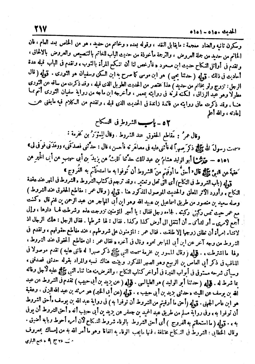 [5151] قَوْلُهُ حَدَّثَنَا أَبُو الْوَلِيدِ هُوَ الطَّيَالِسِيُّ قَوْلُهُ عَنْ يَزِيدَ بْنِ أَبِي حَبِيبٍ تَقَدَّمَ فِي الشُّرُوطِ عَنْ عَبْدِ اللَّهِ بْنِ يُوسُفَ عَنِ اللَّيْثِ حَدَّثَنِي يَزِيدُ بْنُ أَبِي حَبِيبٍ قَوْلُهُ عَنْ أَبِي الْخَيْرِ هُوَ مَرْثَدُ بْنُ عَبْدِ اللَّهِ الْيَزَنِيُّ وَعقبَة هُوَ بن عَامِرٍ الْجُهَنِيُّ قَوْلُهُ أَحَقُّ مَا أَوْفَيْتُمْ مِنَ الشُّرُوطِ أَنْ تُوفُوا بِهِ فِي رِوَايَةِ عَبْدِ اللَّهِ بْنِ يُوسُفَ أَحَقُّ الشُّرُوطِ أَنْ تُوفُوا بِهِ وَفِي رِوَايَةِ مُسْلِمٍ مِنْ طَرِيقِ عَبْدِ الْحَمِيدِ بْنِ جَعْفَرٍ عَنْ يَزِيدَ بْنِ أَبِي حَبِيبٍ أَنَّهُ أَحَقُّ الشُّرُوطِ أَنْ يُوفَى بِهِ قَوْلُهُ مَا اسْتَحْلَلْتُمْ بِهِ الْفُرُوجَ أَيْ أَحَقُّ الشُّرُوطِ بِالْوَفَاءِ شُرُوطُ النِّكَاحِ لِأَنَّ أَمْرَهُ أَحْوَطُ وَبَابَهُ أَضْيَقُ وَقَالَ الْخَطَّابِيُّ الشُّرُوطُ فِي النِّكَاحِ مُخْتَلِفَةٌ فَمِنْهَا مَا يَجِبُ الْوَفَاءُ بِهِ اتِّفَاقًا وَهُوَ مَا أَمَرَ اللَّهُ بِهِ مِنْ إِمْسَاكٍ بِمَعْرُوف