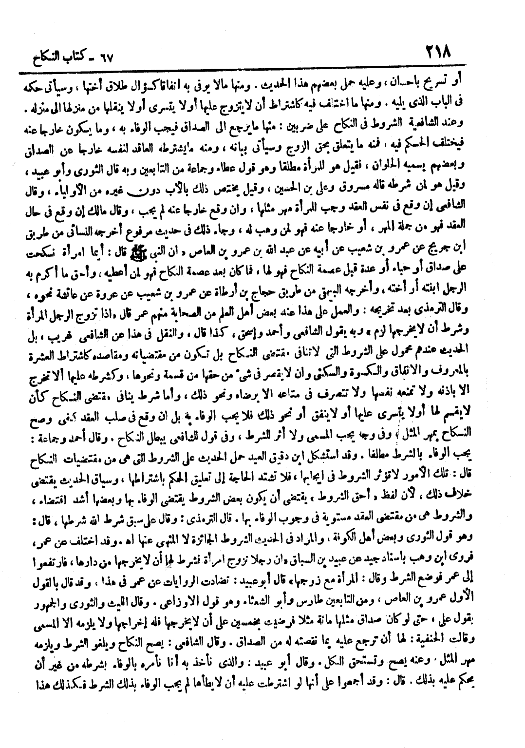 أَوْ تَسْرِيحٍ بِإِحْسَانٍ وَعَلَيْهِ حَمَلَ بَعْضُهُمْ هَذَا الْحَدِيثَ وَمِنْهَا مَا لَا يُوفَى بِهِ اتِّفَاقًا كَسُؤَالِ طَلَاقِ أُخْتِهَا وَسَيَأْتِي حُكْمُهُ فِي الْبَابِ الَّذِي يَلِيهِ وَمِنْهَا مَا اخْتُلِفَ فِيهِ كَاشْتِرَاطِ أَنْ لَا يَتَزَوَّجَ عَلَيْهَا أَوْ لَا يَتَسَرَّى أَوْ لَا يَنْقُلَهَا مِنْ مَنْزِلِهَا إِلَى مَنْزِلِهِ وَعِنْدَ الشَّافِعِيَّةِ الشُّرُوطُ فِي النِّكَاحِ عَلَى ضَرْبَيْنِ مِنْهَا مَا يَرْجِعُ إِلَى الصَّدَاقِ فَيَجِبُ الْوَفَاءُ بِهِ وَمَا يَكُونُ خَارِجًا عَنْهُ فَيَخْتَلِفُ الْحُكْمُ فِيهِ فَمِنْهُ مَا يَتَعَلَّقُ بِحَقِّ الزَّوْجِ وَسَيَأْتِي بَيَانُهُ وَمِنْهُ مَا يَشْتَرِطُهُ الْعَاقِدُ لِنَفْسِهِ خَارِجًا عَنِ الصَّدَاقِ وَبَعْضُهُمْ يُسَمِّيهِ الْحُلْوَانُ فَقِيلَ هُوَ لِلْمَرْأَةِ مُطْلَقًا وَهُوَ قَوْلُ عَطَاءٍ وَجَمَاعَةٍ مِنَ التَّابِعِينَ وَبِهِ قَالَ الثَّوْرِيُّ وَأَبُو عُبَيْدٍ وَقِيلَ هُوَ لِمَنْ شَرَطَهُ قَالَهُ مَسْرُوقٌ وَعَلِيُّ بْنُ الْحُسَيْنِ وَقِيلَ يَخْتَصُّ ذَلِكَ بِالْأَبِ دُونَ غَيْرِهِ من الْأَوْلِيَاء وَقَالَ الشَّافِعِي أَن وَقع فِي نَفْسُ الْعَقْدِ وَجَبَ لِلْمَرْأَةِ مَهْرُ مِثْلِهَا وَإِنْ وَقَعَ خَارِجًا عَنْهُ لَمْ يَجِبْ وَقَالَ مَالِكٌ إِنْ وَقَعَ فِي حَالِ الْعَقْدِ فَهُوَ مِنْ جُمْلَةِ الْمَهْرِ أَوْ خَارِجًا عَنْهُ فَهُوَ لِمَنْ وُهِبَ لَهُ وَجَاءَ ذَلِكَ فِي حَدِيثٍ مَرْفُوعٍ أخرجه النَّسَائِيّ من طَرِيق بن جُرَيْجٍ عَنْ عَمْرِو بْنِ شُعَيْبٍ عَنْ أَبِيهِ عَنْ عَبْدِ اللَّهِ بْنِ عَمْرِو بْنِ الْعَاصِ أَنَّ النَّبِيَّ صَلَّى اللَّهُ عَلَيْهِ وَسَلَّمَ قَالَ أَيُّمَا امْرَأَةٍ نَكَحَتْ عَلَى صَدَاقٍ أَوْ حَيَاءٍ أَوْ عِدَّةٍ قَبْلَ عِصْمَةِ النِّكَاحِ فَهُوَ لَهَا فَمَا كَانَ بَعْدَ عِصْمَةِ النِّكَاحِ فَهُوَ لِمَنْ أُعْطِيَهُ وَأَحَقُّ مَا أَكْرَمَ بِهِ الرَّجُلُ ابْنَتَهُ أَوْ أُخْتَهُ وَأَخْرَجَهُ الْبَيْهَقِيُّ مِنْ طَرِيقِ حَجَّاجِ بْنِ أَرْطَاةَ عَنْ عَمْرِو بْنِ شُعَيْبٍ عَنْ عُرْوَةَ عَنْ عَائِشَةَ نَحْوُهُ وَقَالَ التِّرْمِذِيُّ بَعْدَ تَخْرِيجِهِ وَالْعَمَلُ عَلَى هَذَا عِنْدَ بَعْضِ أَهْلِ الْعِلْمِ مِنَ الصَّحَابَةِ مِنْهُمْ عُمَرُ قَالَ إِذَا تَزَوَّجَ الرَّجُلُ الْمَرْأَةَ وَشَرَطَ أَنْ لَا يُخْرِجَهَا لَزِمَ وَبِهِ يَقُولُ الشَّافِعِيُّ وَأَحْمَدُ وَإِسْحَاقُ كَذَا قَالَ وَالنَّقْلُ فِي هَذَا عَنِ الشَّافِعِيِّ غَرِيبٌ بَلِ الْحَدِيثُ عِنْدَهُمْ مَحْمُولٌ عَلَى الشُّرُوطِ الَّتِي لَا تُنَافِي مُقْتَضَى النِّكَاحِ بَلْ تَكُونُ مِنْ مقتضياته ومقاصده كاشتراط الْعِشْرَةَ بِالْمَعْرُوفِ وَالْإِنْفَاقَ وَالْكِسْوَةَ وَالسُّكْنَى وَأَنْ لَا يُقَصِّرَ فِي شَيْءٍ مِنْ حَقِّهَا مِنْ قِسْمَةٍ وَنَحْوِهَا وَكَشَرْطِهِ عَلَيْهَا أَلَّا تَخْرُجَ إِلَّا بِإِذْنِهِ وَلَا تَمْنَعُهُ نَفْسَهَا وَلَا تَتَصَرَّفُ فِي مَتَاعِهِ إِلَّا بِرِضَاهُ وَنَحْوُ ذَلِكَ وَأَمَّا شَرْطٌ يُنَافِي مُقْتَضَى النِّكَاحِ كَأَنْ لَا يَقْسِمَ لَهَا أَوْ لَا يَتَسَرَّى عَلَيْهَا أَوْ لَا يُنْفِقَ أَوْ نَحْوُ ذَلِكَ فَلَا يَجِبُ الْوَفَاءُ بِهِ بَلْ إِنْ وَقَعَ فِي صُلْبِ الْعَقْدِ كَفَى وَصَحَّ النِّكَاحُ بِمَهْرِ الْمِثْلِ وَفِي وَجْهٍ يَجِبُ الْمُسَمَّى وَلَا أَثَرَ لِلشَّرْطِ وَفِي قَوْلٍ لِلشَّافِعِيِّ يَبْطُلُ النِّكَاحُ وَقَالَ أَحْمَدُ وَجَمَاعَةٌ يَجِبُ الْوَفَاءُ بِالشَّرْطِ مُطلقًا وَقد اسْتشْكل بن دَقِيقِ الْعِيدِ حَمْلَ الْحَدِيثَ عَلَى الشُّرُوطِ الَّتِي هِيَ مِنْ مُقْتَضَيَاتِ النِّكَاحِ قَالَ تِلْكَ الْأُمُورُ لَا تُؤَثِّرُ الشُّرُوطُ فِي إِيجَابِهَا فَلَا تَشْتَدُّ الْحَاج