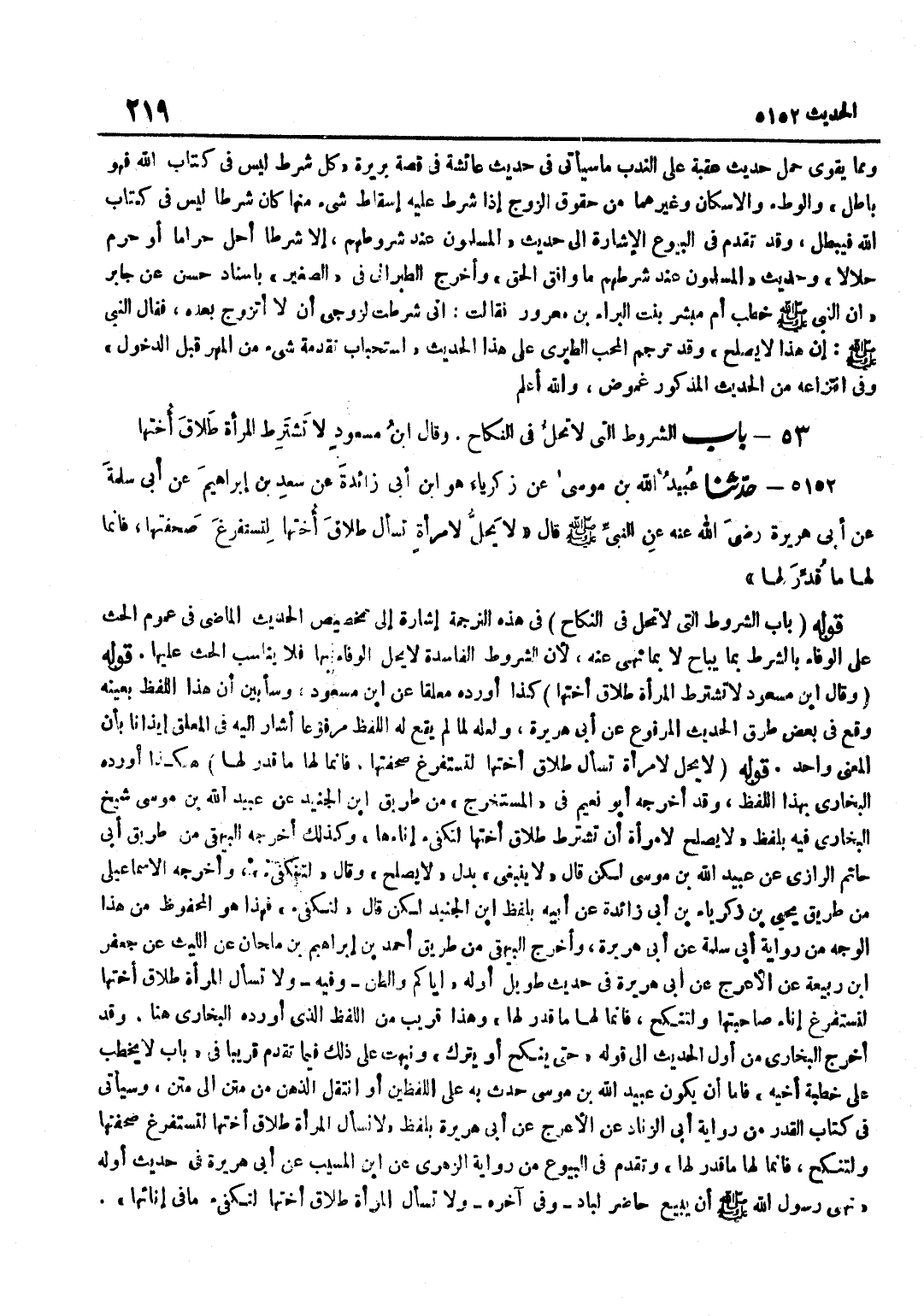 فِي هَذِهِ التَّرْجَمَةِ إِشَارَةٌ إِلَى تَخْصِيصِ الْحَدِيثِ الْمَاضِي فِي عُمُومِ الْحَثِّ عَلَى الْوَفَاءِ بِالشَّرْطِ بِمَا يُبَاحُ لَا بِمَا نَهَى عَنْهُ لِأَنَّ الشُّرُوطَ الْفَاسِدَةَ لَا يَحِلُّ الْوَفَاءُ بِهَا فَلَا يُنَاسب الْحَث عَلَيْهَا قَوْله وَقَالَ بن مَسْعُودٍ لَا تُشْتَرَطُ الْمَرْأَةُ طَلَاقَ أُخْتِهَا كَذَا أوردهُ مُعَلّقا عَن بن مَسْعُودٍ وَسَأُبَيِّنُ أَنَّ هَذَا اللَّفْظَ بِعَيْنِهِ وَقَعَ فِي بَعْضِ طُرُقِ الْحَدِيثِ الْمَرْفُوعِ عَنْ أَبِي هُرَيْرَةَ وَلَعَلَّهُ لَمَّا لَمْ يَقَعْ لَهُ اللَّفْظُ مَرْفُوعًا أَشَارَ إِلَيْهِ فِي الْمُعَلَّقِ إِيذَانًا بِأَنَّ الْمَعْنَى وَاحِدٌ