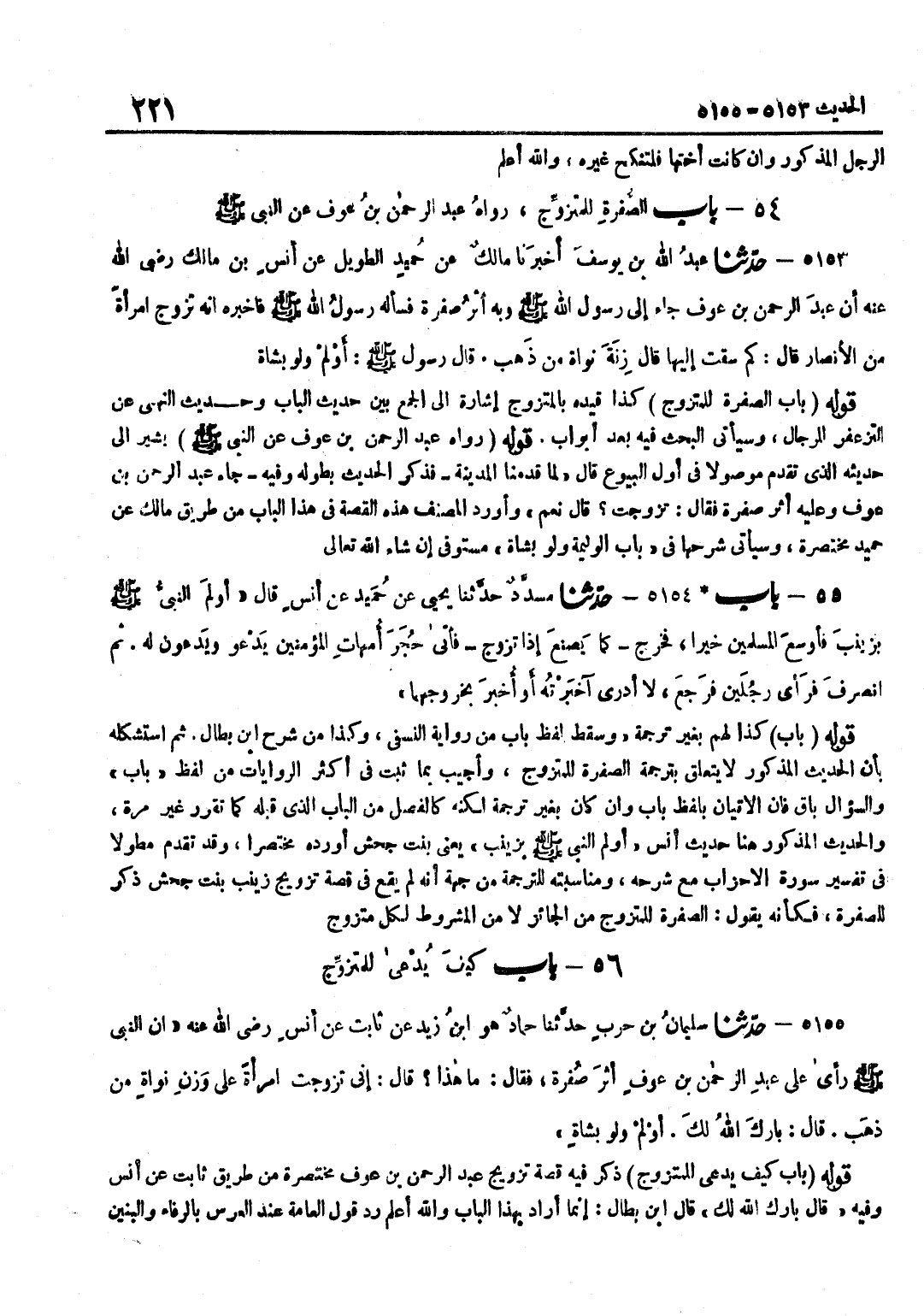 كَذَا قَيَّدَهُ بِالْمُتَزَوِّجِ إِشَارَةٌ إِلَى الْجَمْعِ بَيْنَ حَدِيثِ الْبَابِ وَحَدِيثِ النَّهْيِ عَنِ التَّزَعْفُرِ لِلرِّجَالِ وَسَيَأْتِي الْبَحْثُ فِيهِ بَعْدَ أَبْوَابٍ قَوْلُهُ رَوَاهُ عَبْدُ الرَّحْمَنِ بْنِ عَوْفٍ عَنِ النَّبِيِّ صَلَّى اللَّهُ عَلَيْهِ وَسَلَّمَ يُشِيرُ إِلَى حَدِيثِهِ الَّذِي تَقَدَّمَ مَوْصُولًا فِي أَوَّلِ الْبُيُوعِ قَالَ لَمَّا قَدِمْنَا الْمَدِينَةَ فَذَكَرَ الْحَدِيثَ بِطُولِهِ وَفِيهِ جَاءَ عَبْدُ الرَّحْمَنِ بْنُ عَوْفٍ وَعَلَيْهِ أَثَرُ صُفْرَةٍ فَقَالَ تَزَوَّجْتَ قَالَ نعم وَأورد الْمُصَنِّفُ هَذِهِ الْقِصَّةَ فِي هَذَا الْبَابِ مِنْ طَرِيقِ مَالِكٍ عَنْ حُمَيْدٍ مُخْتَصَرَةً وَسَيَأْتِي شَرْحُهَا فِي بَابِ الْوَلِيمَةِ وَلَوْ بِشَاةٍ مُسْتَوْفًى إِنْ شَاءَ اللَّهُ تَعَالَى قَوْلُهُ بَابُ كَذَا لَهُمْ بِغَيْرِ تَرْجَمَةٍ وَسَقَطَ لَفْظُ بَابٍ مِنْ رِوَايَةِ النَّسَفِيّ وَكَذَا من شرح بن بَطَّالٍ ثُمَّ اسْتَشْكَلَهُ بِأَنَّ الْحَدِيثَ الْمَذْكُورَ لَا يَتَعَلَّقُ بِتَرْجَمَةِ الصُّفْرَةِ لِلْمُتَزَوِّجِ وَأُجِيبَ بِمَا ثَبَتَ فِي أَكْثَرِ الرِّوَايَاتِ مِنْ لَفْظِ بَابٌ وَالسُّؤَالُ بَاقٍ فَإِنَّ الْإِتْيَانَ بِلَفْظِ بَابٌ وَإِنْ كَانَ بِغَيْرِ تَرْجَمَةٍ لَكِنَّهُ كَالْفَصْلِ مِنَ الْبَابِ الَّذِي قَبْلَهُ كَمَا تَقَرَّرَ غَيْرَ مَرَّةٍ وَالْحَدِيثُ الْمَذْكُورُ هُنَا حَدِيثُ أَنَسٍ أَوْلَمَ النَّبِيُّ صَلَّى اللَّهُ عَلَيْهِ وَسَلَّمَ بِزَيْنَبَ يَعْنِي بِنْتَ جَحْشٍ أَوْرَدَهُ مُخْتَصَرًا وَقَدْ تَقَدَّمَ مُطَوَّلًا فِي تَفْسِيرِ سُورَةِ الْأَحْزَابِ مَعَ شَرْحِهِ وَمُنَاسَبَتِهِ لِلتَّرْجَمَةِ مِنْ جِهَةِ أَنَّهُ لَمْ يَقَعُ فِي قِصَّةِ تَزْوِيجِ زَيْنَبَ بِنْتِ جَحْشٍ ذِكْرٌ لِلصُّفْرَةِ فَكَأَنَّهُ يَقُولُ الصُّفْرَةُ لِلْمُتَزَوِّجِ مِنَ الْجَائِزِ لَا مِنَ الْمَشْرُوطِ لِكُلِّ متزوج