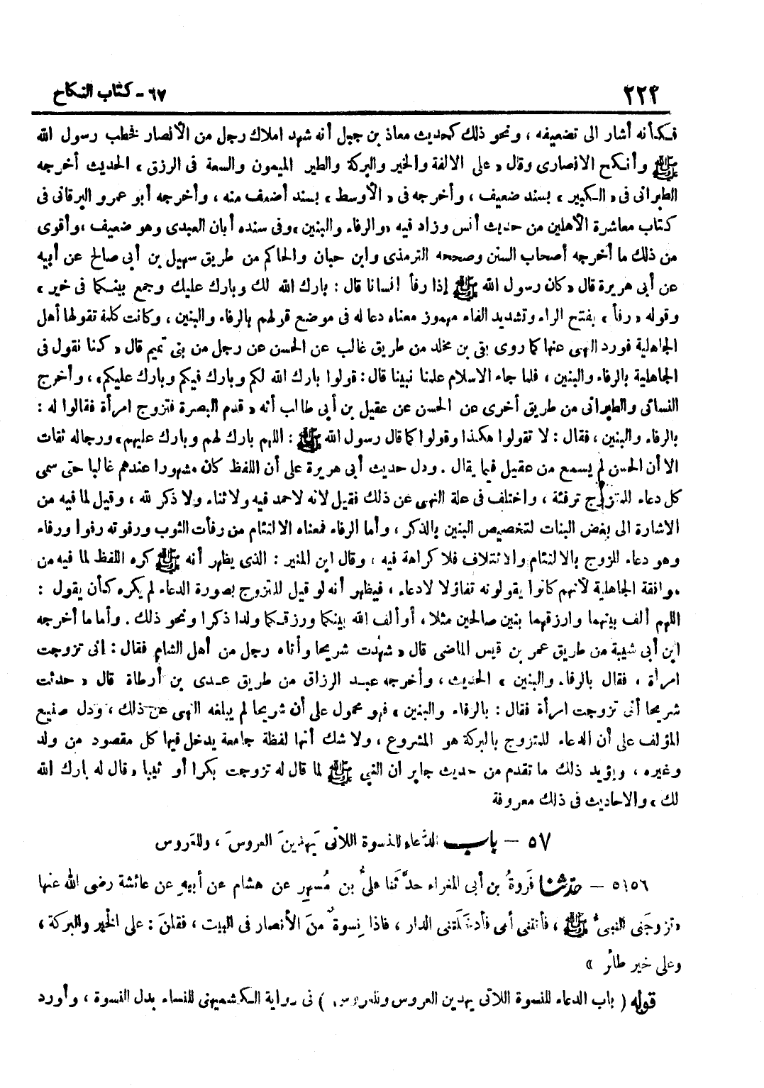 فَكَأَنَّهُ أَشَارَ إِلَى تَضْعِيفِهِ وَنَحْوَ ذَلِكَ كَحَدِيثِ مُعَاذِ بْنِ جَبَلٍ أَنَّهُ شَهِدَ أَمْلَاكَ رَجُلٍ مِنَ الْأَنْصَارِ فَخَطَبَ رَسُولُ اللَّهِ صَلَّى اللَّهُ عَلَيْهِ وَسَلَّمَ وَأَنْكَحَ الْأَنْصَارِيَّ وَقَالَ عَلَى الْأُلْفَةِ وَالْخَيْرِ وَالْبَرَكَةِ وَالطَّيْرِ الْمَيْمُونِ وَالسَّعَةِ فِي الرِّزْقِ الْحَدِيثَ أَخْرَجَهُ الطَّبَرَانِيُّ فِي الْكَبِيرِ بِسَنَدٍ ضَعِيفٍ وَأَخْرَجَهُ فِي الْأَوْسَطِ بِسَنَدٍ أَضْعَفَ مِنْهُ وَأَخْرَجَهُ أَبُو عَمْرٍو الْبَرْقَانِيُّ فِي كِتَابِ مُعَاشَرَةِ الْأَهْلِينَ مِنْ حَدِيثِ أَنَسٍ وَزَادَ فِيهِ وَالرِّفَاءُ وَالْبَنِينَ وَفِي سَنَدِهِ أَبَانٌ الْعَبْدِيُّ وَهُوَ ضَعِيفٌ وَأَقْوَى مِنْ ذَلِكَ مَا أَخْرَجَهُ أَصْحَابُ السُّنَنِ وَصَحَّحَهُ التِّرْمِذِيّ وبن حِبَّانَ وَالْحَاكِمُ مِنْ طَرِيقِ سُهَيْلِ بْنِ أَبِي صَالِحٍ عَنْ أَبِيهِ عَنْ أَبِي هُرَيْرَةَ قَالَ كَانَ رَسُولُ اللَّهِ صَلَّى اللَّهُ عَلَيْهِ وَسَلَّمَ إِذَا رَفَّأَ إِنْسَانًا قَالَ بَارَكَ اللَّهُ لَكَ وَبَارَكَ عَلَيْكَ وَجَمَعَ بَيْنَكُمَا فِي خَيْرٍ وَقَوْلُهُ رَفَّأَ بِفَتْحِ الرَّاءِ وَتَشْدِيدِ الْفَاءِ مَهْمُوزٌ مَعْنَاهُ دَعَا لَهُ فِي مَوْضِعِ قَوْلِهِمْ بِالرِّفَاءِ وَالْبَنِينَ وَكَانَتْ كَلِمَةً تَقُولُهَا أَهْلُ الْجَاهِلِيَّةِ فَوَرَدَ النَّهْيُ عَنْهَا كَمَا رَوَى بَقِيُّ بْنُ مَخْلَدٍ مِنْ طَرِيقِ غَالِبٍ عَنِ الْحَسَنِ عَنْ رَجُلٍ مِنْ بَنِي تَمِيمٍ قَالَ كُنَّا نَقُولُ فِي الْجَاهِلِيَّةِ بِالرِّفَاءِ وَالْبَنِينَ فَلَمَّا جَاءَ الْإِسْلَامُ عَلَّمَنَا نَبِيُّنَا قَالَ قُولُوا بَارَكَ اللَّهُ لَكُمْ وَبَارَكَ فِيكُمْ وَبَارِكْ عَلَيْكُمْ وَأَخْرَجَ النَّسَائِيُّ وَالطَّبَرَانِيُّ مِنْ طَرِيقٍ أُخْرَى عَنِ الْحَسَنِ عَنْ عَقِيلِ بْنِ أَبِي طَالِبٍ أَنَّهُ قَدِمَ الْبَصْرَةَ فَتَزَوَّجَ امْرَأَةً فَقَالُوا لَهُ بِالرِّفَاءِ وَالْبَنِينَ فَقَالَ لَا تَقُولُوا هَكَذَا وَقُولُوا كَمَا قَالَ رَسُولُ اللَّهِ صَلَّى اللَّهُ عَلَيْهِ وَسَلَّمَ اللَّهُمَّ بَارِكْ لَهُمْ وَبَارِكْ عَلَيْهِمْ وَرِجَاله ثِقَات إِلَّا أَن الْحسن لم يسمع مِنْ عَقِيلٍ فِيمَا يُقَالُ وَدَلَّ حَدِيثُ أَبِي هُرَيْرَةَ عَلَى أَنَّ اللَّفْظَ كَانَ مَشْهُورًا عِنْدَهُمْ غَالِبًا حَتَّى سُمِّيَ كُلُّ دُعَاءٍ لِلْمُتَزَوِّجِ تَرْفِئَةً وَاخْتُلِفَ فِي عِلَّةِ النَّهْيِ عَنْ ذَلِكَ فَقِيلَ لِأَنَّهُ لَا حَمْدَ فِيهِ وَلَا ثَنَاءَ وَلَا ذِكْرَ لِلَّهِ وَقِيلَ لِمَا فِيهِ مِنَ الْإِشَارَةِ إِلَى بُغْضِ الْبَنَاتِ لِتَخْصِيصِ الْبَنِينَ بِالذِّكْرِ وَأَمَّا الرِّفَاءُ فَمَعْنَاهُ الِالْتِئَامُ مِنْ رَفَأْتُ الثَّوْبَ وَرَفَوْتُهُ رَفْوًا وَرِفَاءً وَهُوَ دُعَاءٌ لِلزَّوْجِ بِالِالْتِئَامِ وَالِائْتِلَافِ فَلَا كَرَاهَة فِيهِ وَقَالَ بن الْمُنِيرِ الَّذِي يَظْهَرُ أَنَّهُ صَلَّى اللَّهُ عَلَيْهِ وَسَلَّمَ كَرِهَ اللَّفْظَ لِمَا فِيهِ مِنْ مُوَافَقَةِ الْجَاهِلِيَّةِ لِأَنَّهُمْ كَانُوا يَقُولُونَهُ تَفَاؤُلًا لَا دُعَاءً فَيَظْهَرُ أَنَّهُ لَوْ قِيلَ لِلْمُتَزَوِّجِ بِصُورَةٍ الدُّعَاءِ لَمْ يُكْرَهْ كَأَنْ يَقُولُ اللَّهُمَّ أَلِّفْ بَيْنَهُمَا وَارْزُقْهُمَا بَنِينَ صَالِحِينَ مَثَلًا أَوْ أَلَّفَ اللَّهُ بَيْنَكُمَا وَرَزَقَكُمَا وَلَدًا ذَكَرًا وَنَحْوَ ذَلِكَ وَأَمَّا مَا أخرجه بْنُ أَبِي شَيْبَةَ مِنْ طَرِيقِ عُمَرَ بْنِ قَيْسٍ الْمَاضِي قَالَ شَهِدْتُ شُرَيْحًا وَأَتَاهُ رَجُلٌ مِنْ أَهْلِ الشَّامِ فَقَالَ إِنِّي تَزَوَّجْتُ امْرَأَةً فَقَالَ بِالرِّفَاءِ وَالْبَنِينَ الْحَدِيثَ وَأَخْرَجَهُ عَبْدُ الرَّزَّاقِ مِنْ طَرِيقِ عَد