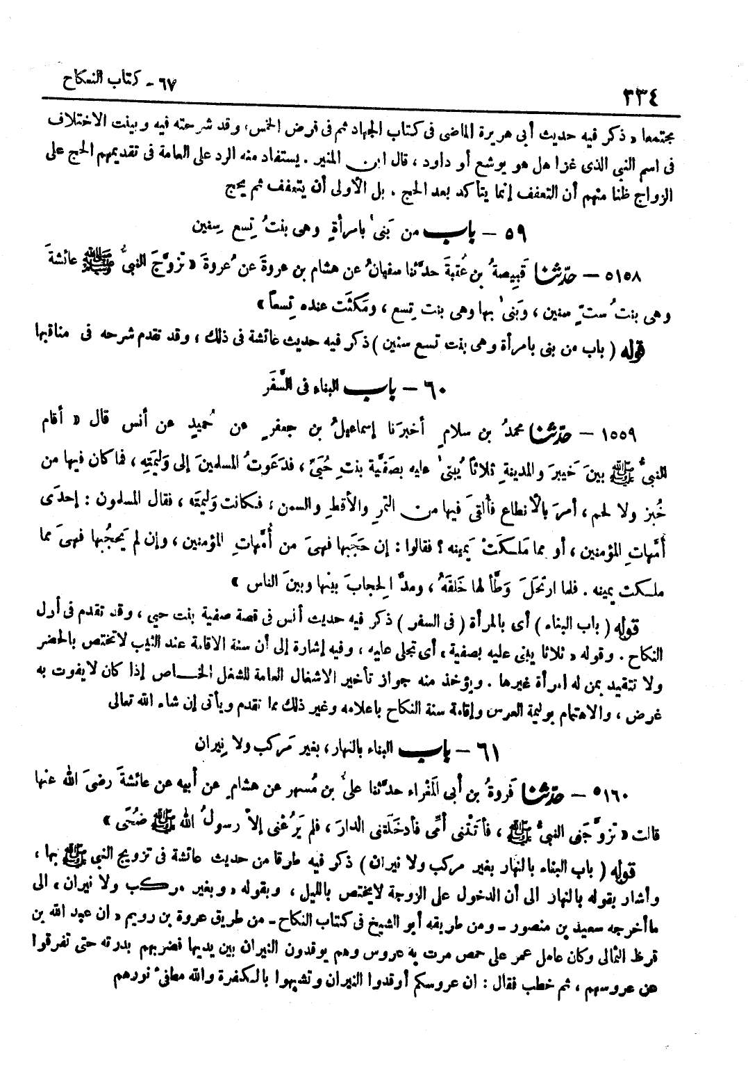 ذكر فِيهِ طرقا من حَدِيث عَائِشَة فِي تَزْوِيجِ النَّبِيِّ صَلَّى اللَّهُ عَلَيْهِ وَسَلَّمَ بِهَا وَأَشَارَ بِقَوْلِهِ بِالنَّهَارِ إِلَى أَنَّ الدُّخُولَ عَلَى الزَّوْجَةِ لَا يَخْتَصُّ بِاللَّيْلِ وَبِقَوْلِهِ وَبِغَيْرِ مَرْكَبٍ وَلَا نِيرَانٍ إِلَى مَا أَخْرَجَهُ سَعِيدُ بْنُ مَنْصُورٍ وَمِنْ طَرِيقِهِ أَبُو الشَّيْخِ فِي كِتَابِ النِّكَاحِ مِنْ طَرِيقِ عُرْوَةَ بْنِ رُوَيْمٍ أَنَّ عَبْدَ اللَّهِ بْنَ قَرَظٍ الثَّمَّالِيَّ وَكَانَ عَامِلَ عُمَرَ عَلَى حِمْصَ مَرَّتْ بِهِ عَرُوسٌ وَهُمْ يُوقِدُونَ النِّيرَانَ بَيْنَ يَدَيْهَا فَضَرَبَهُمْ بِدِرَّتِهِ حَتَّى تَفَرَّقُوا عَنْ عَرُوسِهِمْ ثُمَّ خَطَبَ فَقَالَ إِنَّ عروسكم أوقدوا النيرَان وتشبهوا بالكفرة وَالله مطفيء نورهم