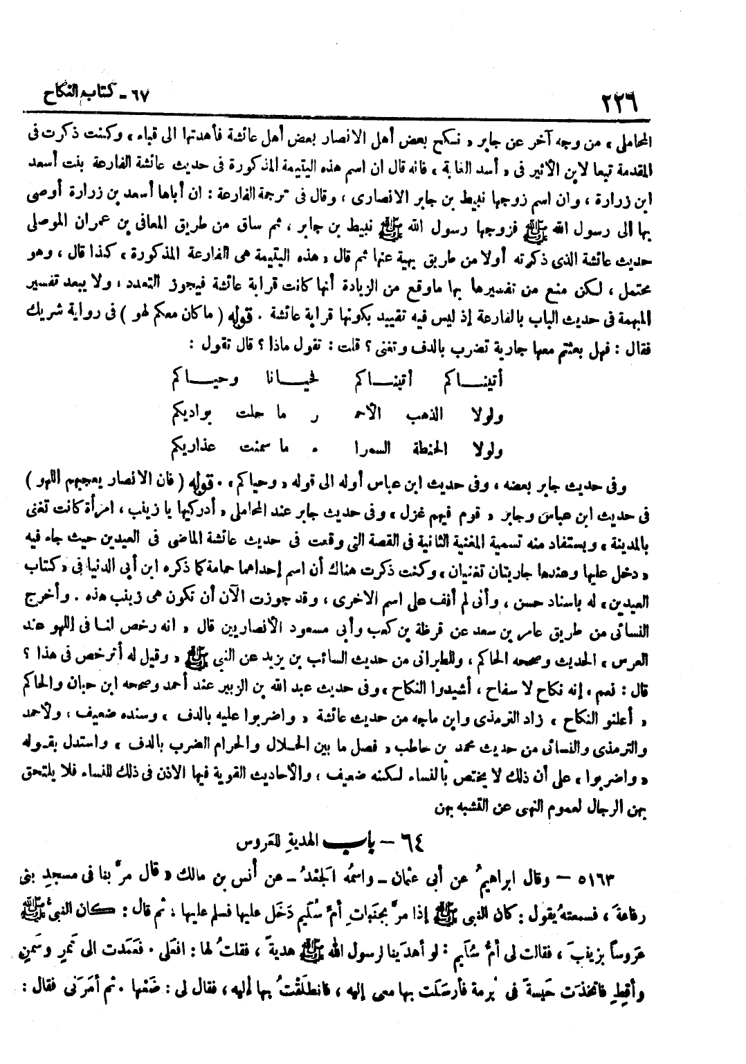 الْمَحَامِلِيِّ مِنْ وَجْهٍ آخَرَ عَنْ جَابِرٍ نَكَحَ بَعْضُ أَهْلِ الْأَنْصَارِ بَعْضَ أَهْلِ عَائِشَةَ فَأَهْدَتْهَا إِلَى قُبَاءٍ وَكُنْتُ ذَكَرْتُ فِي الْمُقَدِّمَةِ تَبَعًا لِابْنِ الْأَثِيرِ فِي أُسْدِ الْغَابَةِ فَإِنَّهُ قَالَ إِنَّ اسْمَ هَذِهِ الْيَتِيمَةِ الْمَذْكُورَةِ فِي حَدِيثِ عَائِشَةَ الْفَارِعَةُ بِنْتُ أَسْعَدَ بْنِ زُرَارَةَ وَأَنَّ اسْمَ زَوْجِهَا نُبَيْطُ بْنُ جَابِرٍ الْأَنْصَارِيُّ وَقَالَ فِي تَرْجَمَةِ الْفَارِعَةِ أَنَّ أَبَاهَا أَسْعَدَ بْنَ زُرَارَةَ أَوْصَى بِهَا إِلَى رَسُولِ اللَّهِ صَلَّى اللَّهُ عَلَيْهِ وَسَلَّمَ فَزَوَّجَهَا رَسُولُ اللَّهِ صَلَّى اللَّهُ عَلَيْهِ وَسَلَّمَ نُبَيْطَ بْنَ جَابِرٍ ثُمَّ سَاق من طَرِيق الْمعَافى بْنِ عِمْرَانَ الْمَوْصِلِيِّ حَدِيثَ عَائِشَةَ الَّذِي ذَكَرْتُهُ أَوَّلًا مِنْ طَرِيقِ بَهِيَّةَ عَنْهَا ثُمَّ قَالَ هَذِهِ الْيَتِيمَةُ هِيَ الْفَارِعَةُ الْمَذْكُورَةُ كَذَا قَالَ وَهُوَ مُحْتَمِلٌ لَكِنْ مَنَعَ مِنْ تَفْسِيرِهَا بِهَا مَا وَقَعَ مِنَ الزِّيَادَةِ أَنَّهَا كَانَتْ قَرَابَةَ عَائِشَةَ فَيَجُوزُ التَّعَدُّدُ وَلَا يَبْعُدُ تَفْسِيرُ الْمُبْهَمَةِ فِي حَدِيثِ الْبَابِ بِالْفَارِعَةِ إِذْ لَيْسَ فِيهِ تَقْيِيدٌ بِكَوْنِهَا قَرَابَةَ عَائِشَةَ قَوْلُهُ مَا كَانَ مَعَكُمْ لَهْوٌ فِي رِوَايَةِ شَرِيكٍ فَقَالَ فَهَلْ بَعَثْتُمْ مَعَهَا جَارِيَةً تَضْرِبُ بِالدُّفِّ وَتُغَنِّي قُلْتُ تَقُولُ مَاذَا قَالَ تَقُولُ أَتَيْنَاكُمْ أَتَيْنَاكُمْ فَحَيَّانَا وحياكم وَلَوْلَا الذَّهَب الْأَحْمَر مَا حلت بواديكم وَلَوْلَا الْحِنْطَة السمراء مَا سَمِنَتْ عَذَارِيكُمْ وَفِي حَدِيثِ جَابِرٍ بَعْضُهُ وَفِي حَدِيث بن عَبَّاسٍ أَوَّلُهُ إِلَى قَوْلِهِ وَحَيَّاكُمْ قَوْلُهُ فَإِنَّ الْأَنْصَار يعجبهم اللَّهْو فِي حَدِيث بن عَبَّاسٍ وَجَابِرٍ قَوْمٌ فِيهِمْ غَزَلٌ وَفِي حَدِيثِ جَابِرٍ عِنْدَ الْمَحَامِلِيِّ أَدْرِكِيهَا يَا زَيْنَبُ امْرَأَةٌ كَانَتْ تُغَنِّي بِالْمَدِينَةِ وَيُسْتَفَادُ مِنْهُ تَسْمِيَةُ الْمُغَنِّيَةِ الثَّانِيَةِ فِي الْقِصَّةِ الَّتِي وَقَعَتْ فِي حَدِيثِ عَائِشَةَ الْمَاضِي فِي الْعِيدَيْنِ حَيْثُ جَاءَ فِيهِ دَخَلَ عَلَيْهَا وَعِنْدَهَا جَارِيَتَانِ تُغَنَّيَانِ وَكُنْتُ ذَكَرْتُ هُنَاكَ أَنَّ اسْمَ إِحْدَاهُمَا حَمَامَةُ كَمَا ذَكَرَهُ بن أَبِي الدُّنْيَا فِي كِتَابِ الْعِيدَيْنِ لَهُ بِإِسْنَادٍ حَسَنٍ وَأَنِّي لَمْ أَقِفْ عَلَى اسْمِ الْأُخْرَى وَقَدْ جَوَّزْتُ الْآنَ أَنْ تَكُونَ هِيَ زَيْنَبَ هَذِهِ وَأَخْرَجَ النَّسَائِيُّ مِنْ طَرِيقِ عَامِرِ بْنِ سَعْدٍ عَنْ قَرَظَةَ بْنِ كَعْبٍ وَأَبِي مَسْعُودٍ الْأَنْصَارِيَّيْنِ قَالَ أَنَّهُ رَخَّصَ لَنَا فِي اللَّهْوِ عِنْدَ الْعُرْسِ الْحَدِيثَ وَصَحَّحَهُ الْحَاكِمُ وَلِلطَّبَرَانِيِّ مِنْ حَدِيثِ السَّائِبِ بْنُ يَزِيدَ عَنِ النَّبِيِّ صَلَّى اللَّهُ عَلَيْهِ وَسَلَّمَ وَقِيلَ لَهُ أَتُرَخِّصُ فِي هَذَا قَالَ نَعَمْ إِنَّهُ نِكَاحٌ لَا سِفَاحٌ أَشِيدُوا النِّكَاحَ وَفِي حَدِيثِ عَبْدِ اللَّهِ بْنِ الزبير عِنْد احْمَد وَصَححهُ بن حبَان وَالْحَاكِم أعْلنُوا النِّكَاح زَاد التِّرْمِذِيّ وبن مَاجَهْ مِنْ حَدِيثِ عَائِشَةَ وَاضْرِبُوا عَلَيْهِ بِالدُّفِّ وَسَنَدُهُ ضَعِيفٌ وَلِأَحْمَدَ وَالتِّرْمِذِيِّ وَالنَّسَائِيِّ مِنْ حَدِيثِ مُحَمَّدِ بْنِ حَاطِبٍ فَصْلُ مَا بَيْنَ الْحَلَالِ وَالْحَرَامِ الضَّرْبُ بِالدُّفِّ وَاسْتُدِلَّ بِقَوْلِهِ وَاضْرِبُوا عَلَى أَنَّ ذَلِكَ لَا يَخْتَصُّ بِالنِّسَاءِ لَكِنَّهُ ضَعِيفٌ وَالْأَحَادِيثُ الْقَوِيَّةُ فِيهَا الْإِذْنُ فِي ذَلِكَ لِلنِّسَاءِ فَلَا يَلْتَحِقُ بِهِنَّ ال