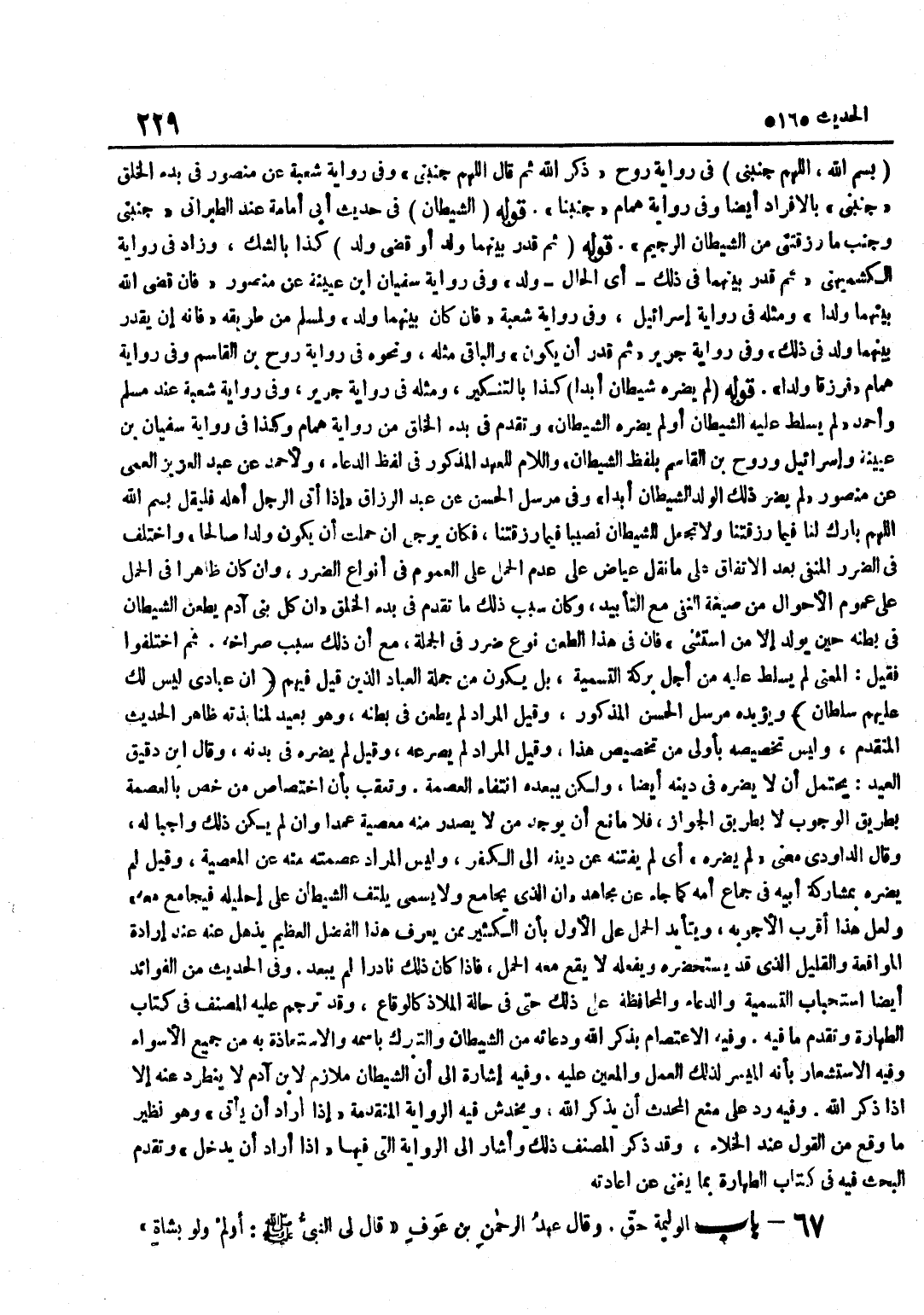 بِسْمِ اللَّهِ اللَّهُمَّ جَنِّبْنِي فِي رِوَايَةِ رَوْحٍ ذَكَرَ اللَّهَ ثُمَّ قَالَ اللَّهُمَّ جَنِّبْنِي وَفِي رِوَايَةِ شُعْبَةَ عَنْ مَنْصُورٍ فِي بَدْءِ الْخَلْقِ جَنِّبْنِي بِالْإِفْرَادِ أَيْضًا وَفِي رِوَايَةِ هَمَّامٍ جَنِّبْنَا قَوْلُهُ الشَّيْطَانُ فِي حَدِيثِ أَبِي أُمَامَةَ عِنْدَ الطَّبَرَانِيِّ جَنِّبْنِي وَجَنِّبْ مَا رَزَقْتَنِي مِنَ الشَّيْطَانِ الرَّجِيمِ قَوْلُهُ ثُمَّ قُدِّرَ بَيْنَهُمَا وَلَدٌ أَوْ قُضِيَ وَلَدٌ كَذَا بِالشَّكِّ وَزَادَ فِي رِوَايَةِ الْكُشْمِيهَنِيِّ ثُمَّ قُدِّرَ بَيْنُهَمَا فِي ذَلِكَ أَيِ الْحَالِ وَلَدٌ وَفِي رِوَايَةِ سُفْيَانَ بْنِ عُيَيْنَةَ عَنْ مَنْصُورٍ فَإِنْ قَضَى اللَّهُ بَيْنَهُمَا وَلَدًا وَمِثْلُهُ فِي رِوَايَةِ إِسْرَائِيلَ وَفِي رِوَايَةِ شُعْبَةَ فَإِنْ كَانَ بَيْنَهُمَا وَلَدٌ وَلِمُسْلِمٍ مِنْ طَرِيقِهِ فَإِنَّهُ إِنْ يُقَدَّرْ بَيْنَهُمَا وَلَدٌ فِي ذَلِكَ وَفِي رِوَايَةِ جَرِيرٍ ثُمَّ قُدِّرَ أَنْ يَكُونَ وَالْبَاقِي مِثْلُهُ وَنَحْوُهُ فِي رِوَايَةِ رَوْحِ بْنِ الْقَاسِمِ وَفِي رِوَايَةِ هَمَّامٍ فَرُزِقَا وَلَدًا قَوْلُهُ لَمْ يَضُرَّهُ شَيْطَانٌ أَبَدًا كَذَا بِالتَّنْكِيرِ وَمِثْلُهُ فِي رِوَايَةِ جَرِيرٍ وَفِي رِوَايَةِ شُعْبَةَ عِنْدَ مُسْلِمٍ وَأَحْمَدَ لَمْ يُسَلَّطْ عَلَيْهِ الشَّيْطَانُ أَوْ لَمْ يَضُرَّهُ الشَّيْطَانُ وَتَقَدَّمَ فِي بَدْءِ الْخَلْقِ مِنْ رِوَايَةِ هَمَّامٍ وَكَذَا فِي رِوَايَةِ سُفْيَانَ بْنِ عُيَيْنَةَ وَإِسْرَائِيلَ وَرَوْحِ بْنِ الْقَاسِمِ بِلَفْظِ الشَّيْطَانِ وَاللَّامُ لِلْعَهْدِ الْمَذْكُورِ فِي لَفْظِ الدُّعَاءِ وَلِأَحْمَدَ عَنْ عَبْدِ الْعَزِيزِ الْعُمِّيِّ عَنْ مَنْصُورٍ لَمْ يَضُرَّ ذَلِكَ الْوَلَدَ الشَّيْطَانُ أَبَدًا وَفِي مُرْسَلِ الْحَسَنِ عَنْ عَبْدِ الرَّزَّاقِ إِذَا أَتَى الرَّجُلُ أَهْلَهُ فَلْيَقُلْ بِسْمِ اللَّهِ اللَّهُمَّ بَارِكْ لَنَا فِيمَا رَزَقَتْنَا وَلَا تَجْعَلْ لِلشَّيْطَانِ نَصِيبًا فِيمَا رَزَقْتَنَا فَكَانَ يُرْجَى إِنْ حَمَلَتْ أَنْ يَكُونَ وَلَدًا صَالِحًا وَاخْتُلِفَ فِي الضَّرَرِ الْمَنْفِيِّ بَعْدَ الِاتِّفَاقِ عَلَى مَا نَقَلَ عِيَاضٌ عَلَى عَدَمِ الْحَمْلِ عَلَى الْعُمُومِ فِي أَنْوَاعِ الضَّرَرِ وَإِنْ كَانَ ظَاهِرًا فِي الْحَمْلِ عَلَى عُمُومِ الْأَحْوَالِ مِنْ صِيغَةِ النَّفْيِ مَعَ التَّأْبِيدِ وَكَانَ سَبَبُ ذَلِكَ مَا تَقَدَّمَ فِي بَدْءِ الْخَلْقِ إِنَّ كُلَّ بَنِي آدَمَ يَطْعَنُ الشَّيْطَانُ فِي بَطْنِهِ حِينَ يُولَدُ إِلَّا مَنِ اسْتَثْنَى فَإِنَّ فِي هَذَا الطَّعْنِ نَوْعَ ضَرَرٍ فِي الْجُمْلَةِ مَعَ أَنَّ ذَلِكَ سَبَبُ صُرَاخِهِ ثُمَّ اخْتَلَفُوا فَقِيلَ الْمَعْنَى لَمْ يُسَلَّطْ عَلَيْهِ مِنْ أَجْلِ بَرَكَةِ التَّسْمِيَةِ بَلْ يَكُونُ مِنْ جُمْلَةِ الْعِبَادِ الَّذِينَ قِيلَ فِيهِمْ إِنَّ عِبَادِي لَيْسَ لَكَ عَلَيْهِمْ سُلْطَانٌ وَيُؤَيِّدُهُ مُرْسَلُ الْحَسَنِ الْمَذْكُورُ وَقِيلَ الْمُرَادُ لَمْ يُطَعْنَ فِي بَطْنِهِ وَهُوَ بَعِيدٌ لِمُنَابَذَتِهِ ظَاهِرَ الْحَدِيثِ الْمُتَقَدِّمِ وَلَيْسَ تَخْصِيصُهُ بِأَوْلَى مِنْ تَخْصِيصِ هَذَا وَقِيلَ الْمُرَادُ لَمْ يَصْرَعْهُ وَقِيلَ لَمْ يضرّهُ فِي بدنه وَقَالَ بن دَقِيقِ الْعِيدِ يَحْتَمِلُ أَنْ لَا يَضُرَّهُ فِي دِينِهِ أَيْضًا وَلَكِنْ يُبْعِدُهُ انْتِفَاءُ الْعِصْمَةِ وَتُعُقِّبَ بِأَنَّ اخْتِصَاصَ مَنْ خُصَّ بِالْعِصْمَةِ بِطَرِيقِ الْوُجُوبِ لَا بِطَرِيقِ الْجَوَازِ فَلَا مَانِعَ أَنْ يُوجَدَ مَنْ لَا يَصْدُرُ مِنْهُ مَعْصِيَةٌ عَمْدًا وَإِنْ لَمْ يَكُنْ ذَلِكَ وَاجِبًا لَهُ وَقَالَ الدَّاوُدِيُّ مَعْنَى لَمْ يَضُرَّهُ أَيْ لَمْ يَفْتِنْهُ 