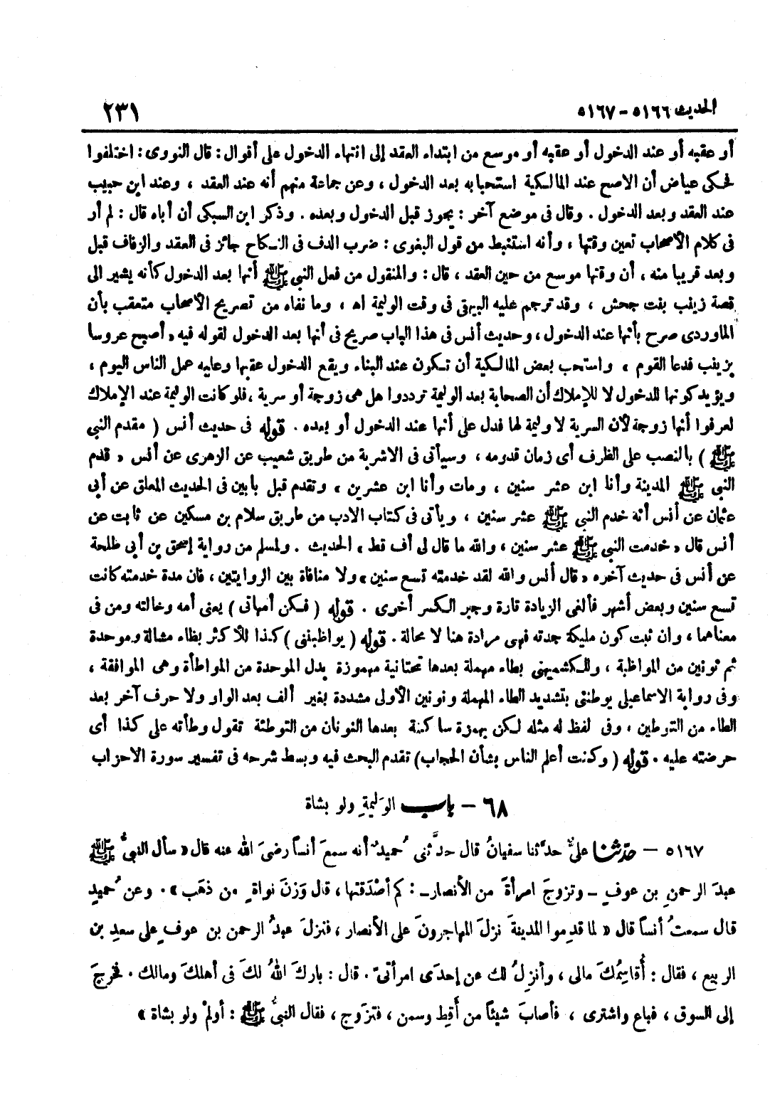 أَوْ عَقِبِهِ أَوْ عِنْدَ الدُّخُولِ أَوْ عَقِبِهِ أَوْ مُوَسَّعٌ مِنِ ابْتِدَاءِ الْعَقْدِ إِلَى انْتِهَاءِ الدُّخُولِ عَلَى أَقْوَالٍ قَالَ النَّوَوِيُّ اخْتَلَفُوا فَحَكَى عِيَاضٌ أَنَّ الْأَصَحَّ عِنْدَ الْمَالِكِيَّةِ اسْتِحْبَابُهُ بَعْدَ الدُّخُولِ وَعَنْ جَمَاعَةٍ مِنْهُمْ أَنَّهُ عِنْدَ الْعَقْدِ وَعند بن حبيب عِنْد العقد وَبعد الدُّخُول وَقَالَ فِي مَوْضِعٌ آخَرُ يَجُوزُ قَبْلَ الدُّخُولِ وَبَعْدَهُ وَذَكَرَ بن السُّبْكِيِّ أَنَّ أَبَاهُ قَالَ لَمْ أَرَ فِي كَلَامِ الْأَصْحَابِ تَعَيُّنَ وَقْتِهَا وَأَنَّهُ اسْتَنْبَطَ مِنْ قَوْلِ الْبَغَوِيِّ ضَرْبُ الدُّفِّ فِي النِّكَاحِ جَائِزٌ فِي الْعَقْدِ وَالزِّفَافِ قَبْلُ وَبَعْدُ قَرِيبًا مِنْهُ أَنَّ وَقْتَهَا مُوَسَّعٌ مِنْ حِينِ الْعَقْدِ قَالَ وَالْمَنْقُولُ مِنْ فِعْلِ النَّبِيِّ صَلَّى اللَّهُ عَلَيْهِ وَسَلَّمَ أَنَّهَا بَعْدَ الدُّخُولِ كَأَنَّهُ يُشِيرُ إِلَى قِصَّةِ زَيْنَبَ بِنْتِ جَحْشٍ وَقَدْ تَرْجَمَ عَلَيْهِ الْبَيْهَقِيُّ فِي وَقْتِ الْوَلِيمَةِ اه وَمَا نَفَاهُ مِنْ تَصْرِيحِ الْأَصْحَابِ مُتَعَقَّبٌ بِأَنَّ الْمَاوَرْدِيَّ صَرَّحَ بِأَنَّهَا عِنْدَ الدُّخُولِ وَحَدِيثُ أَنَسٍ فِي هَذَا الْبَابِ صَرِيحٌ فِي أَنَّهَا بَعْدَ الدُّخُولِ لِقَوْلِهِ فِيهِ أَصْبَحَ عَرُوسًا بِزَيْنَبَ فَدَعَا الْقَوْمَ وَاسْتَحَبَّ بَعْضُ الْمَالِكِيَّةِ أَنْ تَكُونَ عِنْدَ الْبِنَاءِ وَيَقَعُ الدُّخُولُ عَقِبَهَا وَعَلَيْهِ عَمَلُ النَّاسِ الْيَوْمَ وَيُؤَيِّدُ كَوْنَهَا لِلدُّخُولِ لَا لِلْإِمْلَاكِ أَنَّ الصَّحَابَةَ بَعْدَ الْوَلِيمَةِ تَرَدَّدُوا هَلْ هِيَ زَوْجَةٌ أَوْ سُرِّيَّةٌ فَلَوْ كَانَتِ الْوَلِيمَةُ عِنْدَ الْإِمْلَاكِ لَعَرَفُوا أَنَّهَا زَوْجَةٌ لِأَنَّ السُّرِّيَّةَ لَا وَلِيمَةَ لَهَا فَدَلَّ عَلَى أَنَّهَا عِنْدَ الدُّخُولِ أَوْ بَعْدَهُ